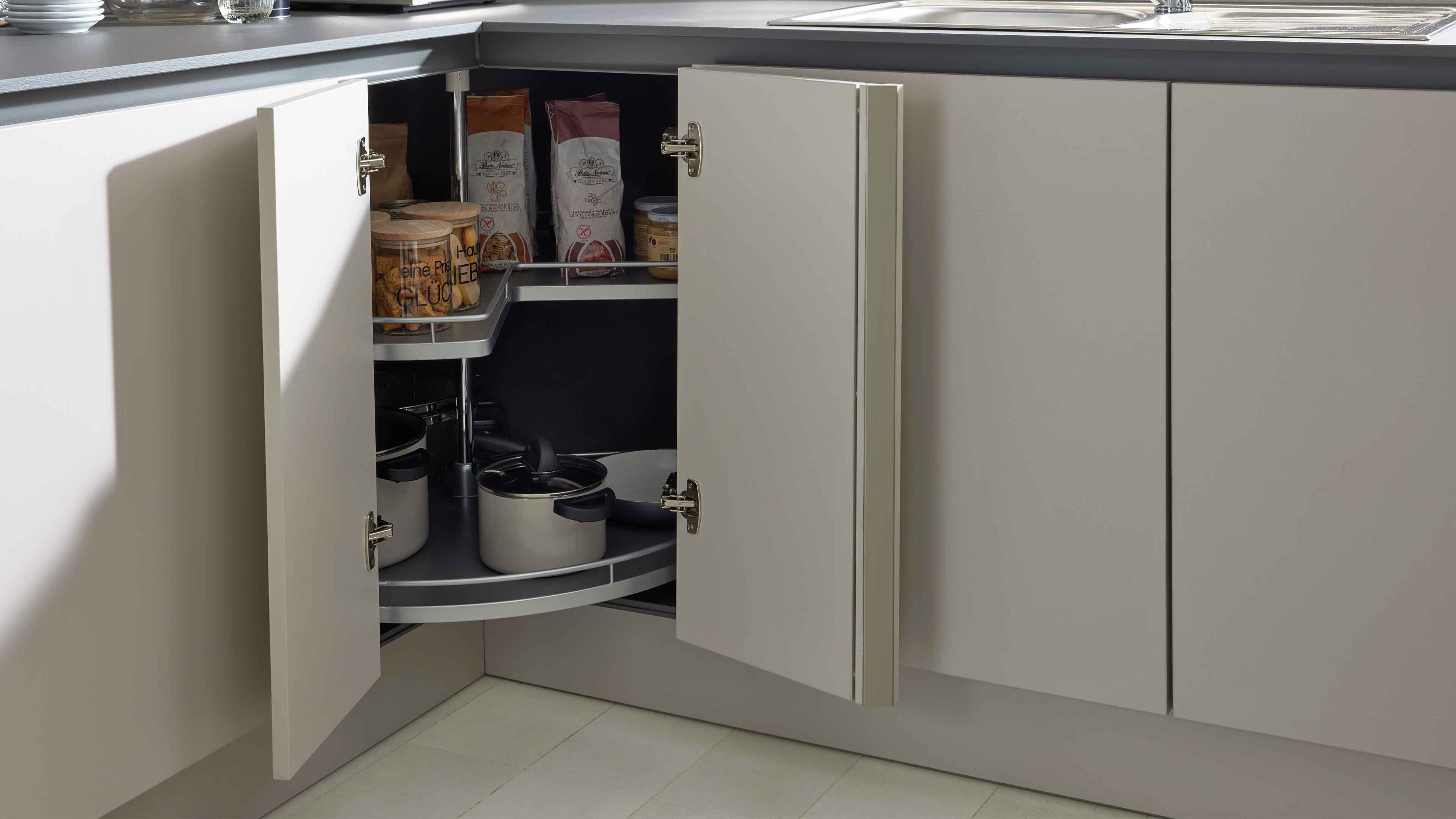 Neben der ansprechenden Optik überzeugt die Küche durch ihre funktionale Gestaltung. Regalböden, Unterschränke mit Auszügen und Drehtüren, ein praktisches Karussell sowie der großzügig geplante Kochbereich bieten dir jede Menge Stauraum für Lebensmittel, Geschirr und Küchenutensilien. Die Stellfläche beträgt ca. 275 x 309 cm (TxL, von links nach rechts), während die Schenkelmaße ca. 275 x 309 x 190 cm (TxLxT, von links nach rechts) umfassen.