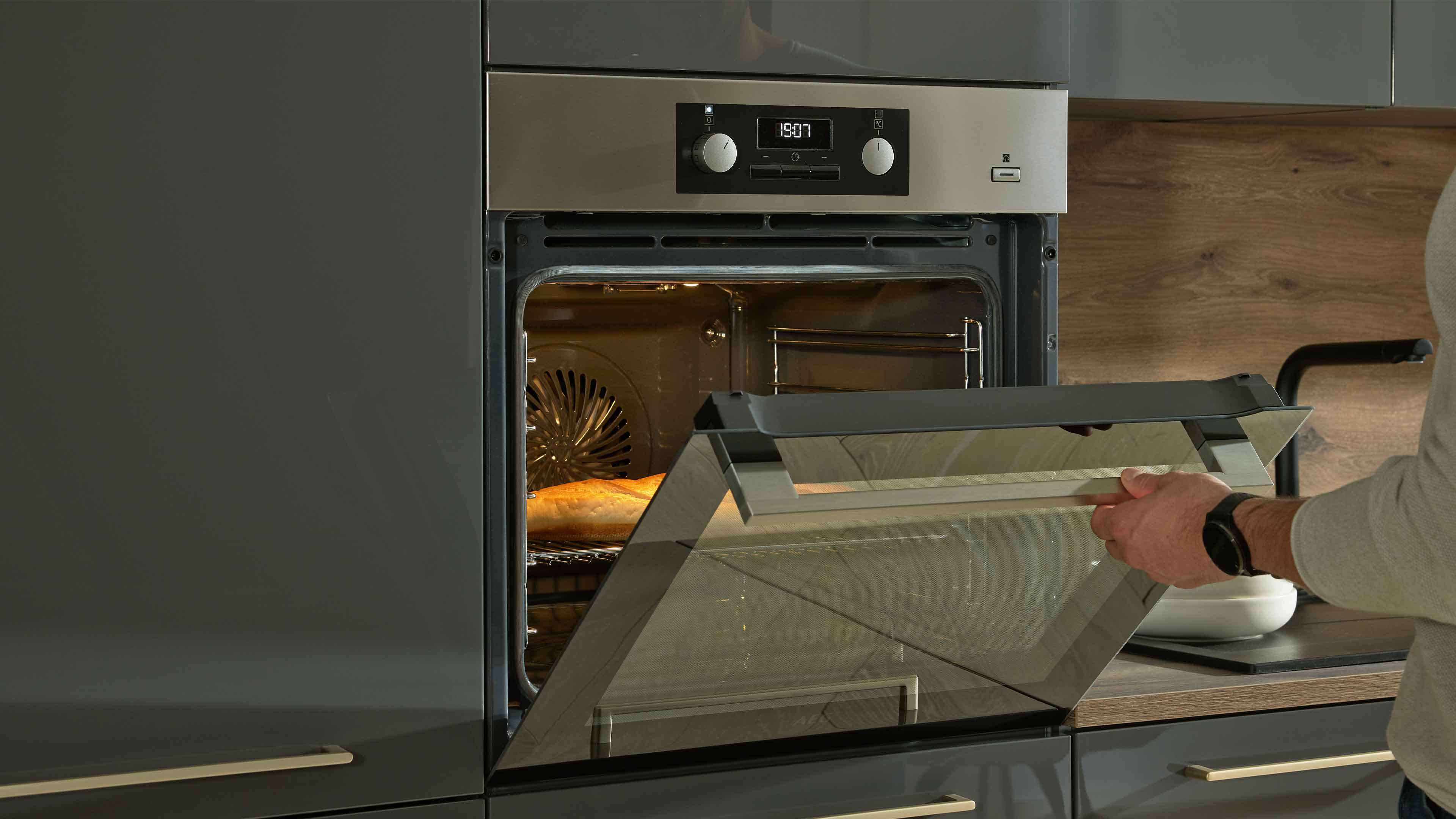 Interliving Küche Serie 3061 – moderne Hochglanzküche in Graphit mit AEG-Einbaugeräten