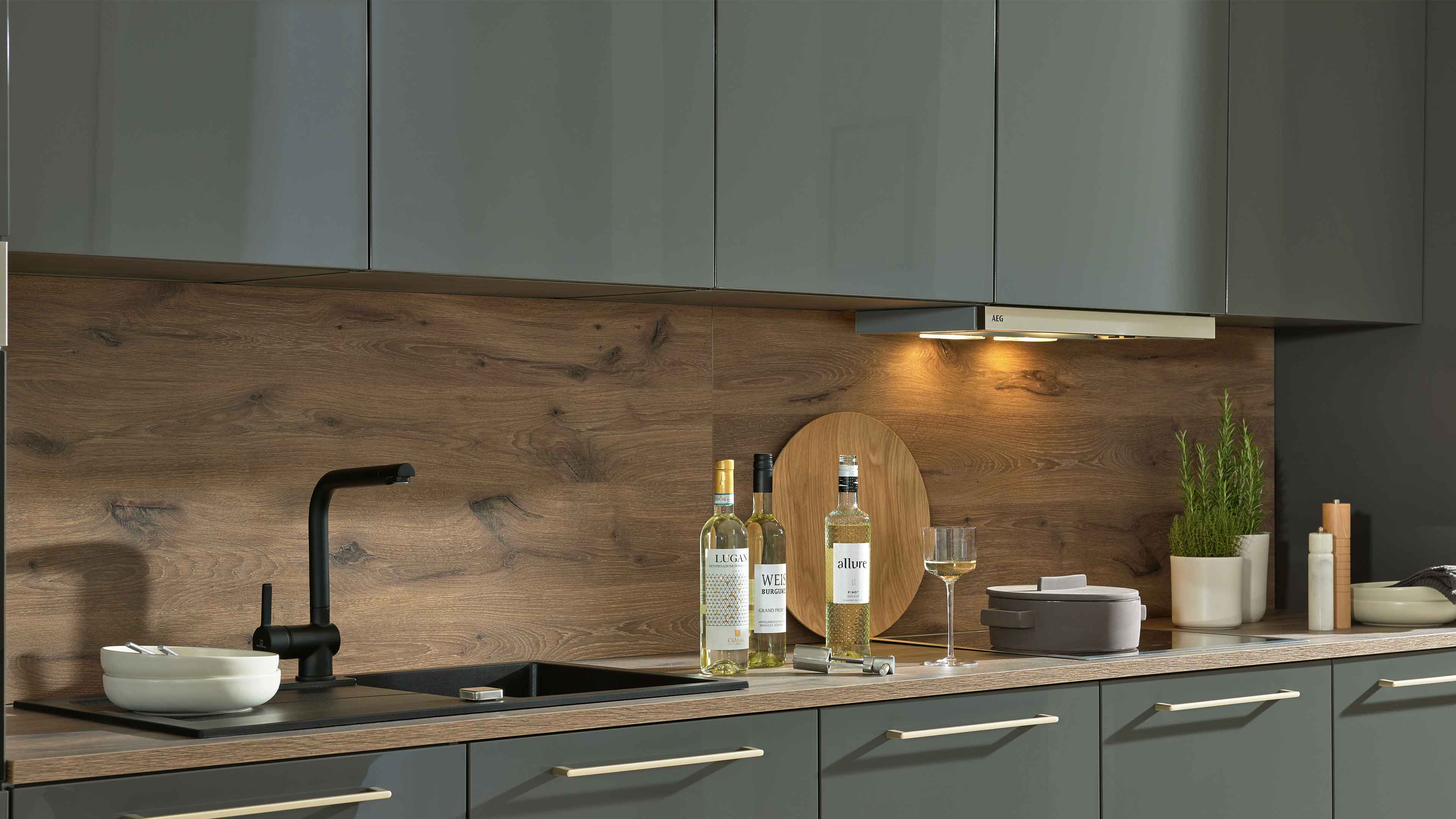 Die Interliving Küche Serie 3061 kombiniert graphitfarbene Hochglanzfronten mit warmen Akzenten in Castell-Eiche-Nachbildung. Ein graphitfarbener Korpus, glänzende graphitfarbene Sockelblenden und manganbronzefarbene Griffleisten runden das harmonische Gesamtbild ab. Besonders eindrucksvoll wirkt die holzfarbene Nischenverkleidung, die der Küche eine elegante und natürliche Note verleiht.