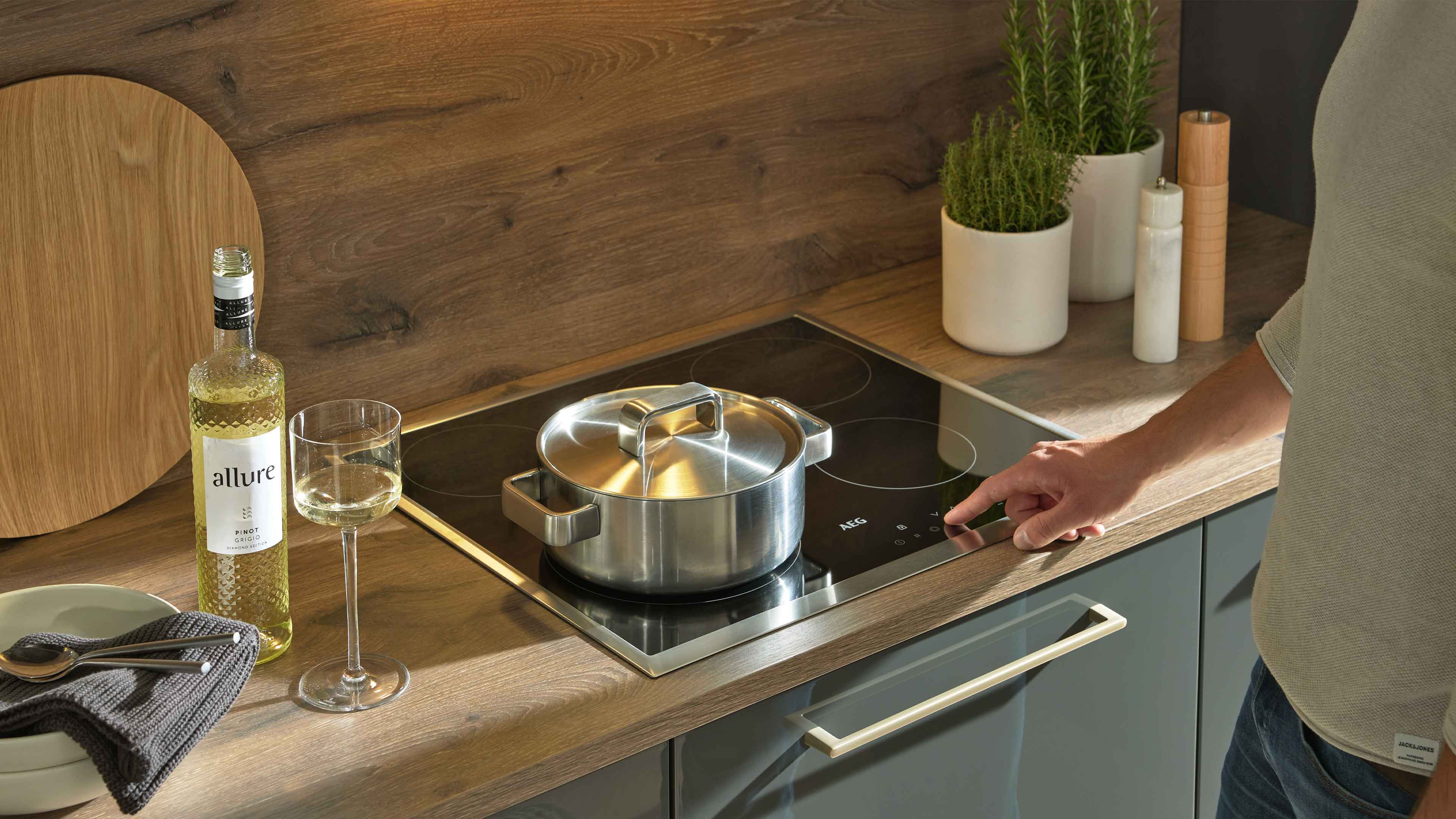 Zur Ausstattung gehören mehrere leistungsstarke Geräte von AEG. Die Kühl-/Gefrierkombination SD18ES überzeugt mit ca. 178 cm Nischenhöhe, einem Fassungsvermögen von ca. 268 Litern und Energieeffizienzklasse E (Spektrum A bis G). Ergänzt wird sie durch das Glaskeramik-Kochfeld HD6460K mit ca. 60 cm Breite, den Steambake-Backofen BD31M mit ca. 60 cm Breite und Energieeffizienzklasse A++ (Spektrum A+++ bis D) sowie die Flachschirmhaube DPB3622S mit ca. 60 cm Breite und Energieeffizienzklasse C (Spektrum A+++ bis D). Zusätzlich sind eine mattschwarze Einbauspüle und eine passende Einhebel-Mischbatterie enthalten.