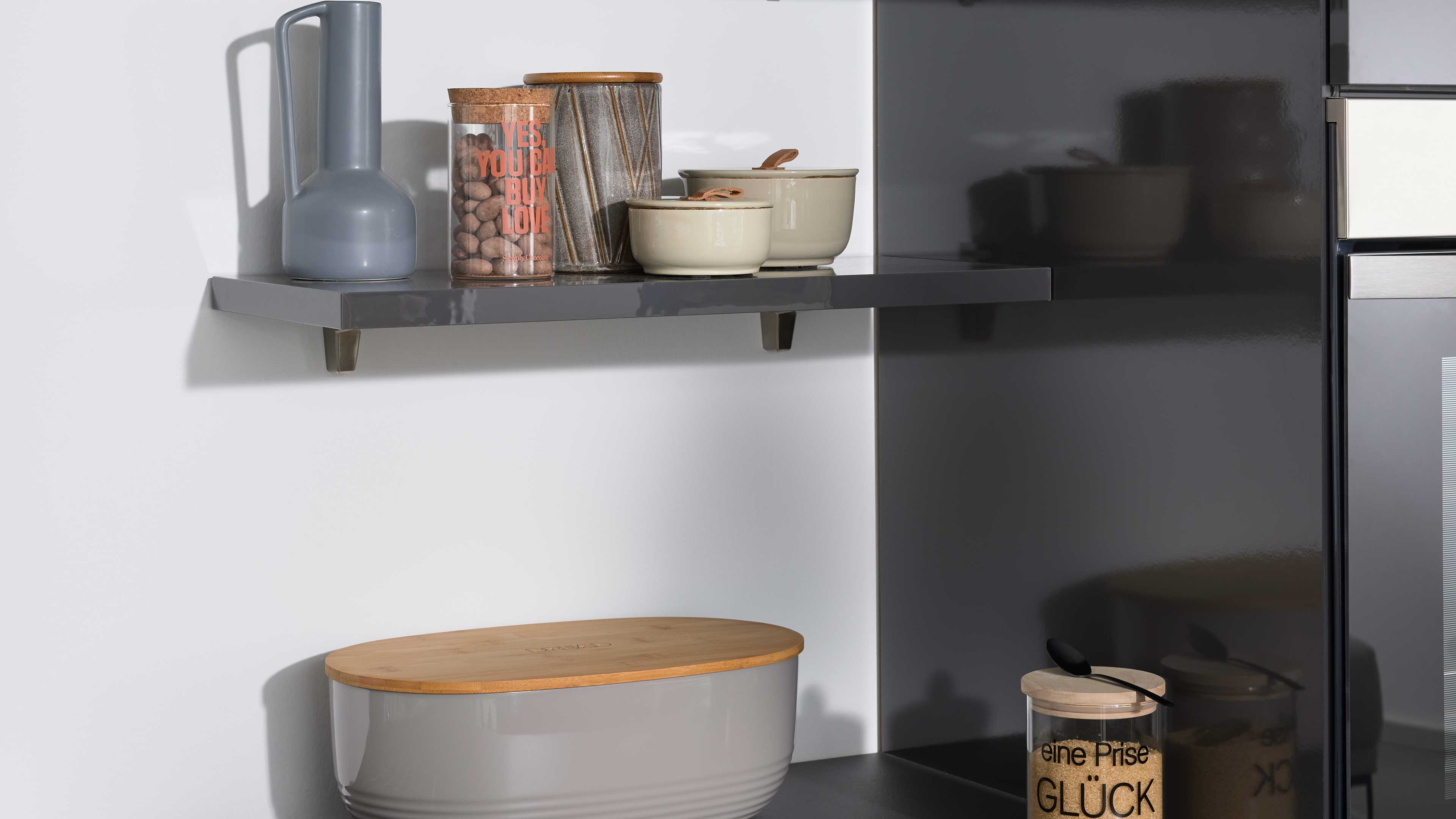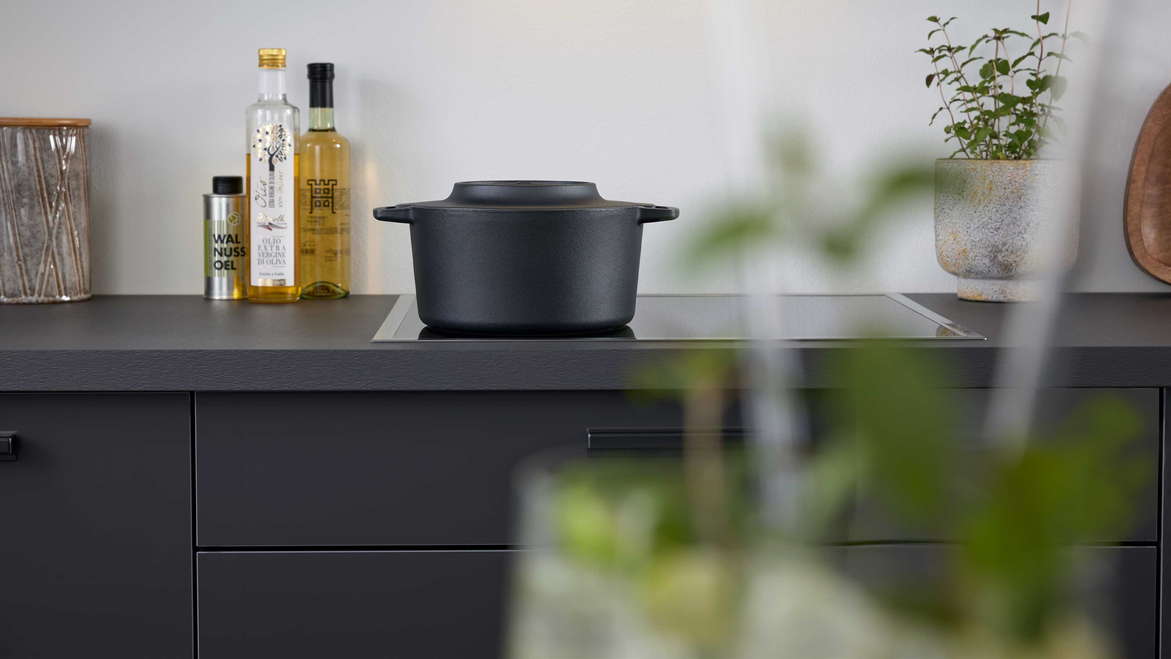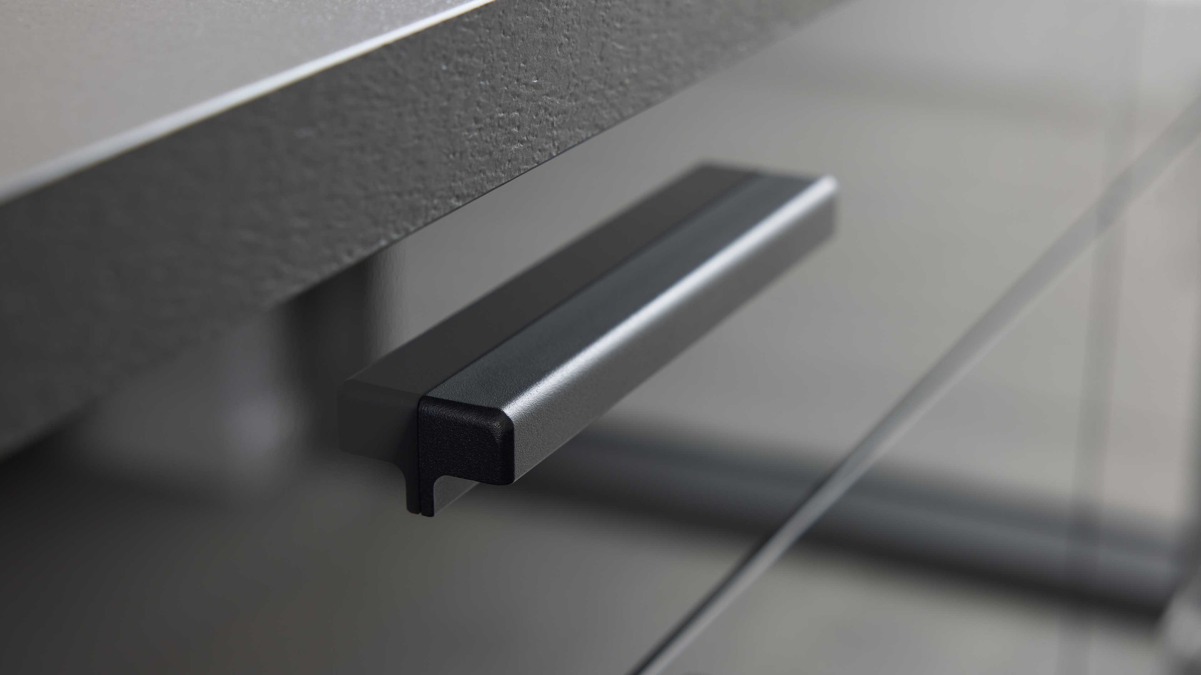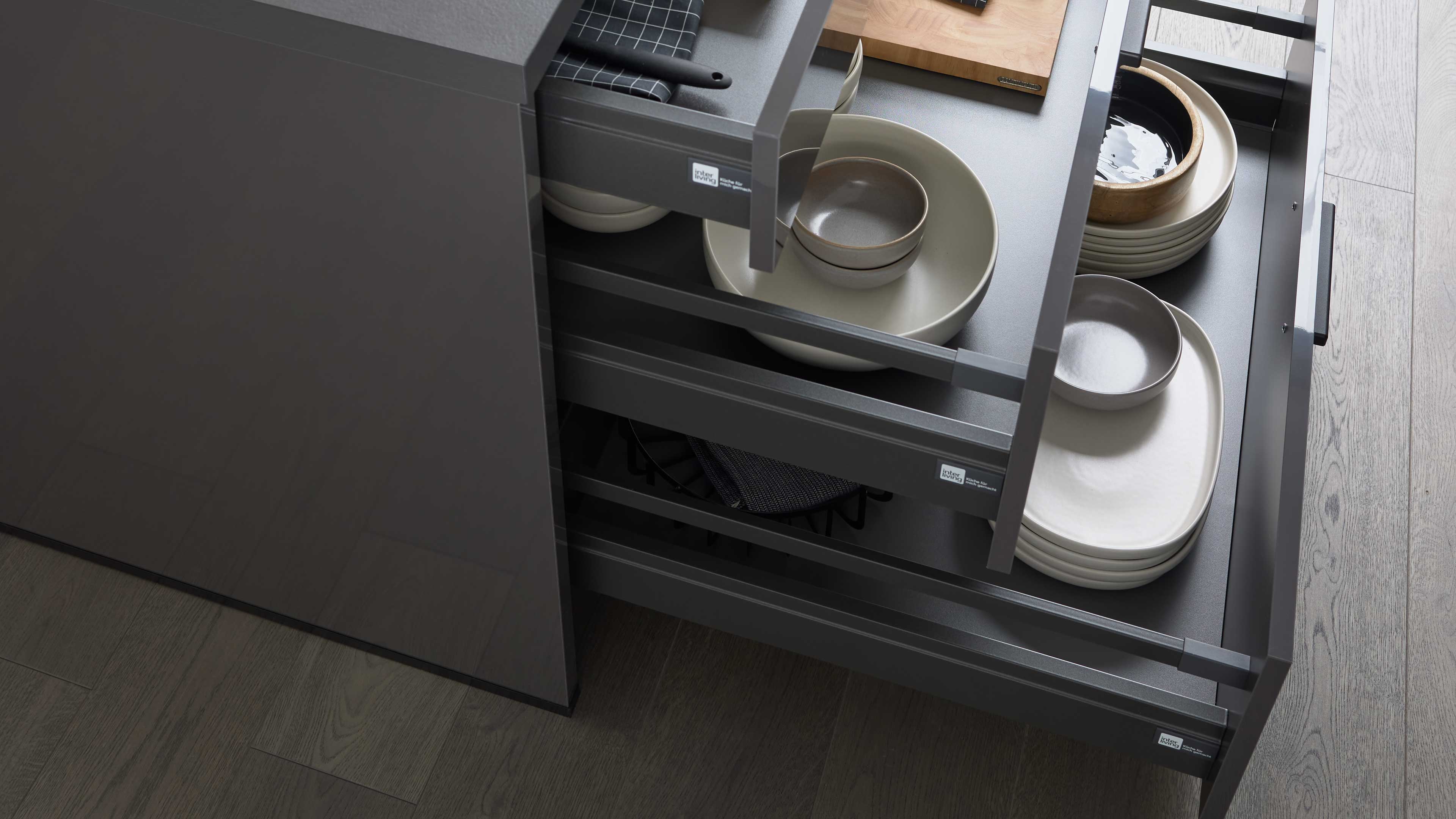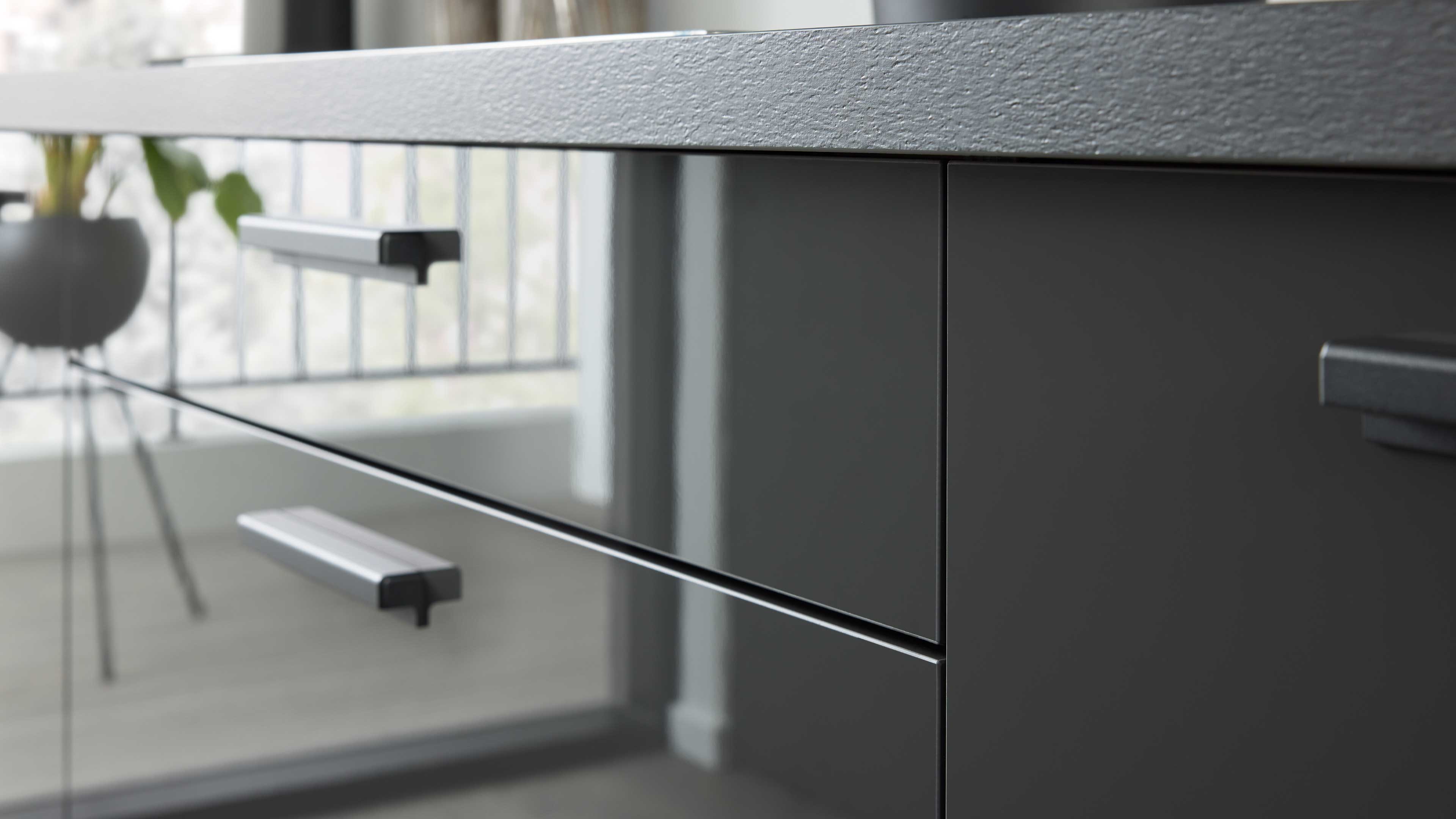 Die Interliving Küche Serie 3068 setzt auf ein edles Farbkonzept: graphitfarbene Lacklaminat-Hochglanzfronten, dazu passende Korpusse, Arbeitsplatten und Sockelblenden – alles Ton in Ton. Schwarze Griffe runden das Erscheinungsbild harmonisch ab und verleihen der Küche eine elegante, zeitlose Ausstrahlung.