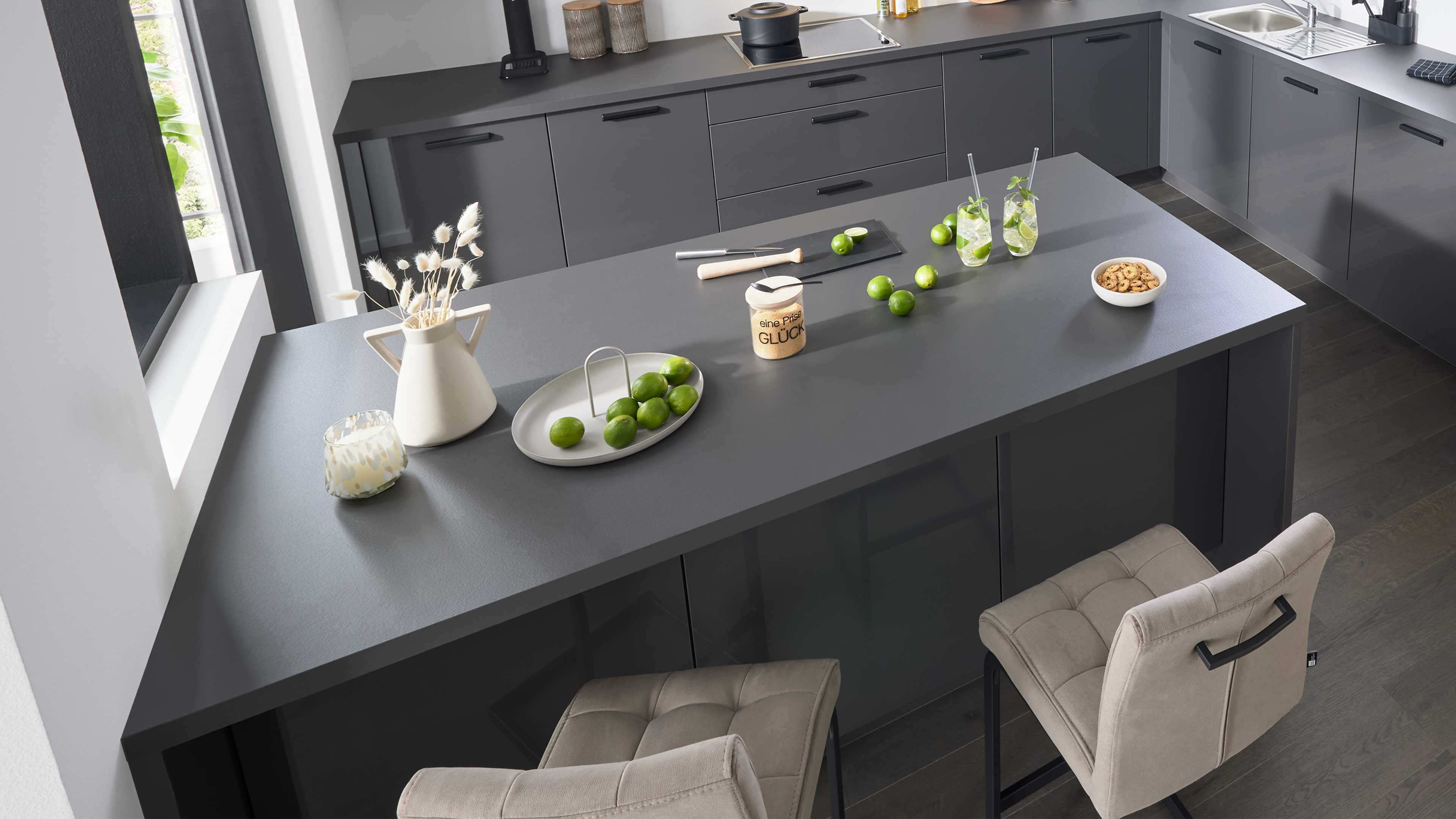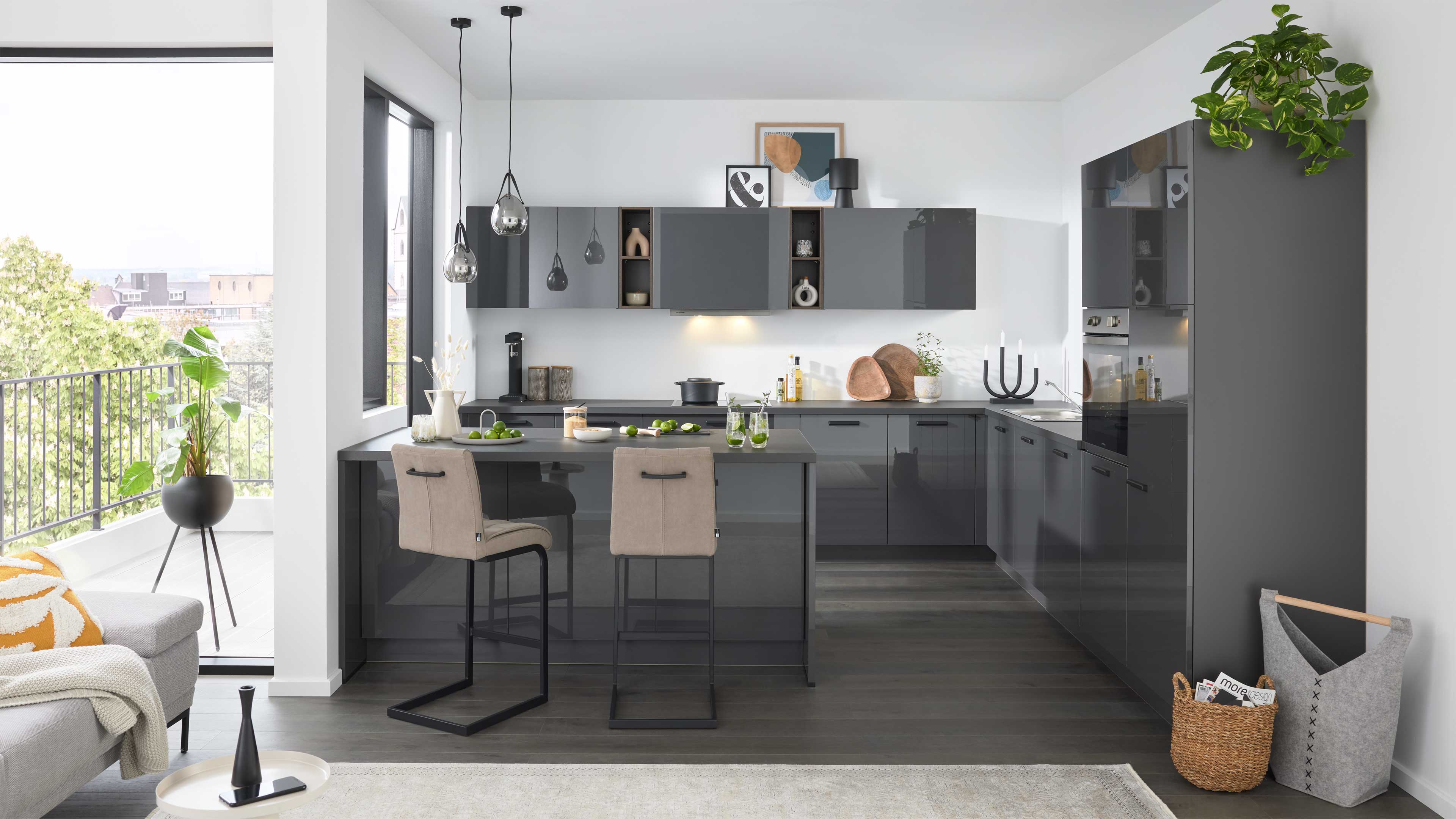 Hochglanzküche in Anthrazit mit Sitztheke und modernem Stauraumkonzept
