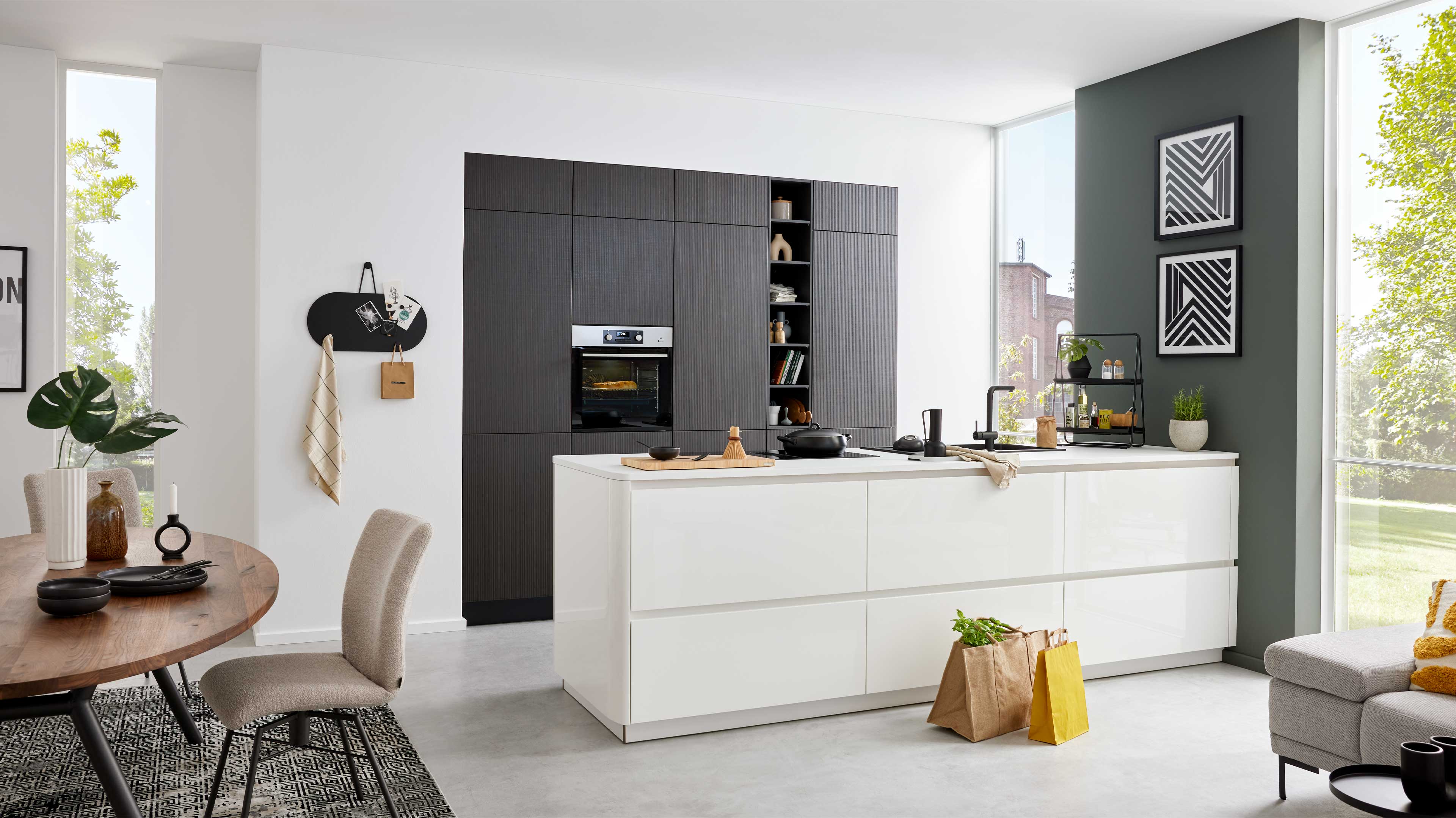Die Interliving Küche Serie 3069 vereint moderne Eleganz mit cleverer Raumplanung. Die Kombination aus weißen Hochglanz-Lacklaminatfronten und markanter Stripe-Wood-Coffee-Nachbildung sorgt für eine ausdrucksstarke Optik. Grifflos gestaltete Fronten und premiumweiße Arbeitsplatten runden das klare, geradlinige Erscheinungsbild perfekt ab – für ein stilvolles Küchenerlebnis mit Charakter.