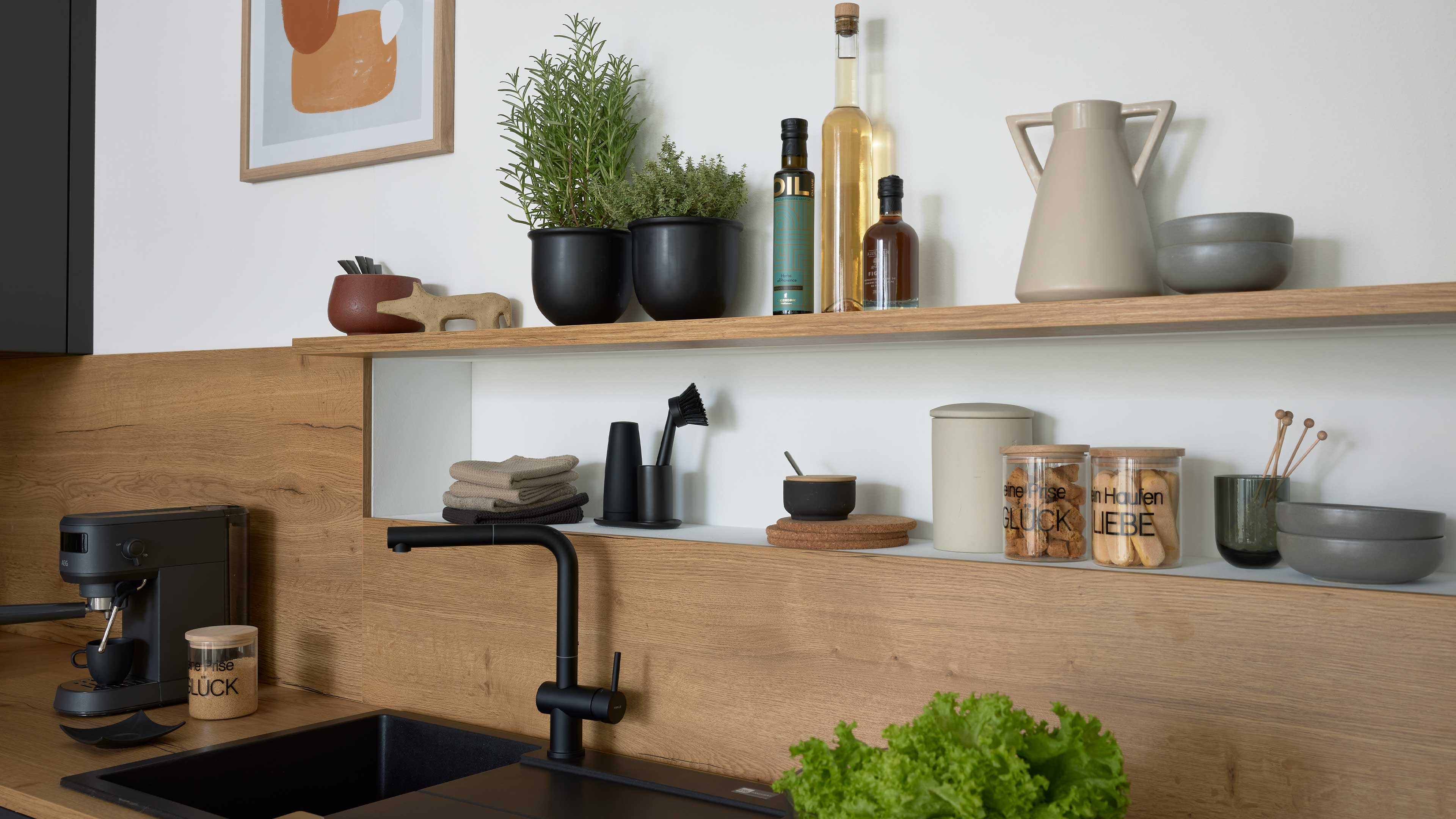 Moderne L-Küche in Anthrazit mit Holzarbeitsplatte und offenen Regalen