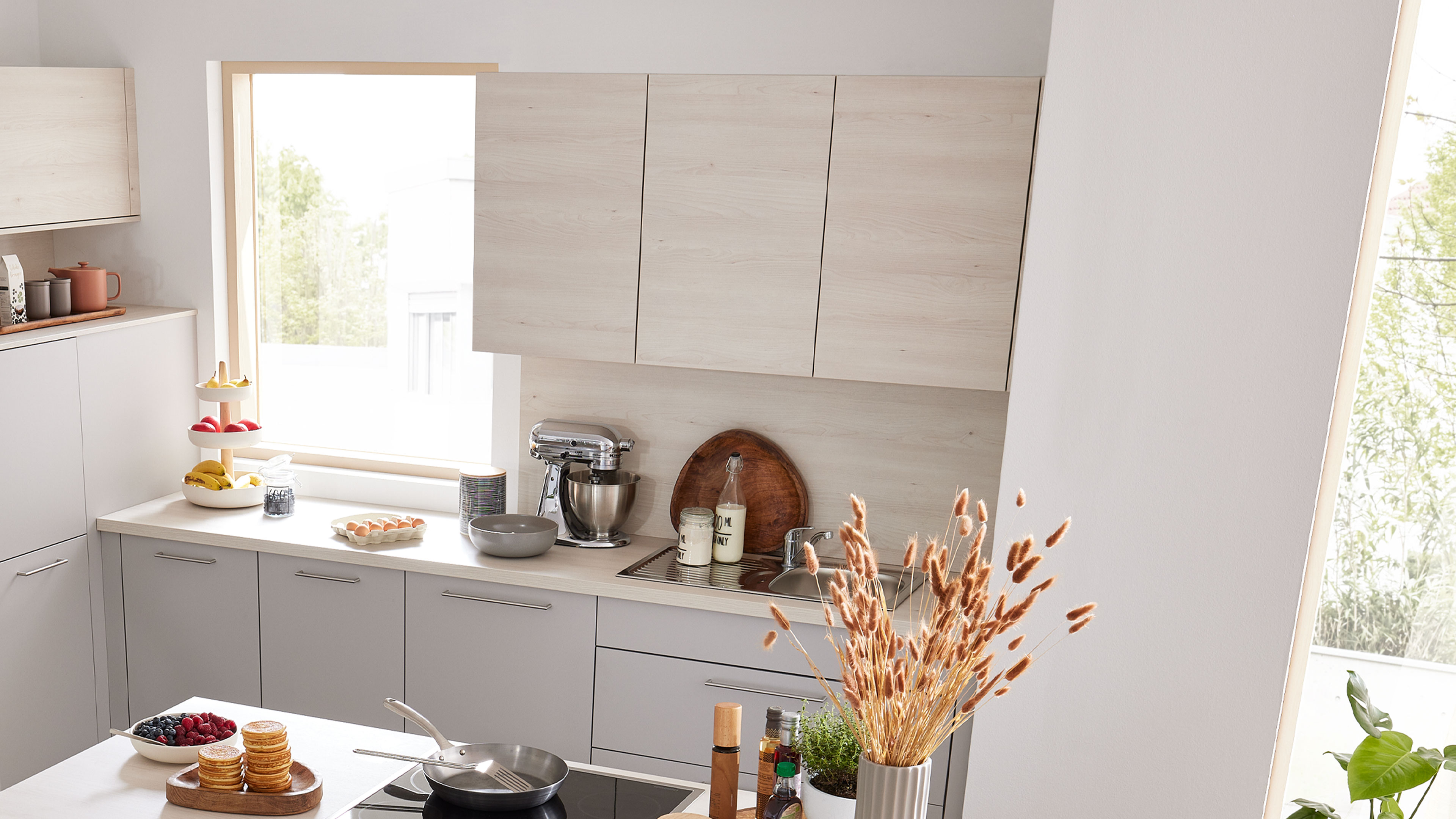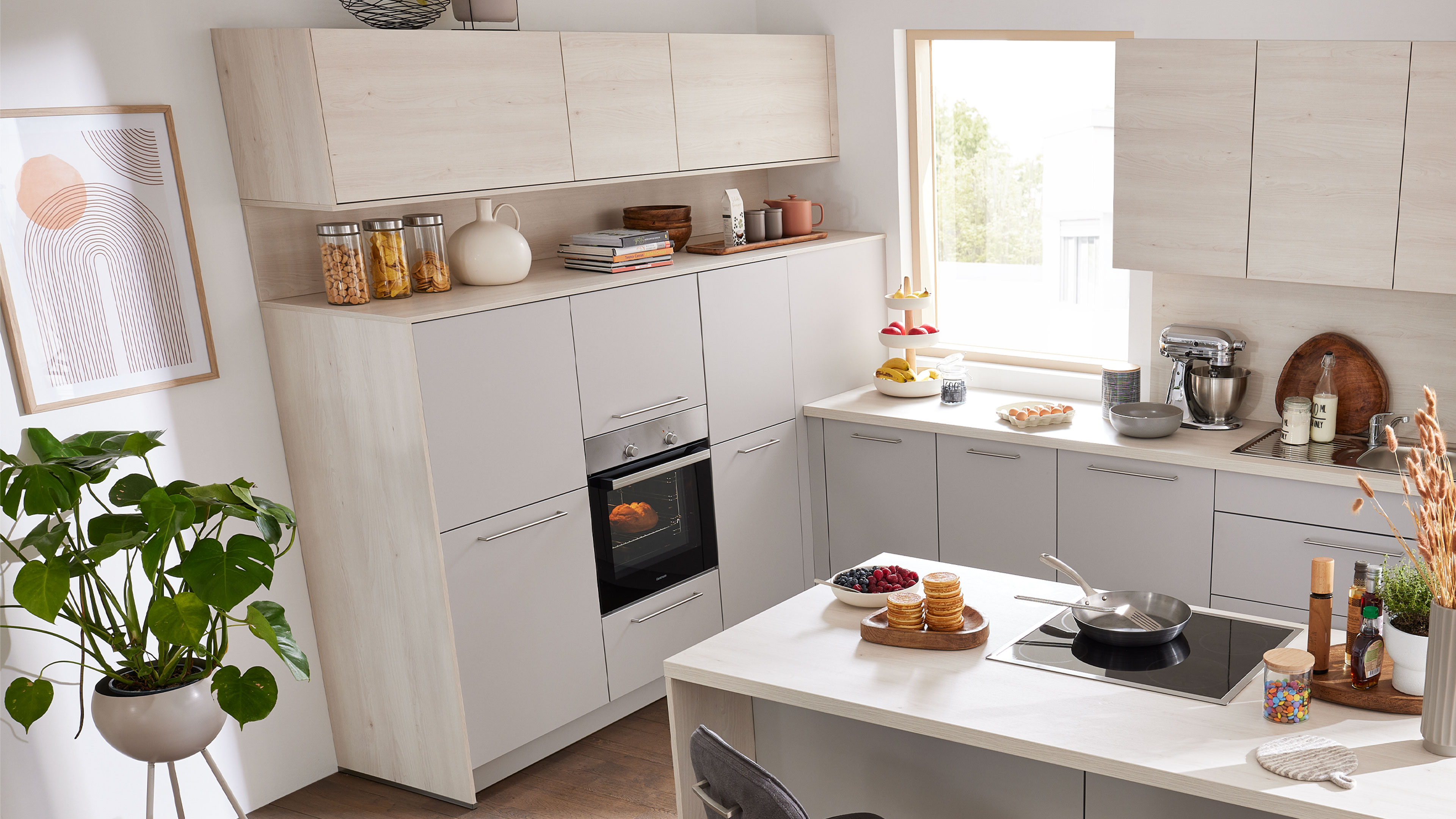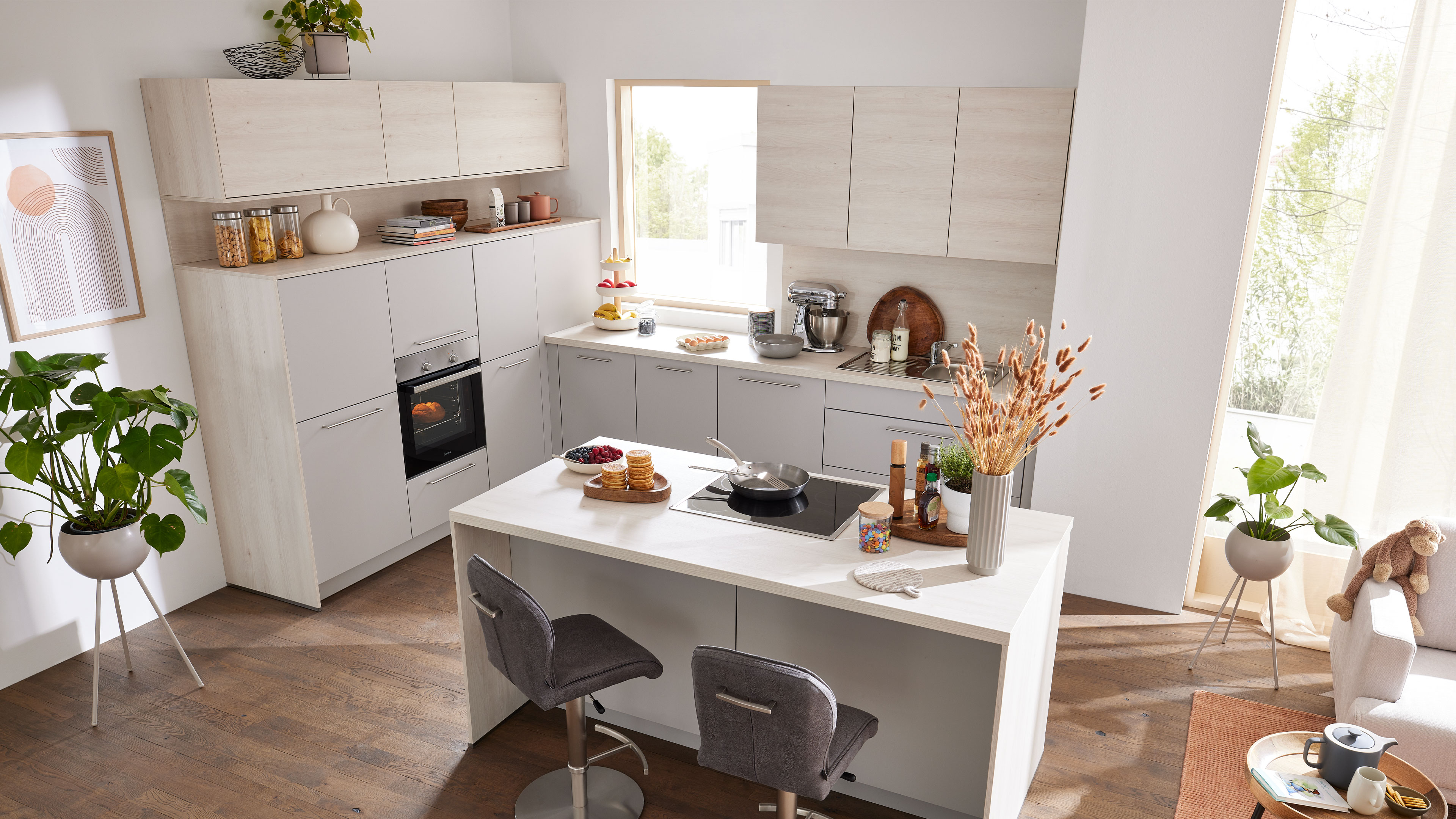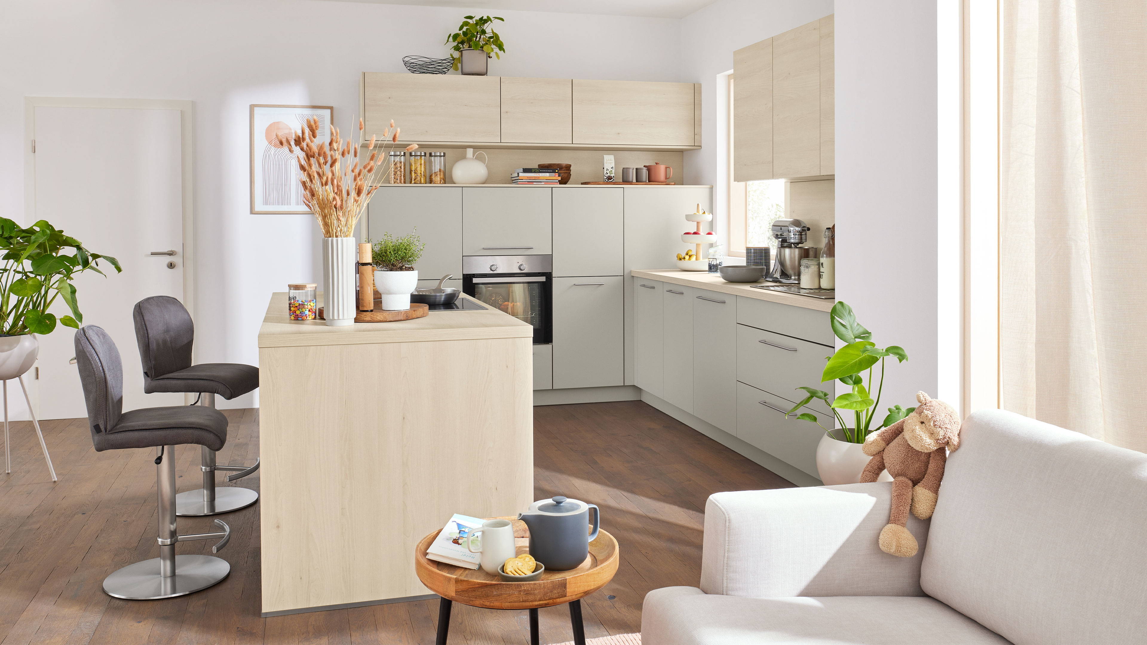 Die Interliving Küche Serie 3077 ist die perfekte Wahl, wenn du eine zeitlose, stilvolle Planküche suchst, die Funktionalität und Design harmonisch verbindet. Platingraue Fronten verleihen der Küche eine elegante Klarheit, während Akzente in Kiruna Birke Holznachbildung für eine wohnliche, natürliche Note sorgen. Die Mischung aus klaren Bügelgriffen und grifflosen Elementen mit Lifttüren setzt optische Highlights und bringt eine puristische Leichtigkeit ins Raumkonzept.