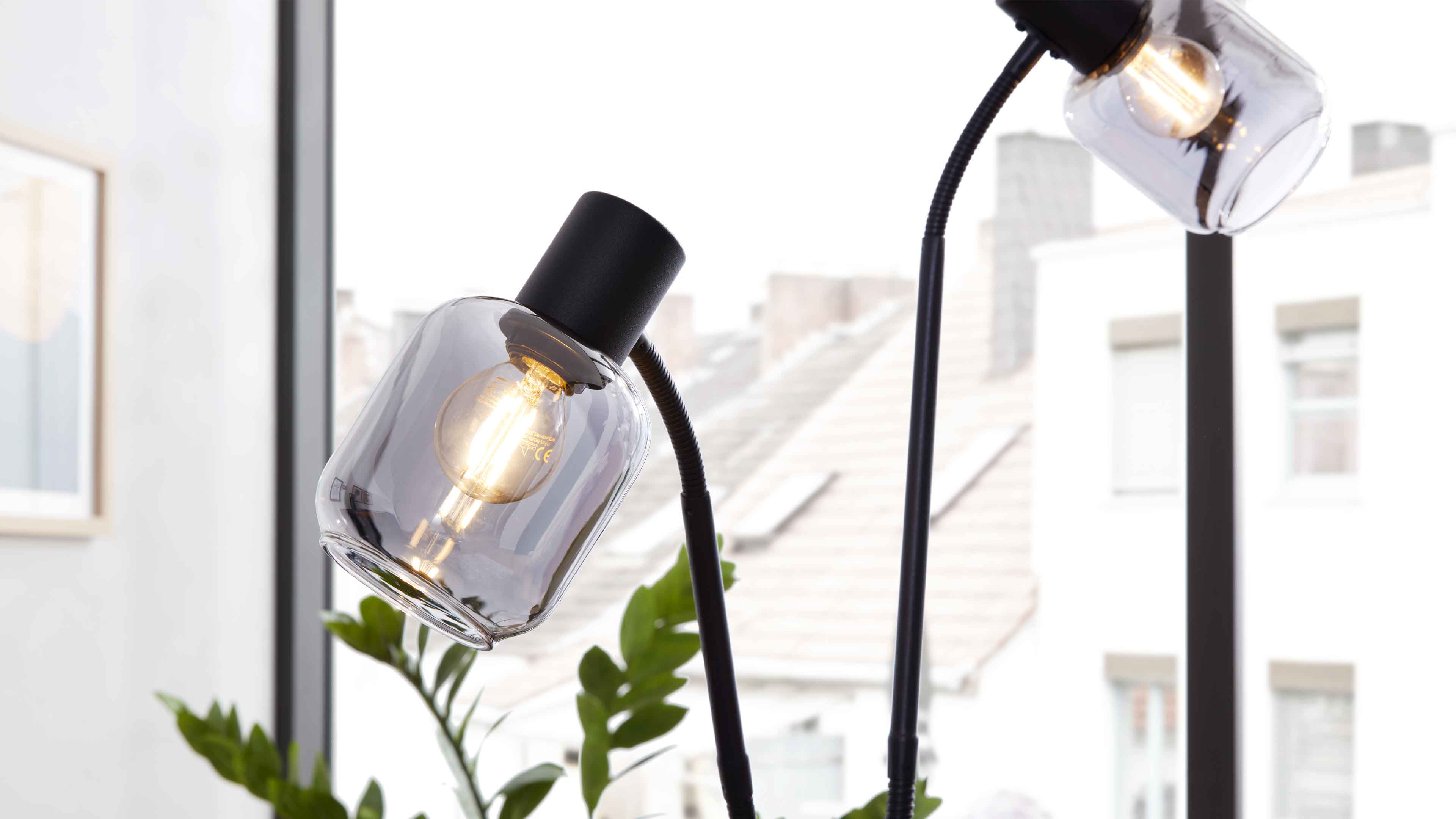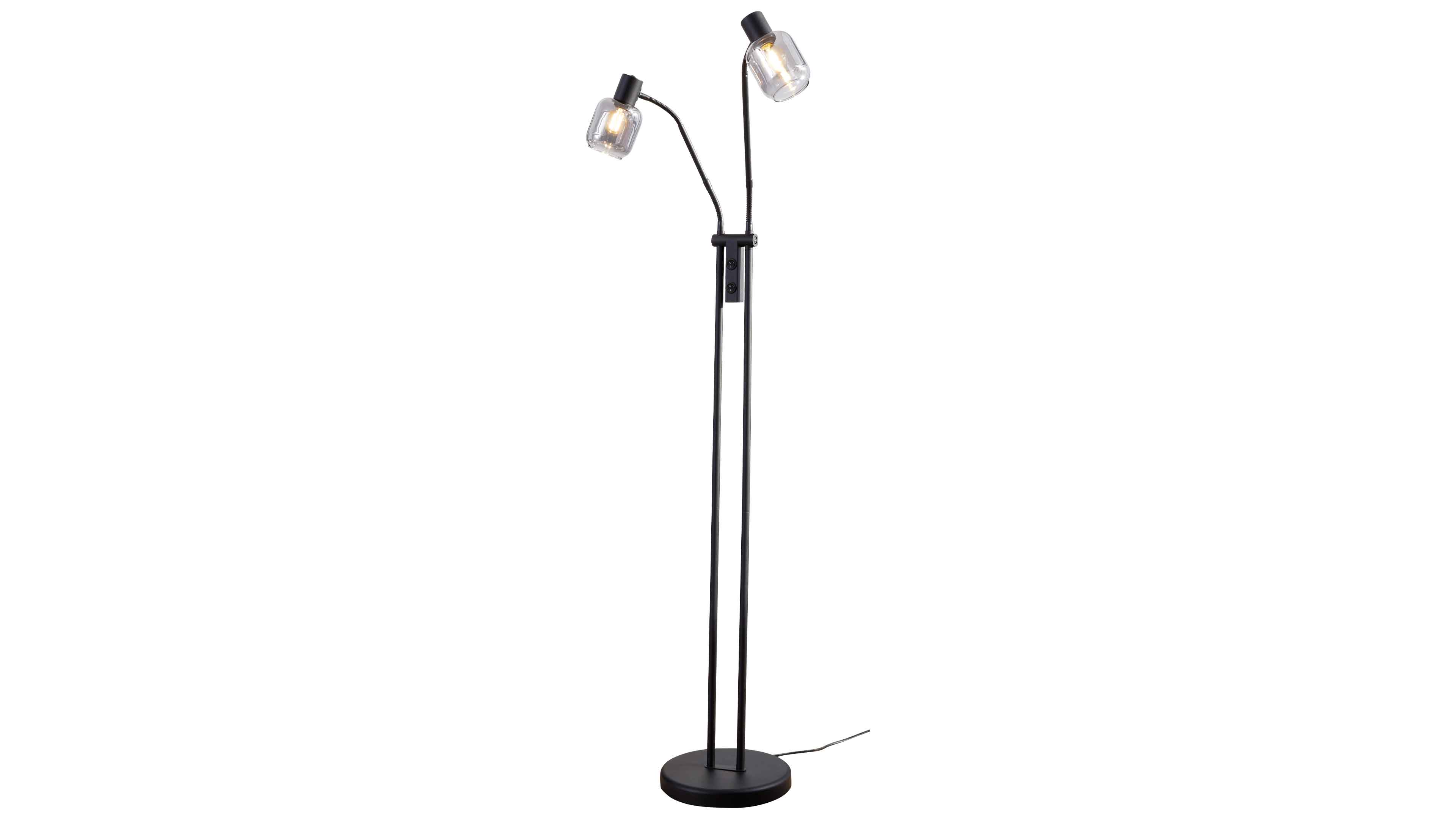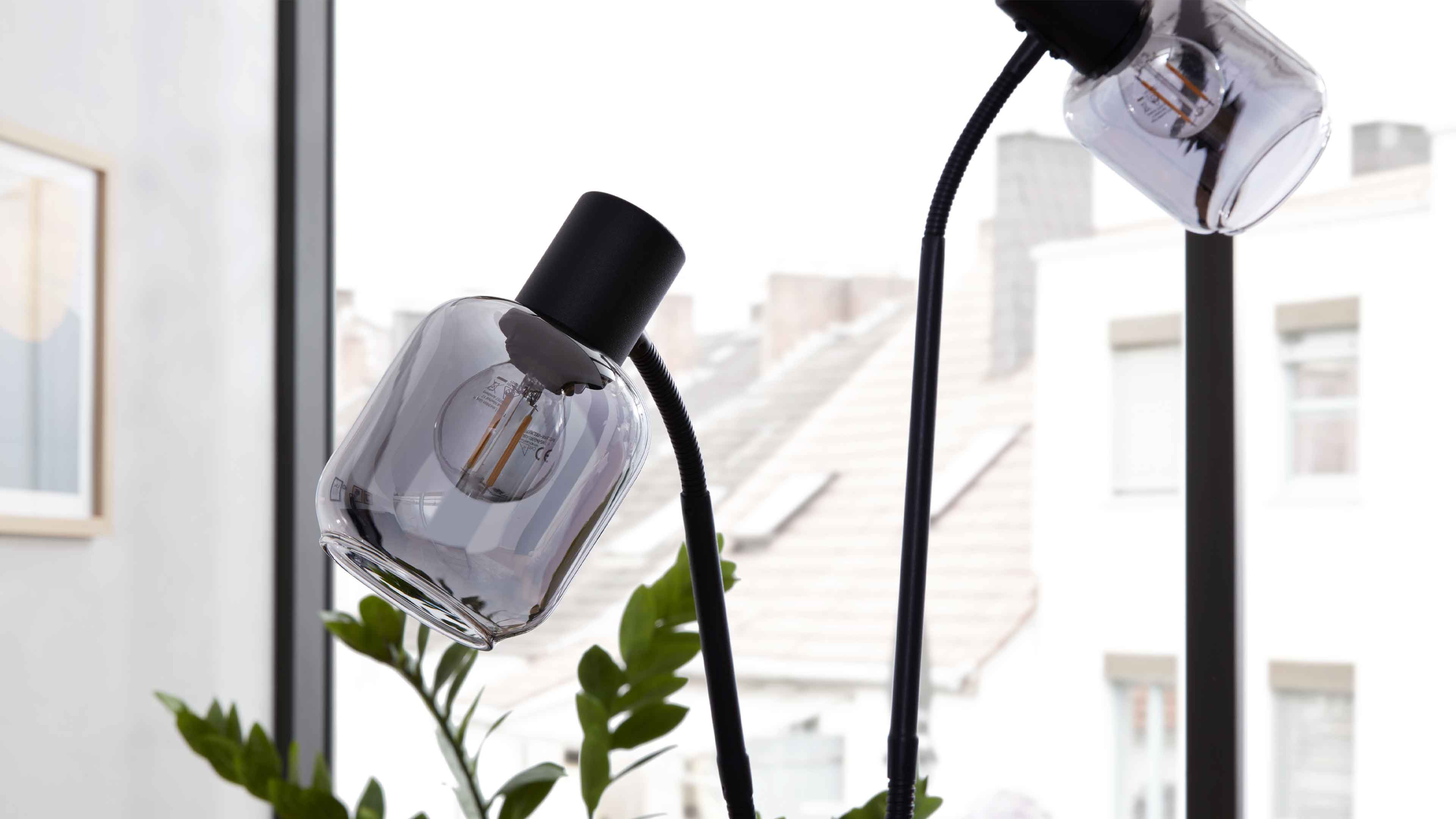 Stehleuchte mit schwarzem Metallgestell und zwei rauchgrauen Glas-Schirmen
