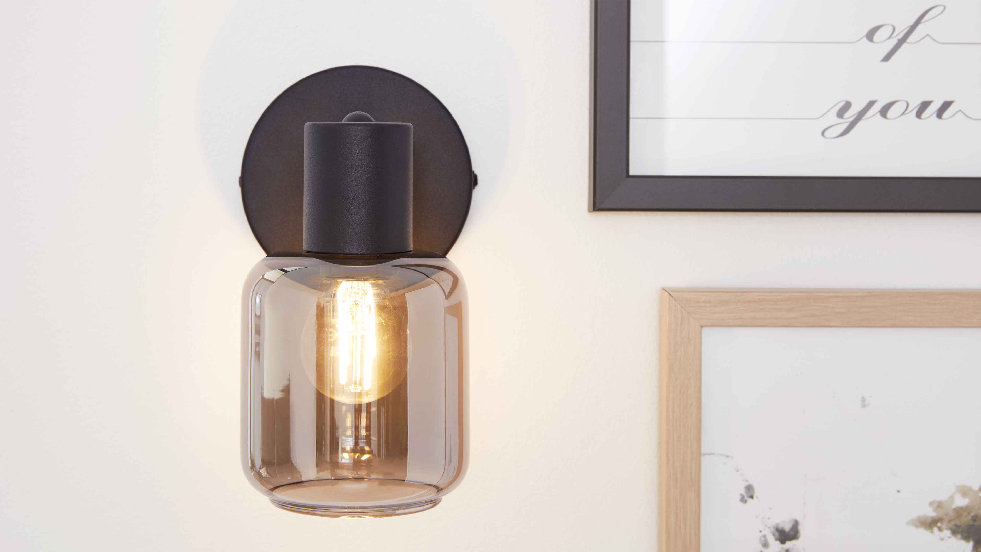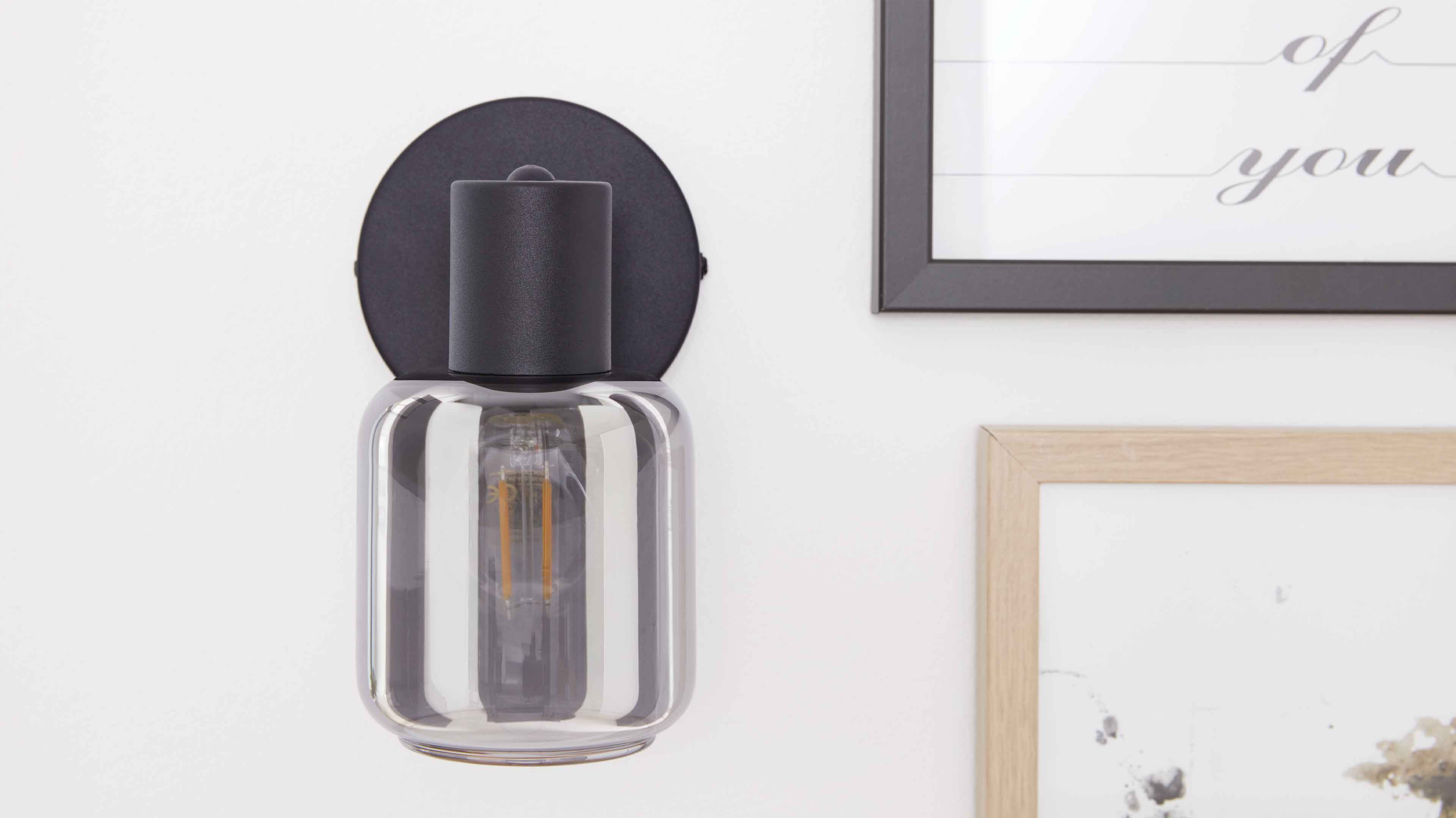 Wandleuchte mit schwarzem Metallgehäuse und rauchgrauem Glas-Schirm