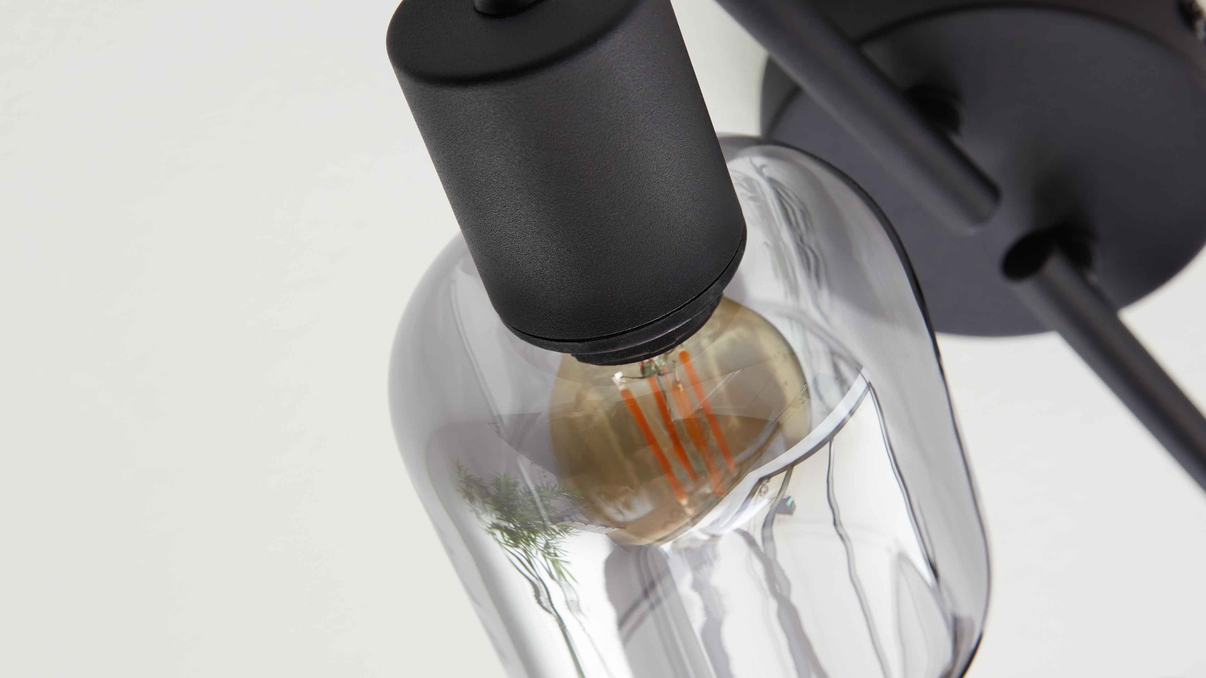 Deckenstrahler mit vier rauchgrauen Glaskugeln und schwarzen Fassungen