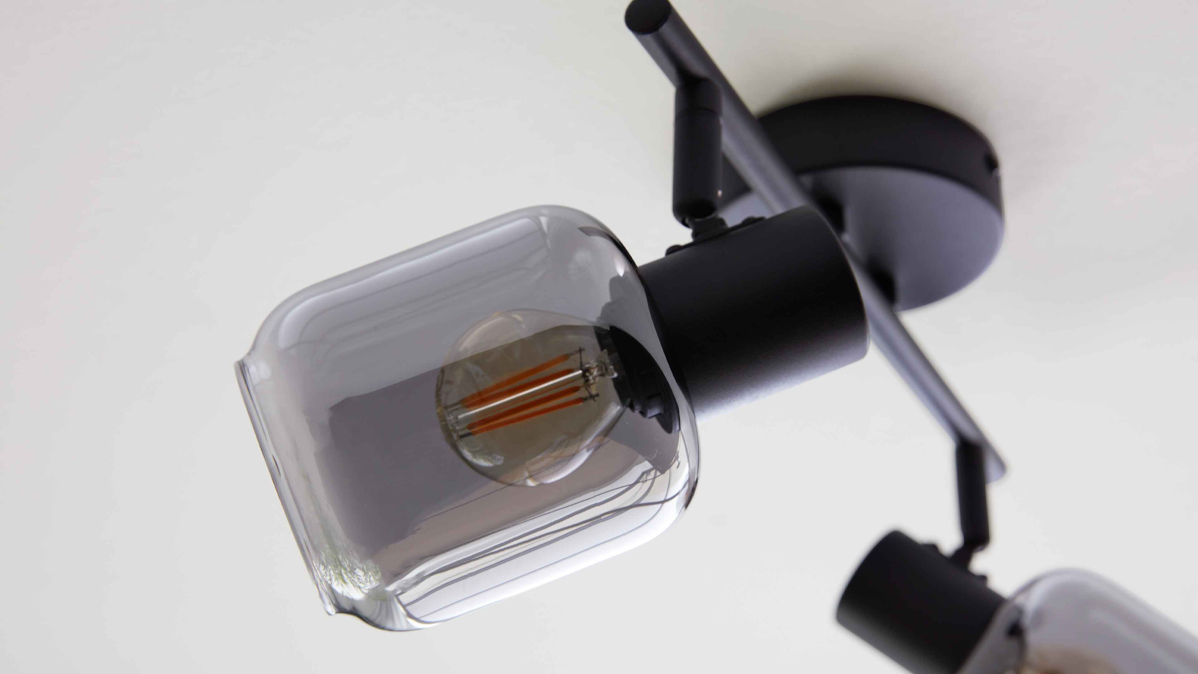 Deckenstrahler mit vier rauchgrauen Glaskugeln und schwarzen Fassungen
