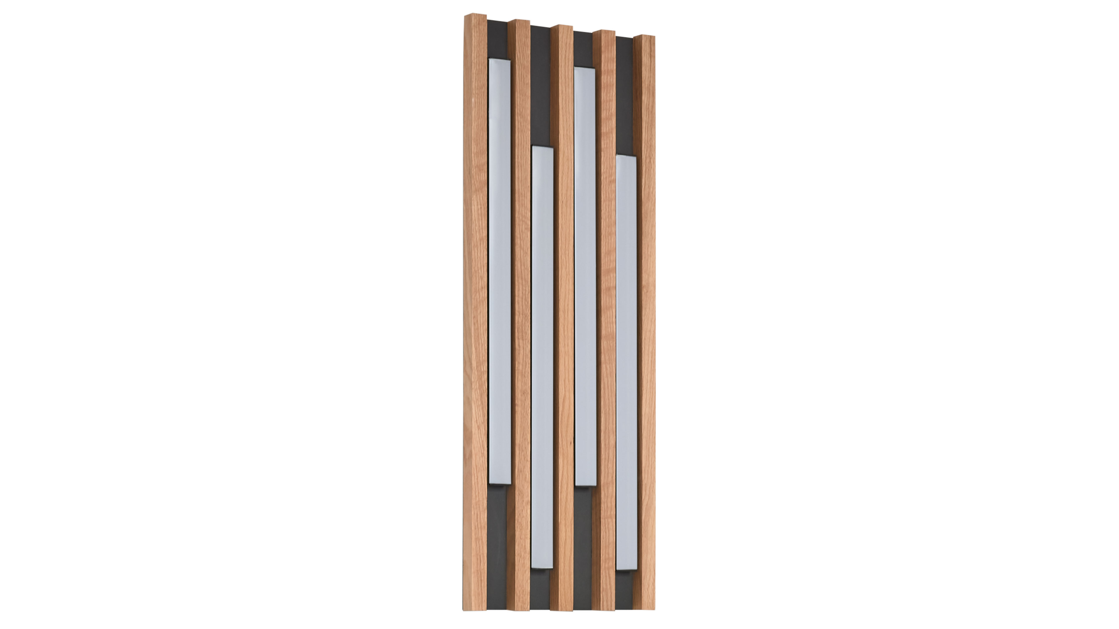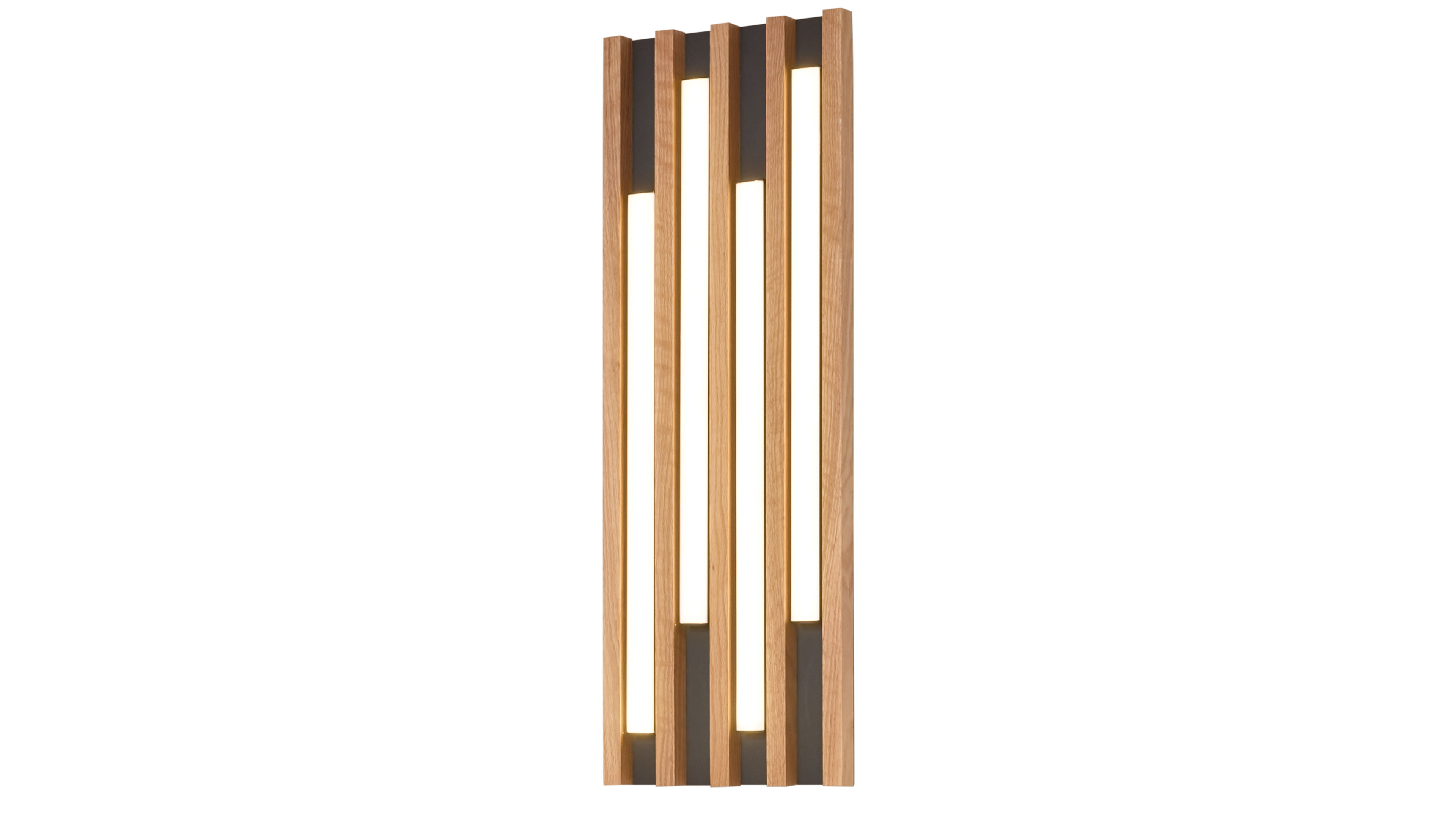 Wandleuchte mit senkrechten Holzleisten und integrierter LED-Beleuchtung