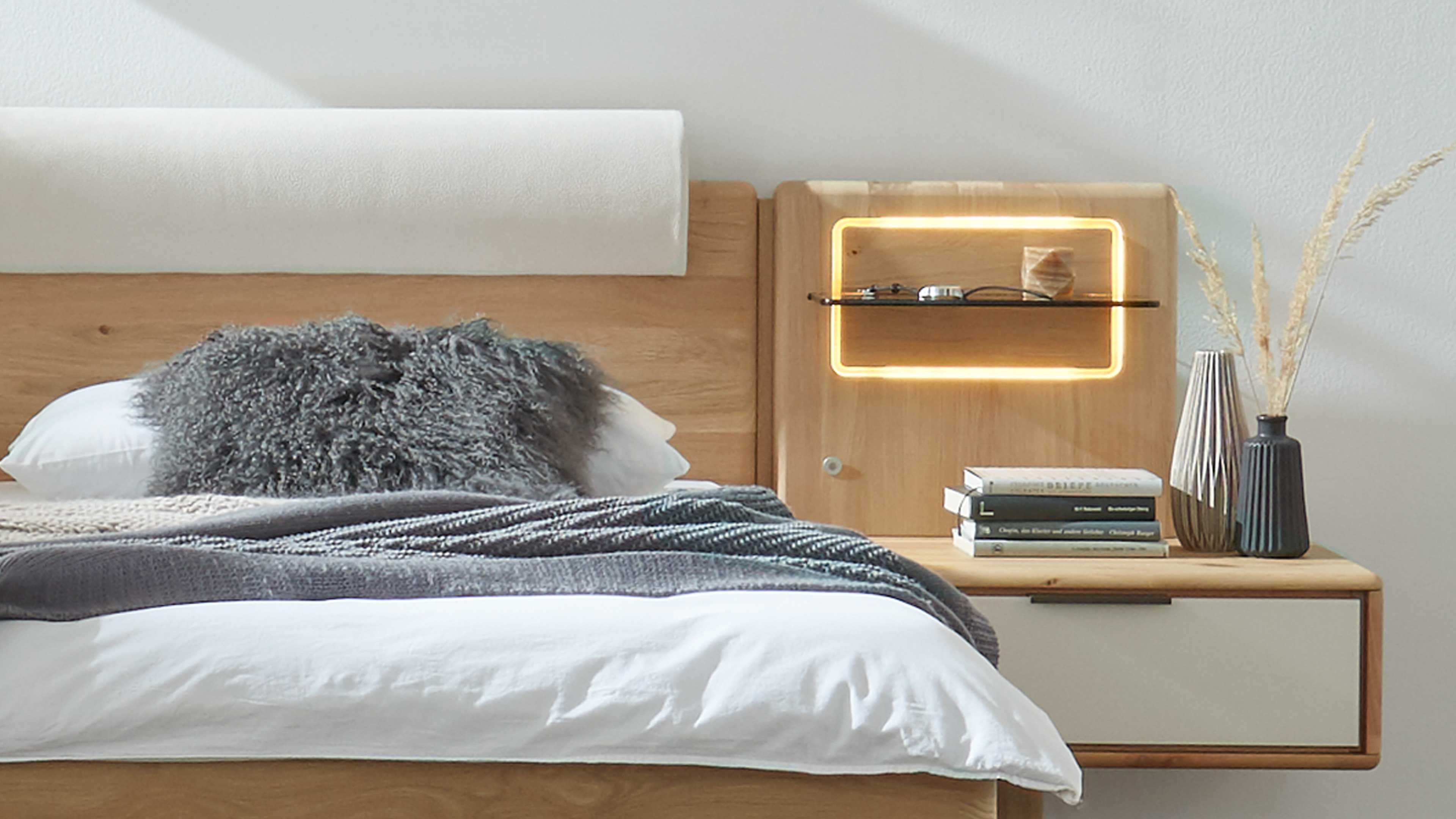 Natürlich schlafen mit Komfort – das Bettgestell mit cremefarbenen Kopfpolstern aus der Interliving Schlafzimmer Serie 1015