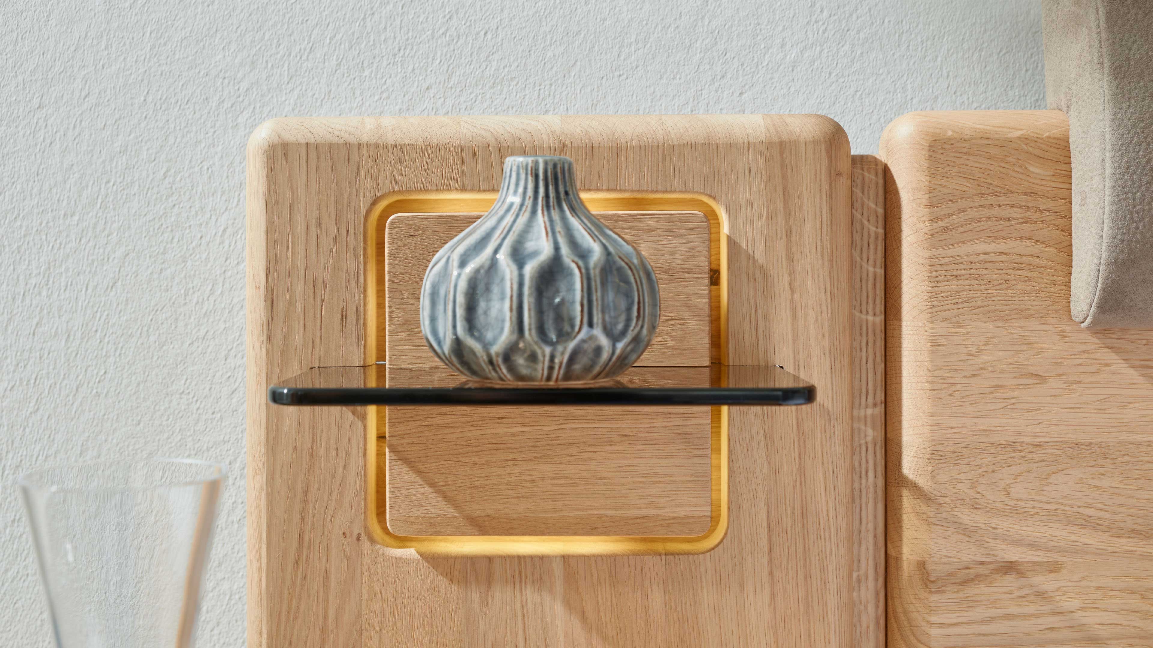 Ergänzt wird die Kombination durch zwei Aufsatzpaneele mit getöntem Glasboden, jeweils ca. 33 x 43 x 12 cm (BxHxT). Die integrierte LED-Beleuchtung mit jeweils 5,1 Watt Leistung und fest verbauten Leuchtmitteln sorgt für eine angenehme, stimmungsvolle Lichtatmosphäre am Bett. Sie ist inklusive Trafo und lässt sich bequem über einen Kippschalter bedienen – perfekt für sanftes Licht am Abend oder eine dezente Hintergrundbeleuchtung.