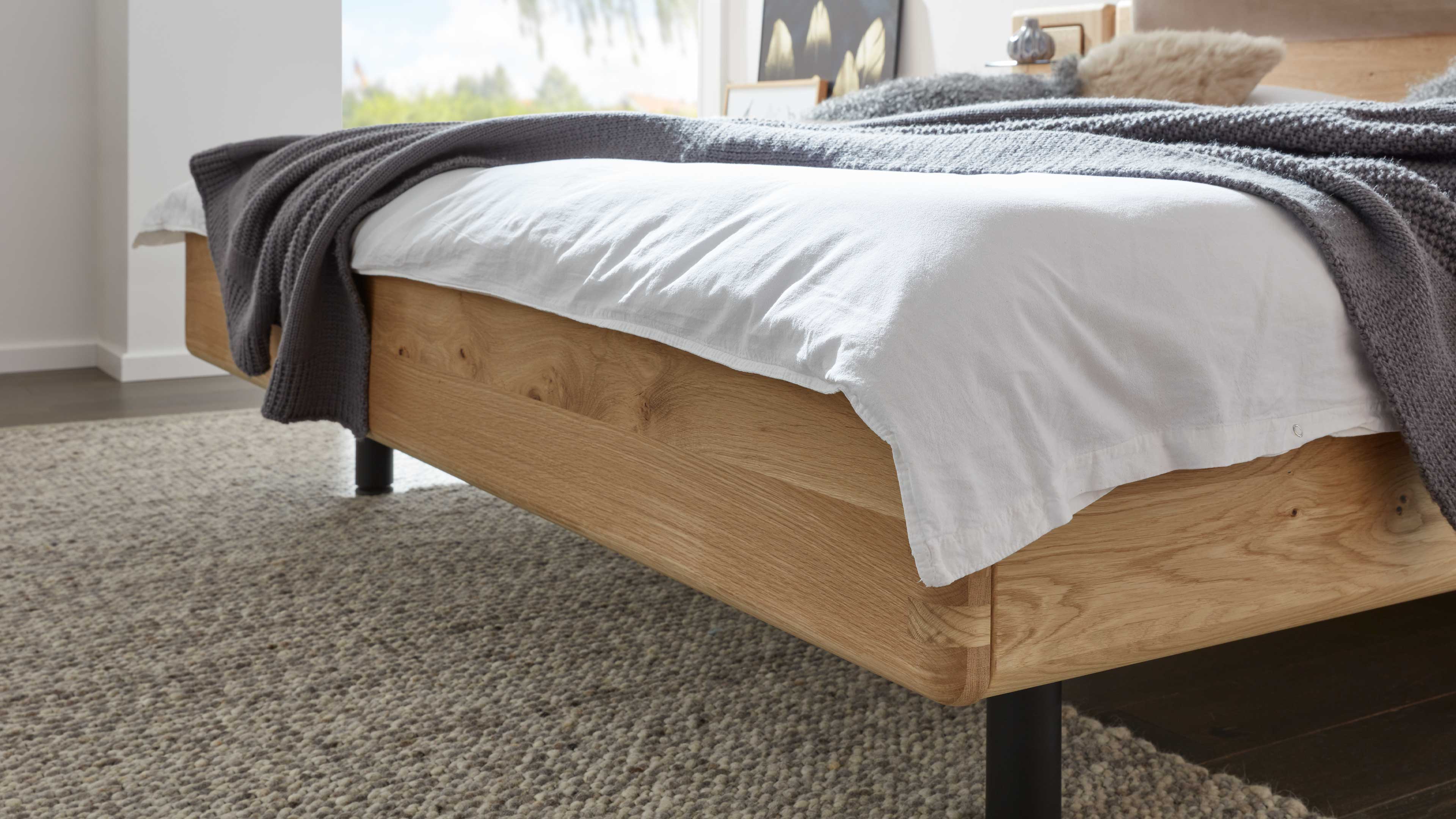 Das Massivholzbettgestell überzeugt mit keilverzinkten Bettseiten und einer Komfort-Bettseitenhöhe von ca. 47 cm, die ein bequemes Ein- und Aussteigen ermöglicht. Für individuellen Liegekomfort lässt sich die Einlegetiefe vierfach verstellen – ideal, um die Liegehöhe optimal anzupassen. Die pulverbeschichteten schwarzen Metallfüße sorgen für Stabilität und unterstreichen den modernen Charakter. Mit einer Liegefläche von ca. 180 x 200 cm (BxL) bietet das Bett großzügigen Platz für zwei Personen. Die Gesamtmaße betragen ca. 188 x 95 x 208 cm (BxHxL).