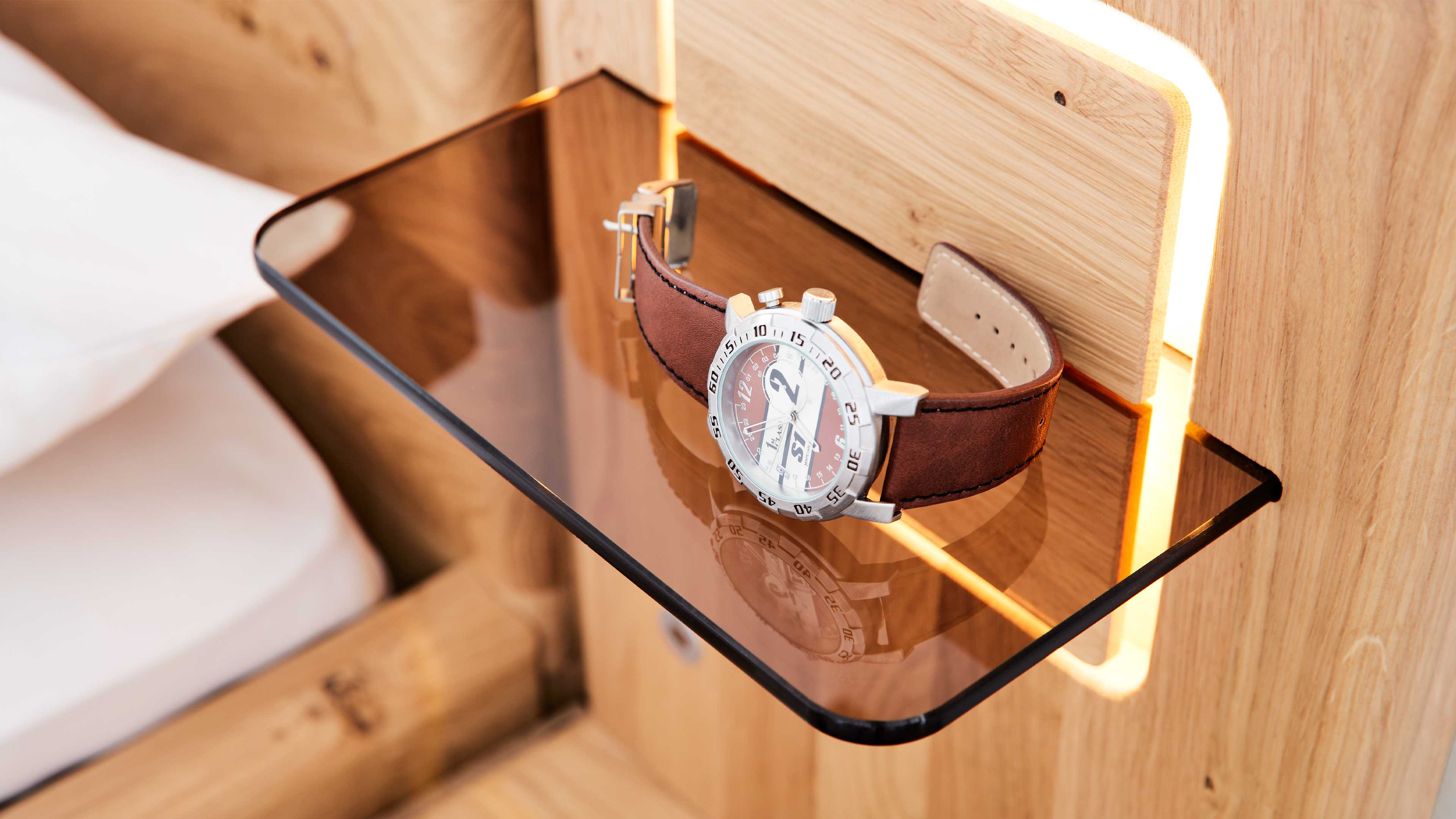 Ergänzt wird die Kombination durch zwei Aufsatzpaneele mit getöntem Glasboden, jeweils ca. 33 x 43 x 12 cm (BxHxT). Die integrierte LED-Beleuchtung mit jeweils 5,1 Watt Leistung und fest verbauten Leuchtmitteln sorgt für eine angenehme, stimmungsvolle Lichtatmosphäre am Bett. Sie ist inklusive Trafo und lässt sich bequem über einen Kippschalter bedienen – perfekt für sanftes Licht am Abend oder eine dezente Hintergrundbeleuchtung.
