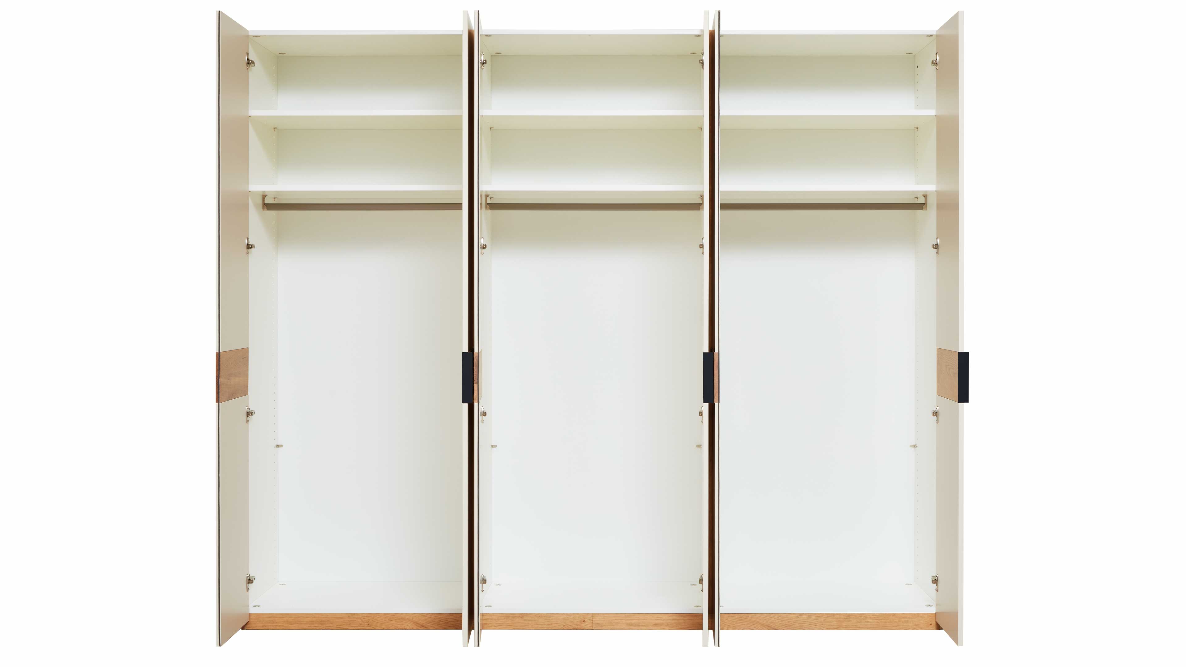 Drehtürenschrank in Weiß mit durchgehender Akzentleiste in Eiche-Optik