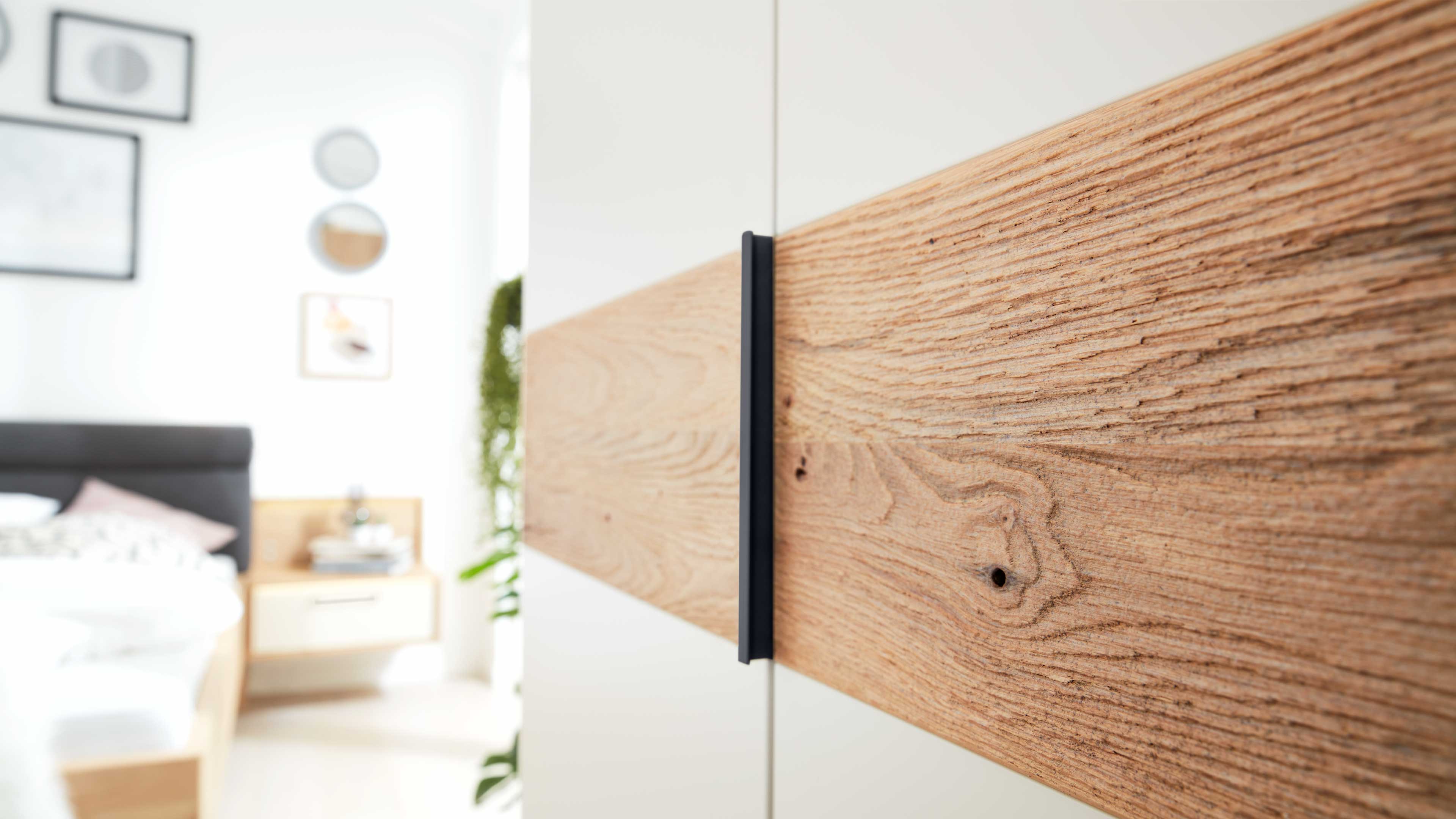 Der Kleiderschrank aus der Interliving Schlafzimmer Serie 1023 kombiniert hochwertige Materialien mit klarer Linienführung und durchdachter Funktion. Der Korpus mit Echtholz-Balkeneichefurnier und Aknzente in massivem Riffholz bringt warme Natürlichkeit in dein Schlafzimmer, während die Fronten in weißem Mattlack für eine moderne, ruhige Optik sorgen. Anthrazitfarbene Bügelgriffe setzen stilvolle Kontraste und runden das elegante Design ab.