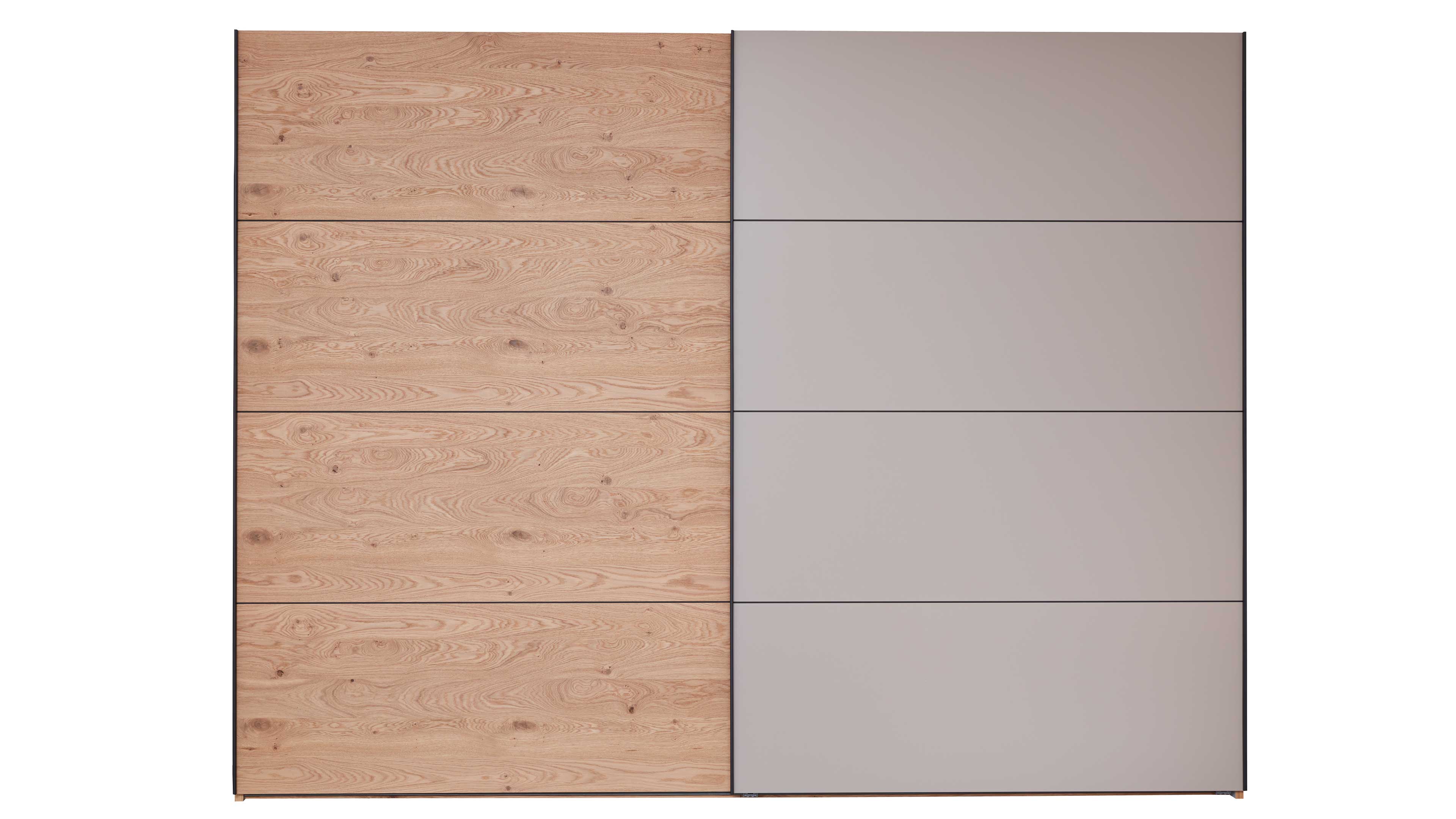Schwebetürenschrank mit markanter Frontgestaltung in Eiche-Optik und Mattlack Taupe
