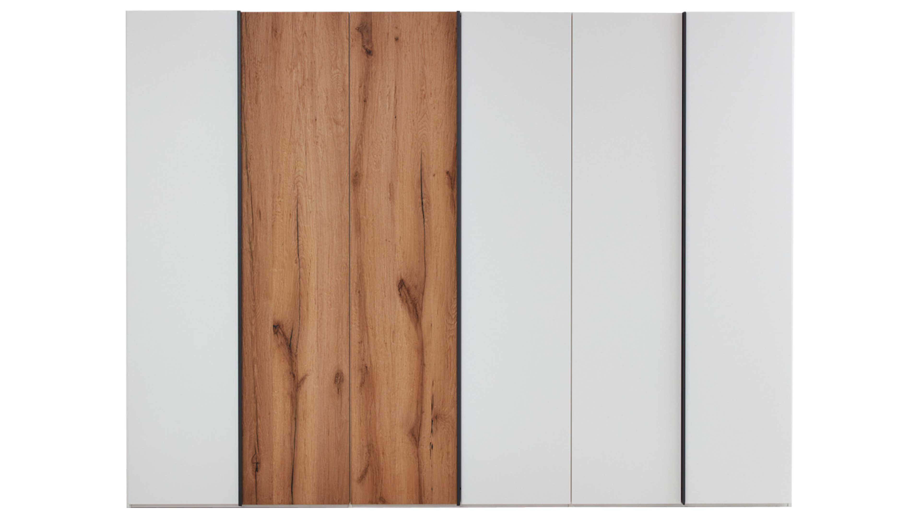 Hinter den fünf Drehtüren mit robusten Metallscharnieren und integrierter Schließdämpfung verbergen sich sechs Kleiderböden und drei Kleiderstangen. So kannst du Kleidung, Bettwäsche oder Handtücher sowohl hängend als auch liegend optimal verstauen. Mit Maßen von ca. 249 x 222 x 62 cm (B/LxHxT) bietet der Schrank großzügigen Stauraum für all deine Lieblingsstücke. Optional lässt er sich mit einer stimmungsvollen LED-Beleuchtung aufwerten.