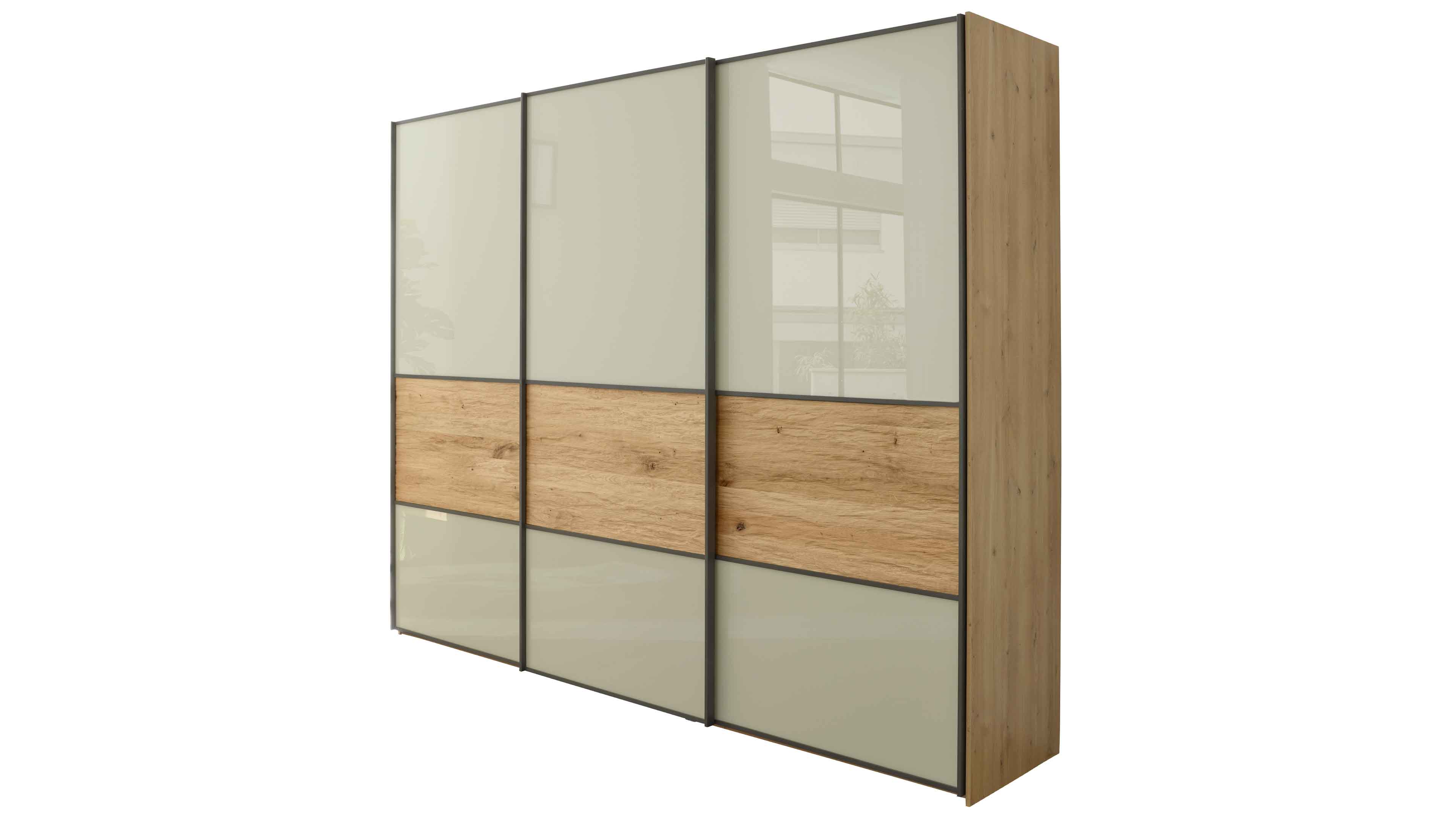 Die elegante Front aus champagnerfarbenem Glas wird durch massive Riffholz-Akzente aufgelockert, die dem Möbelstück einen natürlichen, handwerklichen Charakter verleihen. Der Korpus in Eiche-Bianco-Nachbildung, schieferfarbene Metallgriffleisten und das Innendekor in Erle-Nachbildung sorgen für ein rundum harmonisches, hochwertiges Erscheinungsbild. Mit ca. 250 x 217 x 67 cm (B/LxHxT) bietet der Schrank großzügigen Stauraum für alles, was du geordnet und griffbereit aufbewahren möchtest.