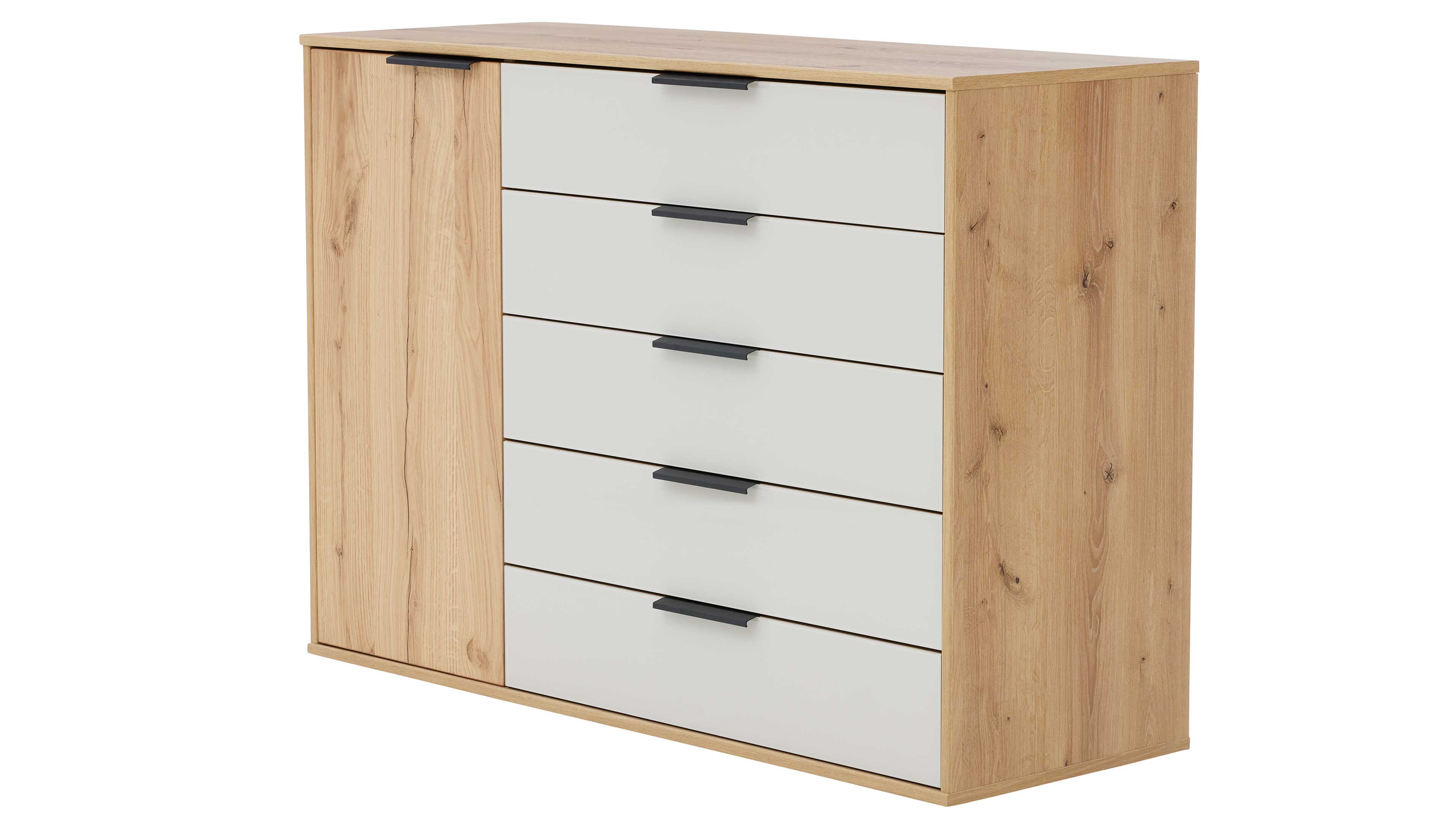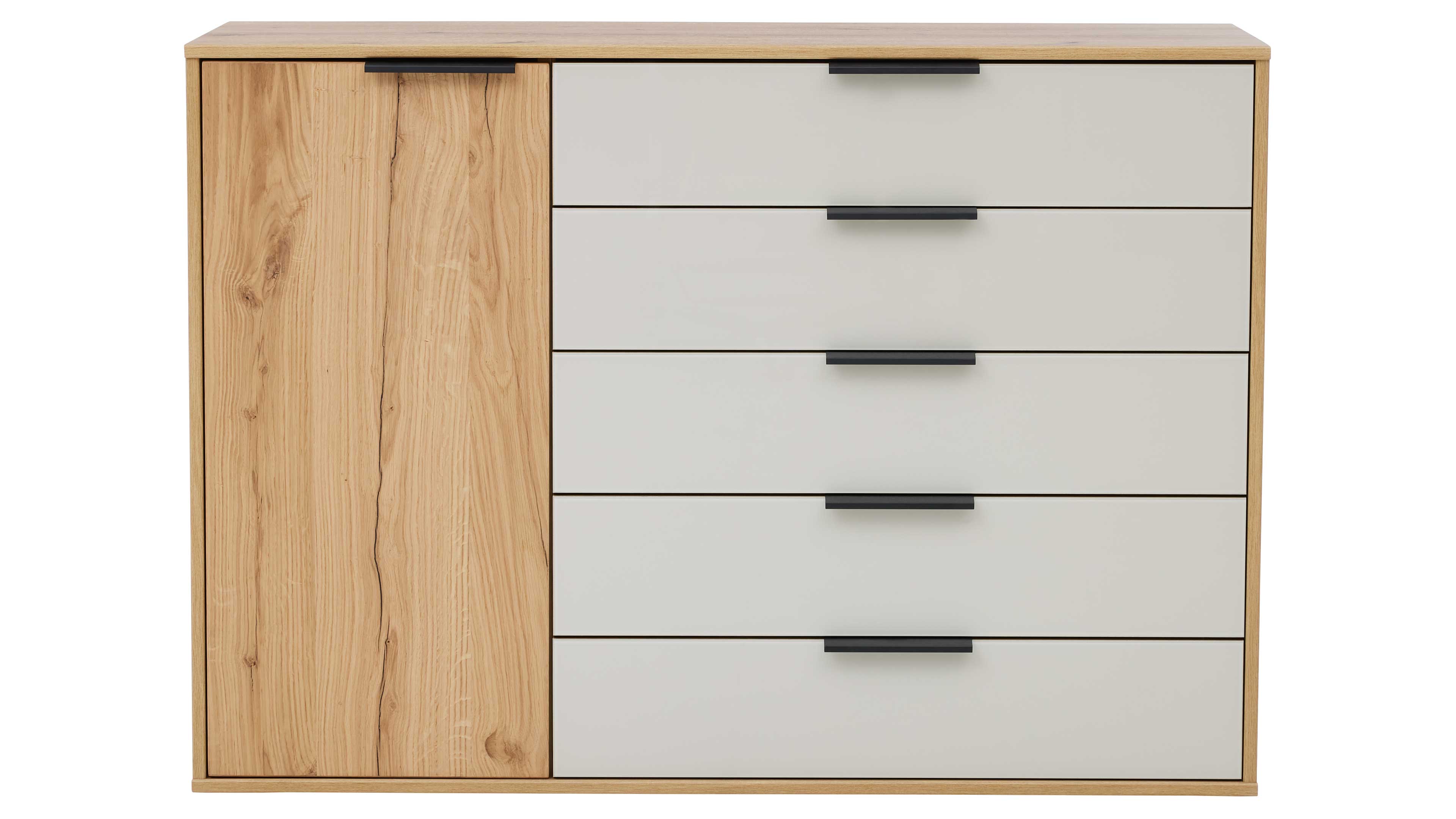 Kommode mit Hochglanzfronten in Champagner und Korpus in Eiche-Optik