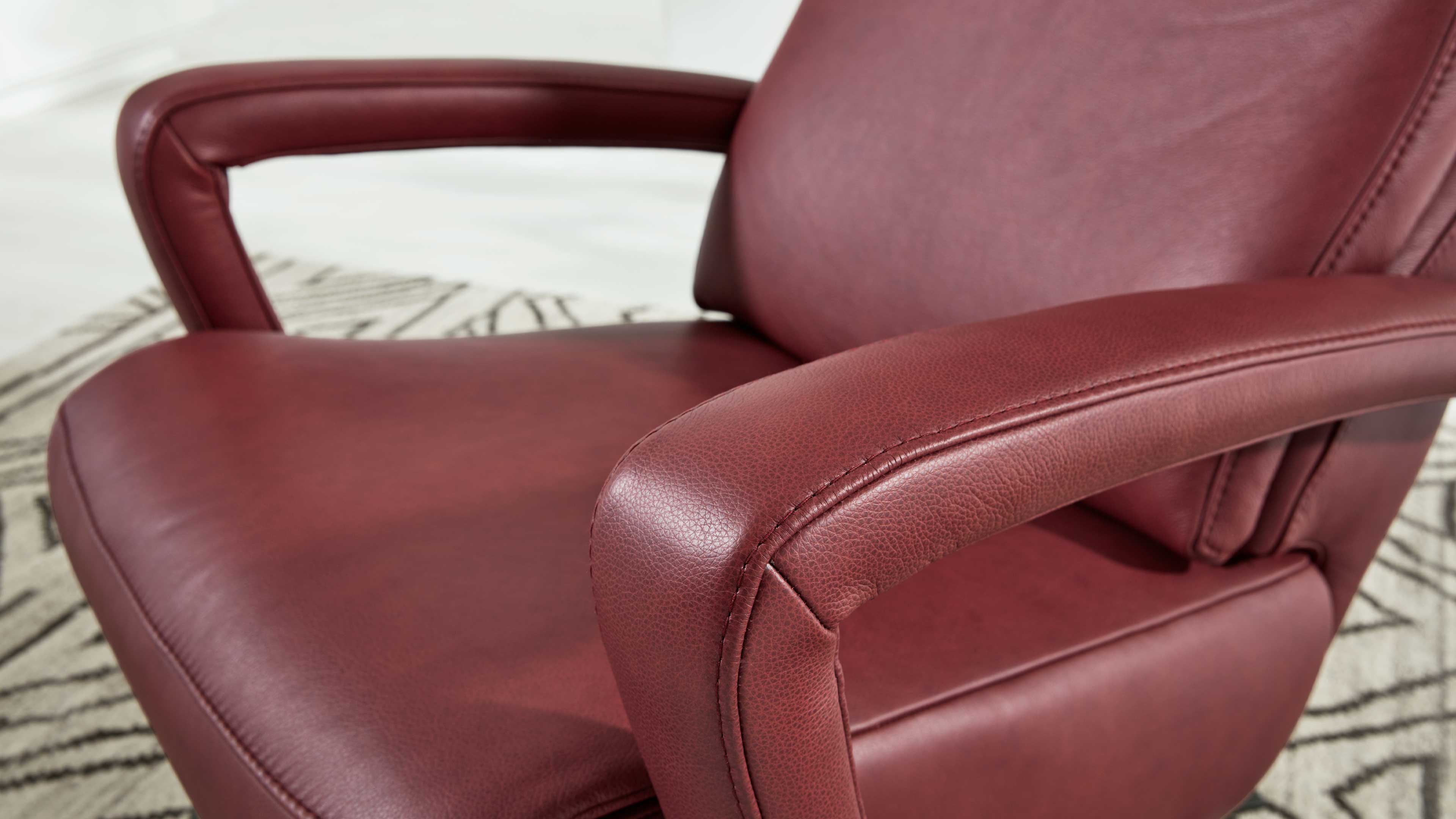 Für höchsten Sitzkomfort sorgt die leger-weiche Kaltschaumpolsterung, die in drei verschiedenen Sitzhärten – weich, mittel oder fest – erhältlich ist, jeweils ohne Aufpreis. Die vollgepolsterte Leder-Armlehne lädt zum gemütlichen Verweilen ein, während das manuell verstellbare Kopfpolster mit Rast-Klemm-Beschlag individuellen Halt bietet. Zwei weitere Armlehnenvarianten stehen optional zur Auswahl.