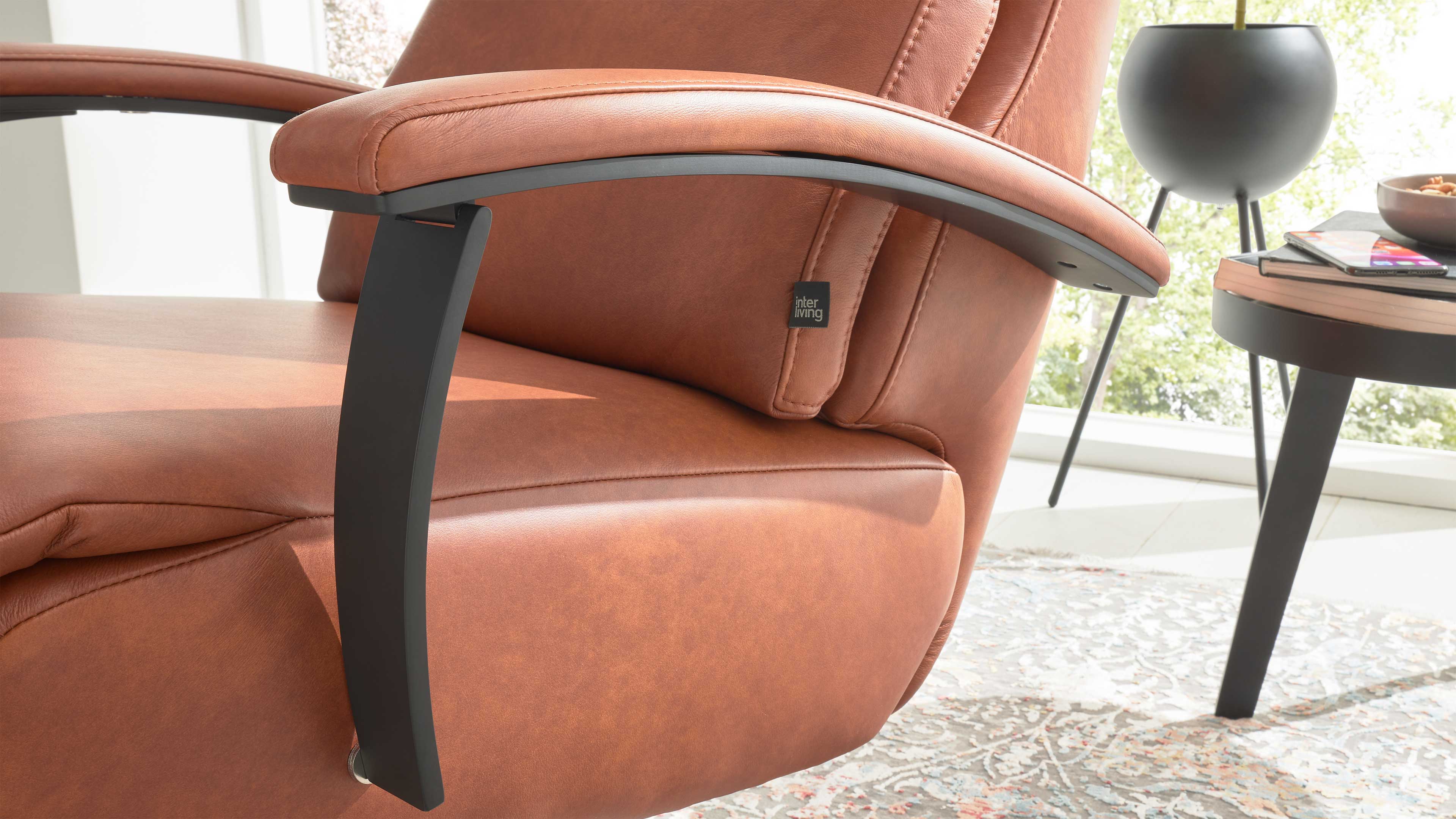 Der Relaxsessel mit manueller Relaxfunktion aus der Interliving Sessel Serie 4541 vereint edles Design mit hochwertigem Sitzkomfort. Der cognacfarbene LongLife-Lederbezug mit feiner Struktur in eleganter 2-Ton-Optik verleiht dem Sessel eine warme, luxuriöse Ausstrahlung. Der mattschwarze Metall-Sternfuß sorgt für moderne Leichtigkeit und Stabilität. Der Sessel wird in der Ergonomiegröße Small gefertigt und verfügt über eine vollgepolsterte Armlehne (nicht wie abgebildet in Kombination mit Metall) für ein besonders harmonisches Gesamtbild.