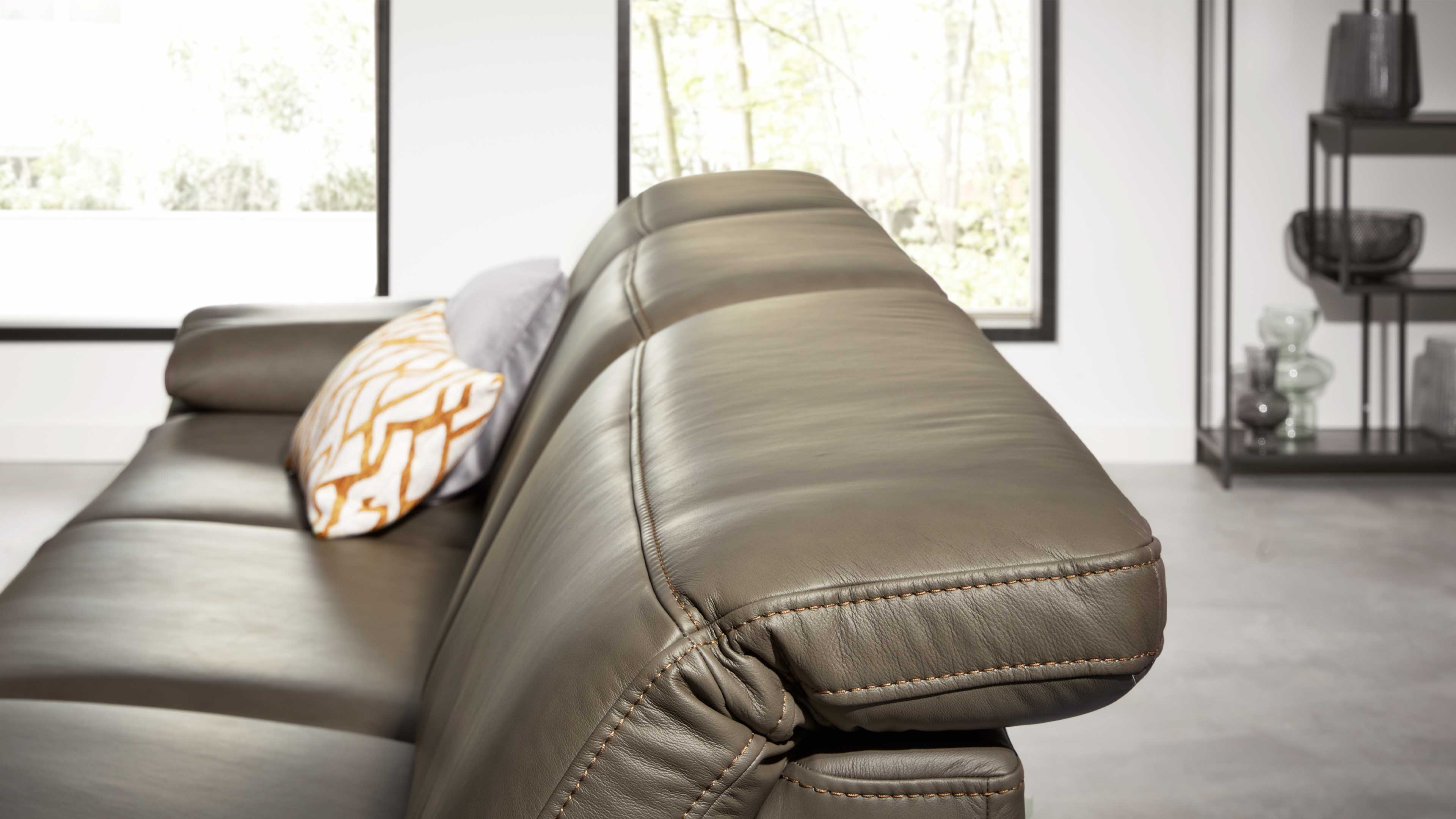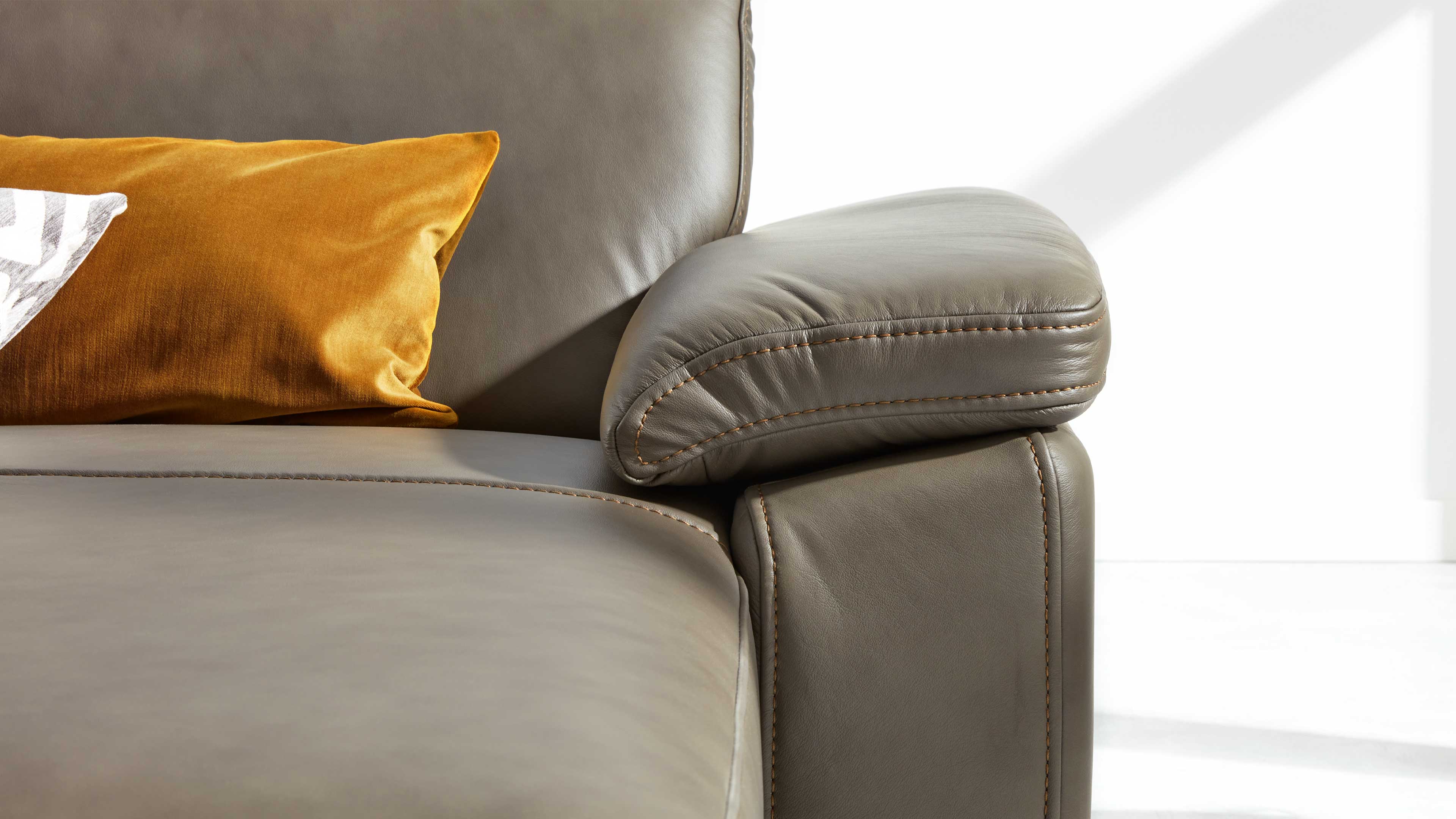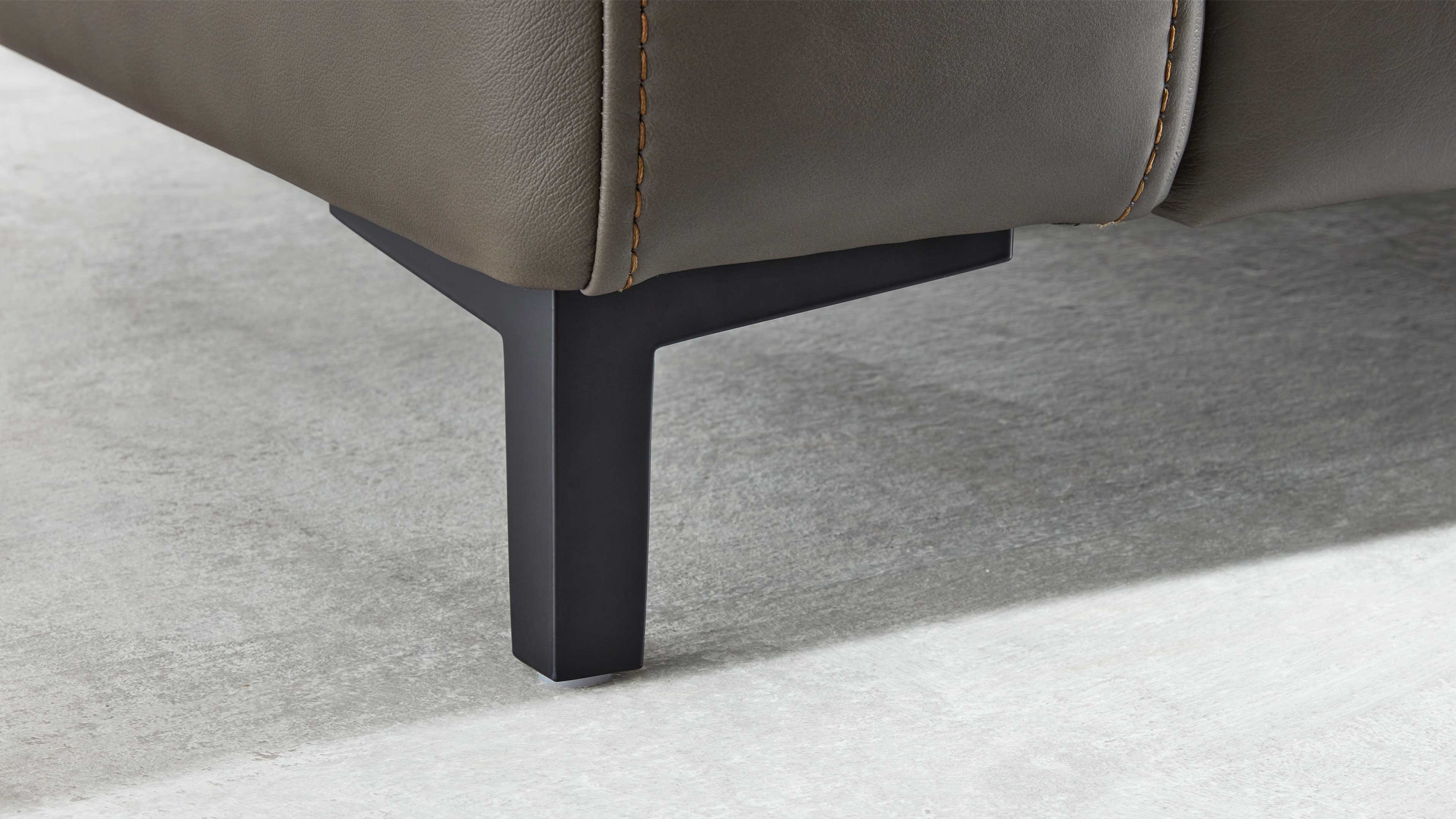 Klare Linien, Ton-in-Ton-Kappnähte und klassisch-schwarze Metall-Profilfüße unterstreichen die moderne Eleganz der Garnitur. Optional kannst du aus sieben weiteren Fußvarianten wählen oder dich für eine auffällige Kontrastnaht entscheiden, wenn du deinem Sofa eine individuelle Note verleihen möchtest.