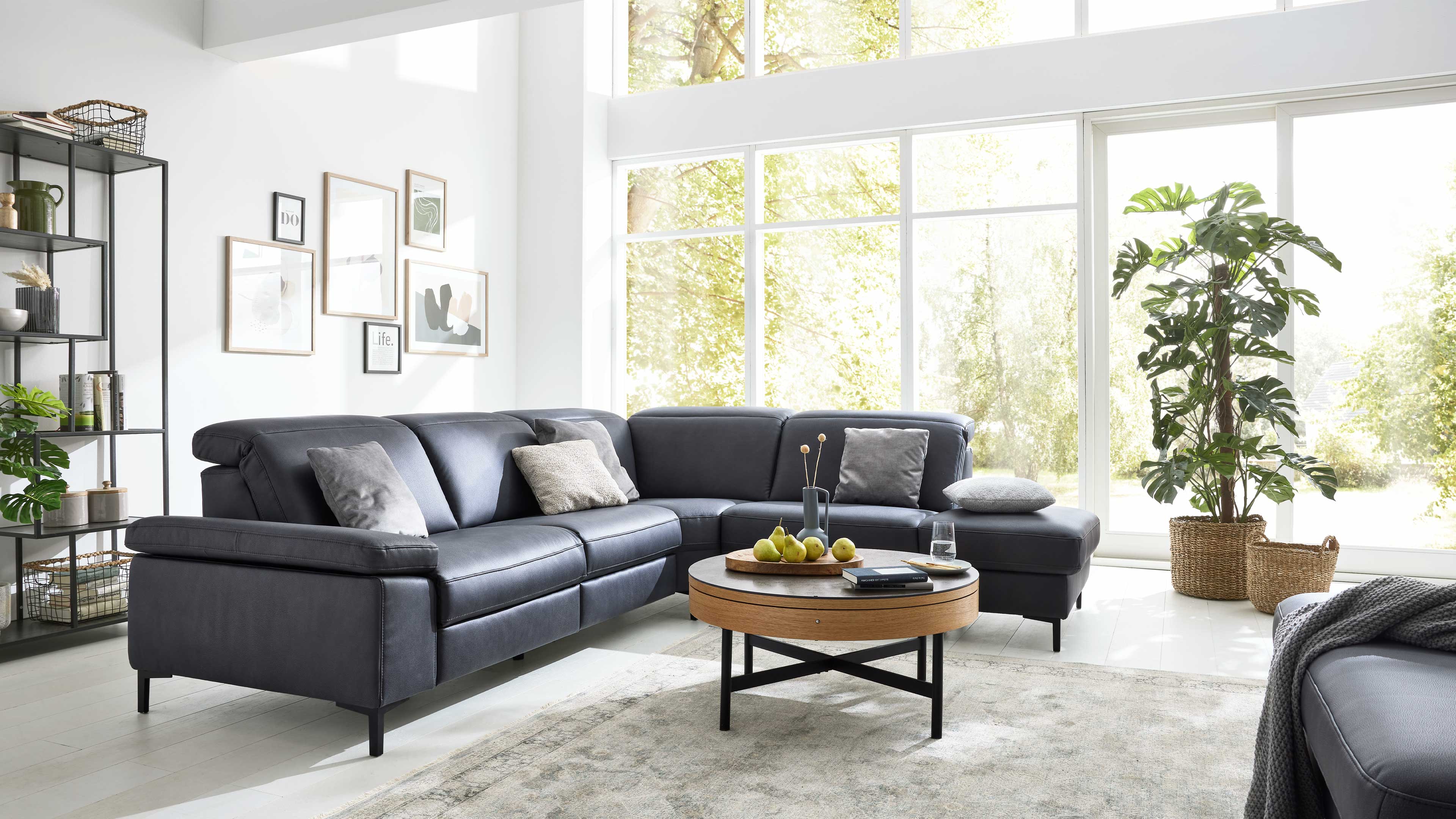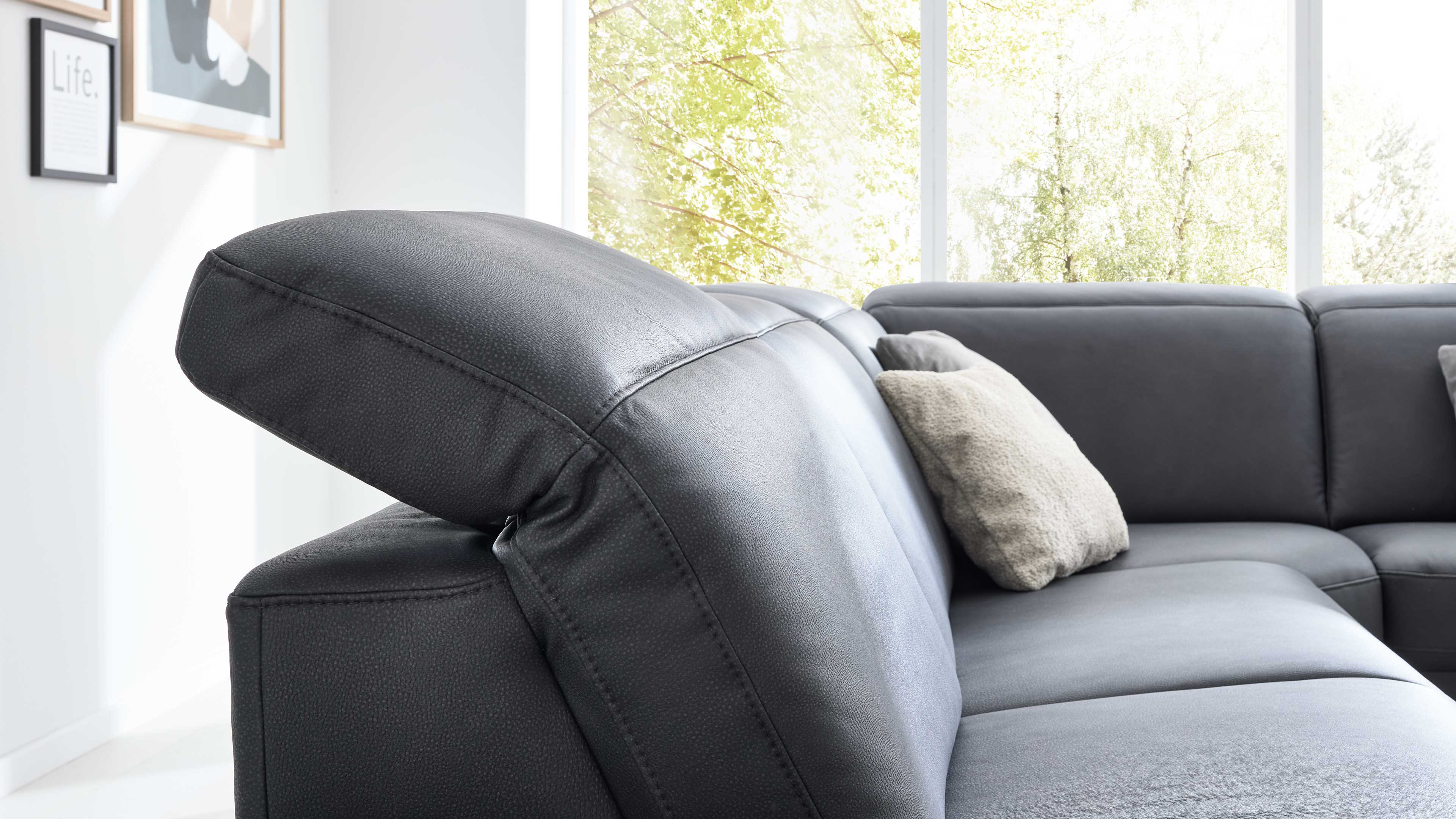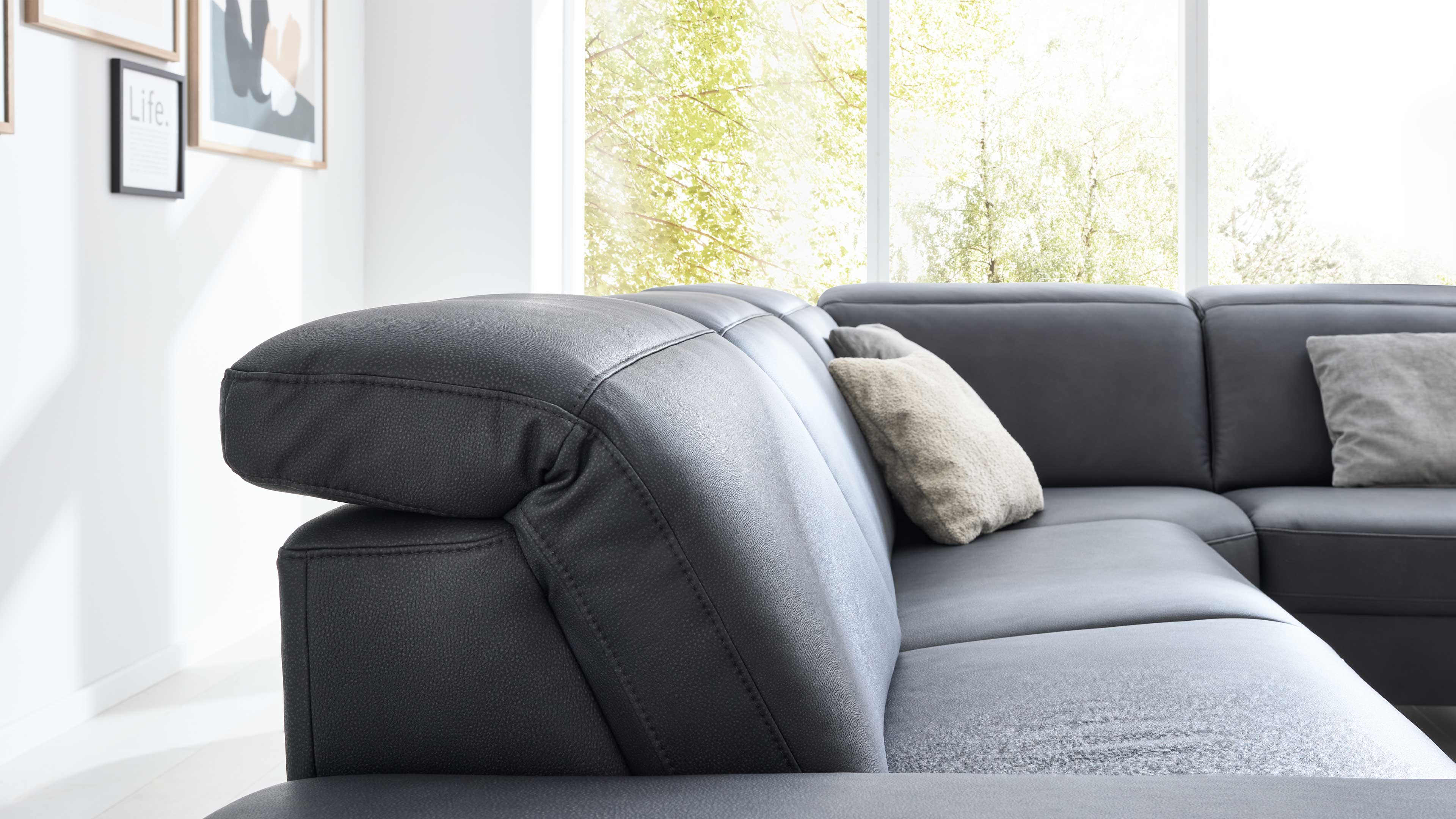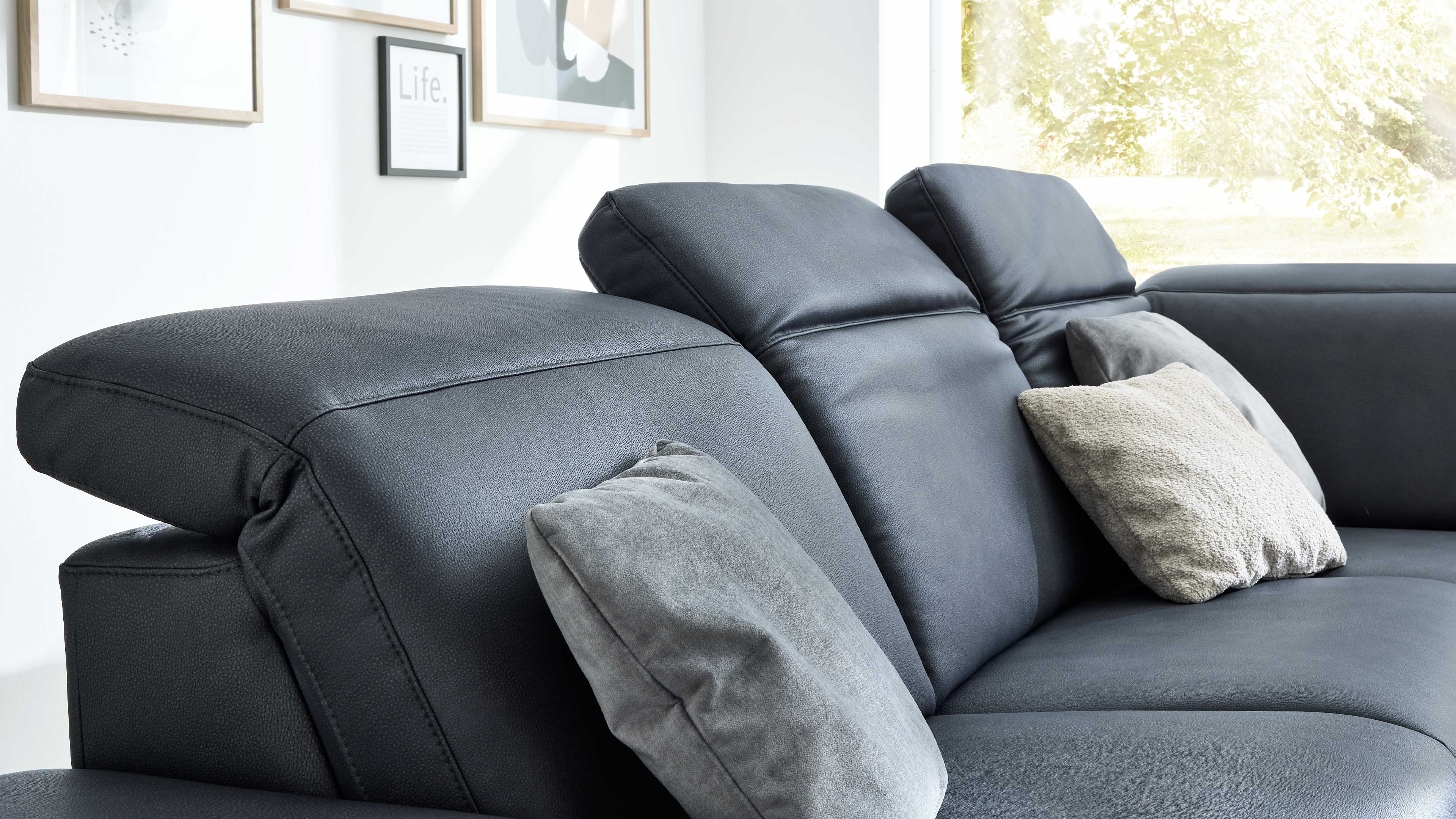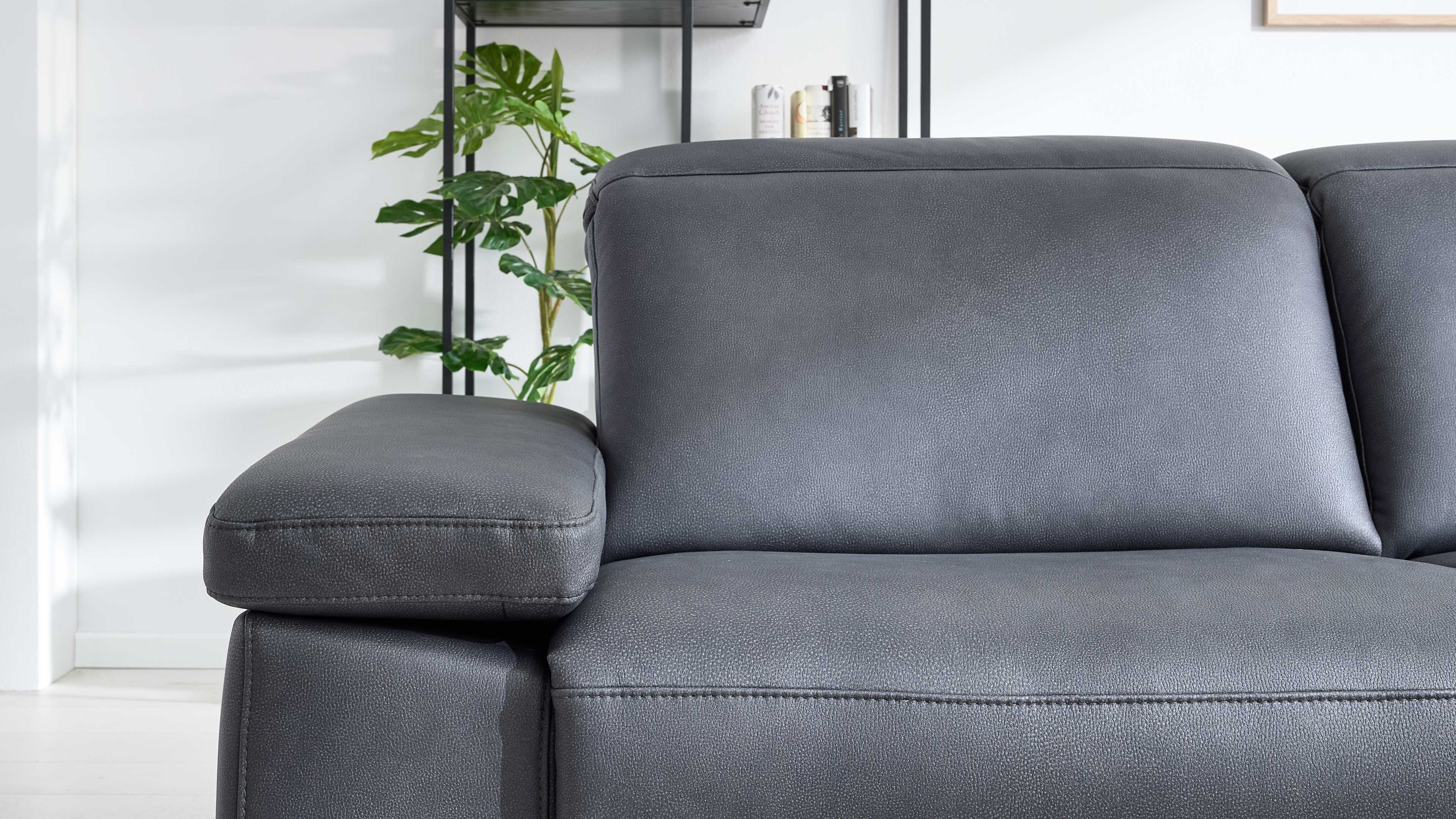 Die Eckkombination besteht aus einem 2,5-Sitzer mit Armlehne links, einer Rundecke und einem 1,5-Sitzer mit offenem Abschluss und Armlehne rechts. Die manuelle Kopfpolsterverstellung mit Rasterbeschlag ermöglicht dir, die Neigung individuell einzustellen – für ergonomisches Sitzen und entspannte Lesepositionen. Optional kannst du dein Sofa mit weiteren Komfortfunktionen ausstatten – von manuellen bis zu motorischen Relaxfunktionen.