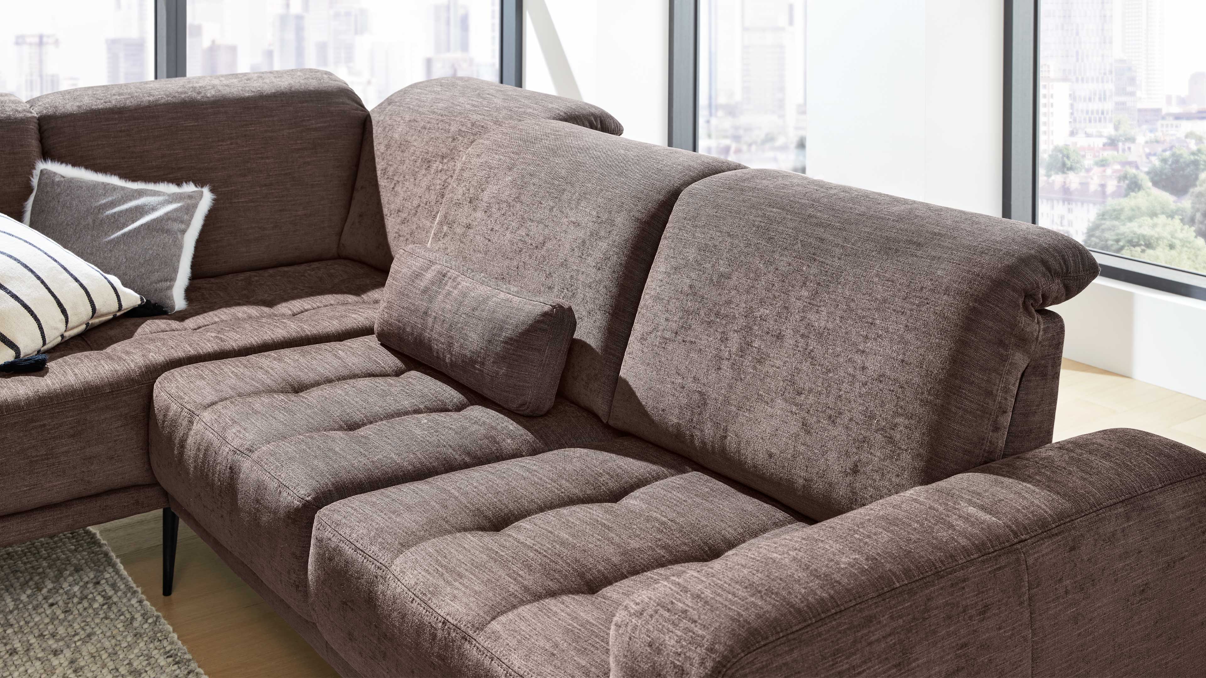 Für zusätzlichen Komfort lässt sich das Ecksofa optional mit verstellbaren Kopfstützen ausstatten – perfekt für ergonomisches Sitzen und entspanntes Zurücklehnen.