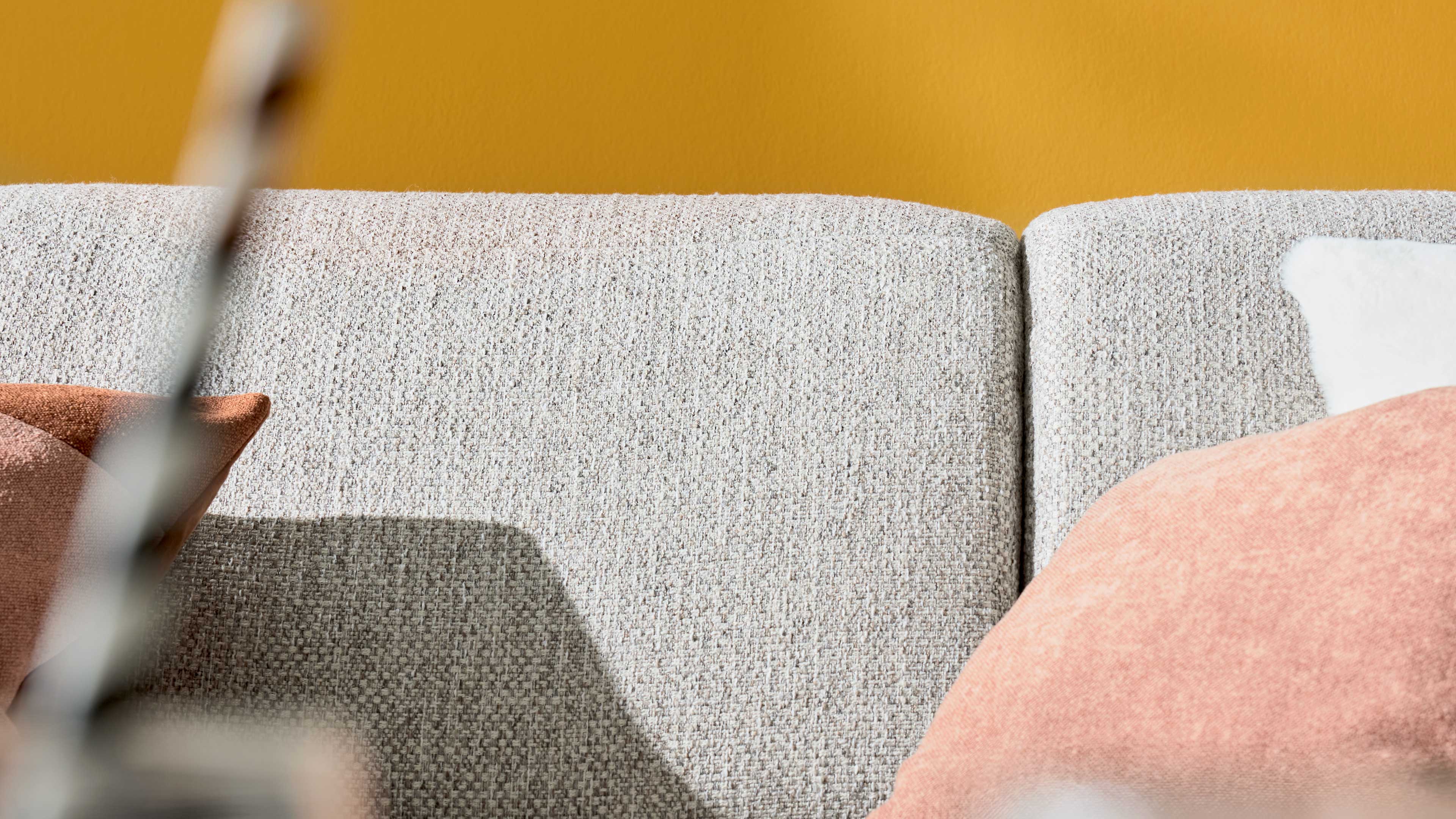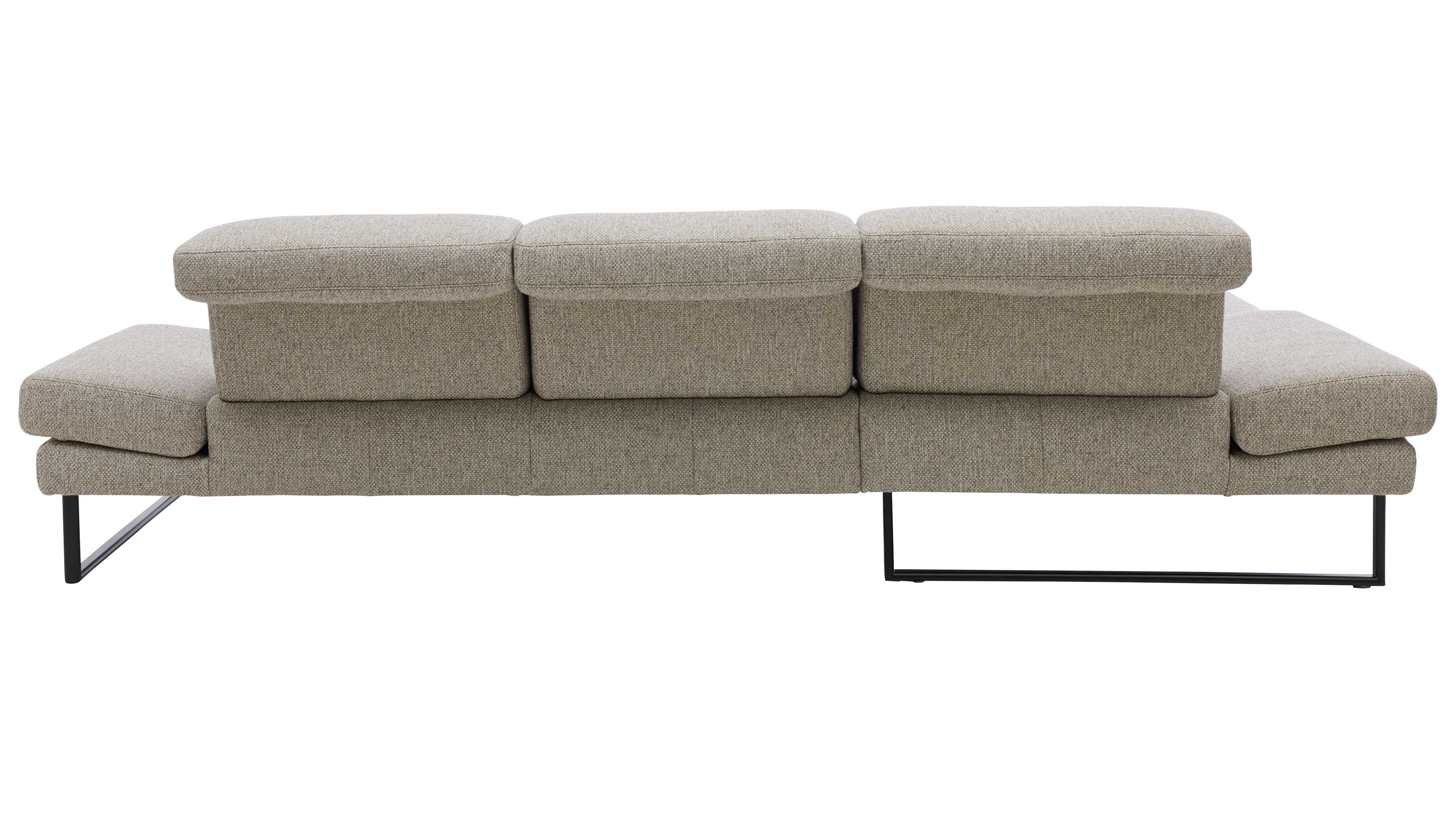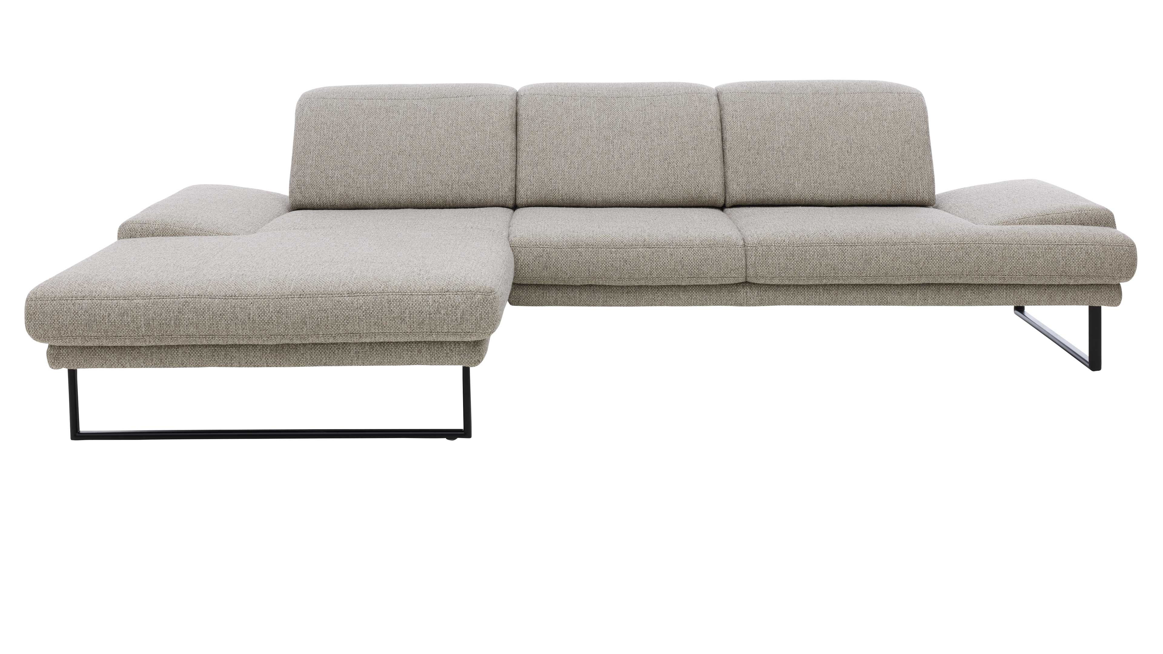 Der zeitlose Webstoff in Silbergrau trifft auf filigrane Metallrundfüße in Schwarz und verleiht dem Sofa eine leichte, moderne Anmutung. Die Kombination wirkt elegant und zugleich wohnlich – für eine Couchlandschaft, die sich nahtlos in zeitgemäße Einrichtungsstile einfügt.
