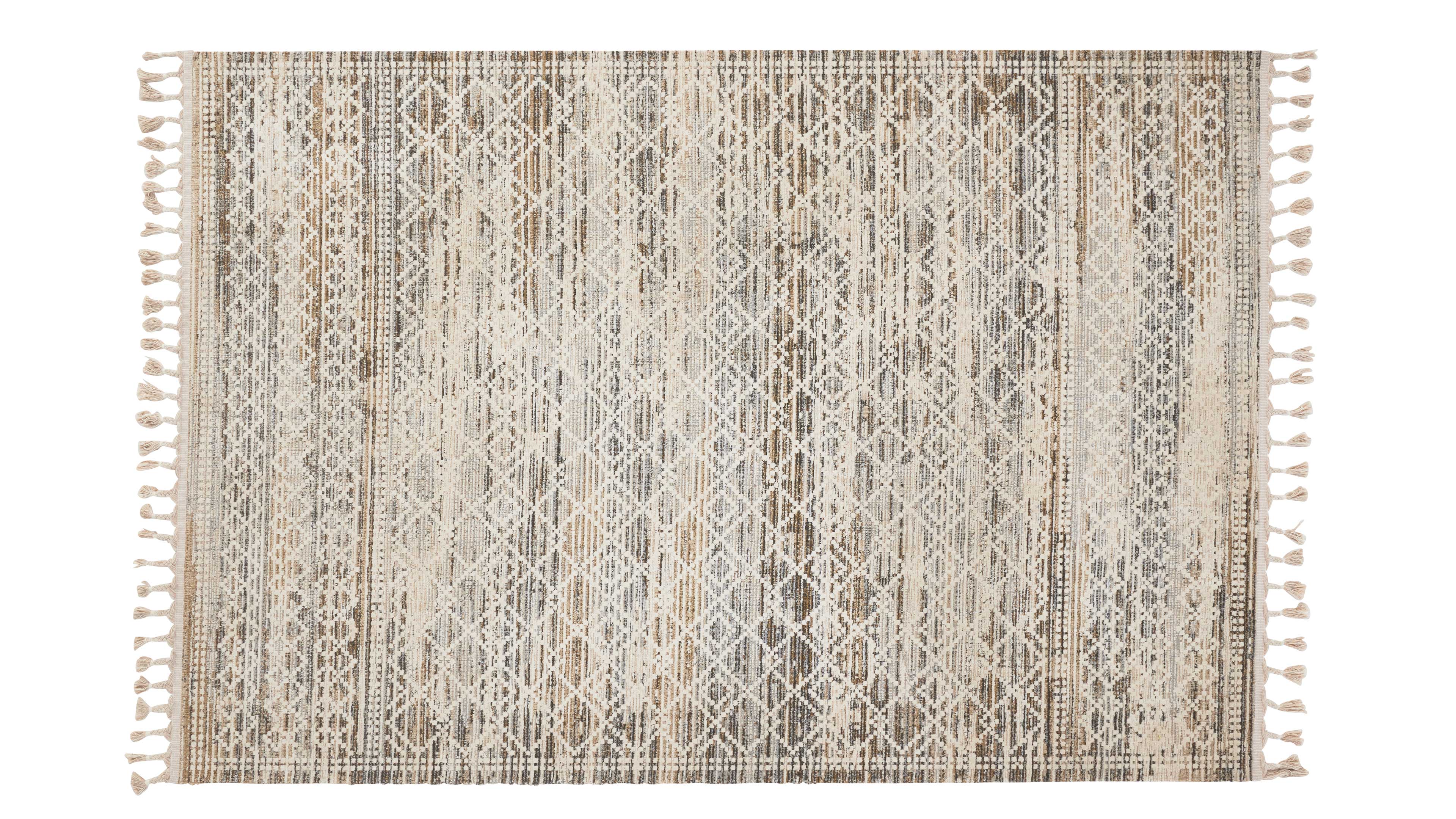 Das Vintagemuster in Naturtönen verleiht dem Teppich seine moderne, zugleich gemütliche Ausstrahlung. Die dekorativen Fransen setzen charmante Akzente und sorgen für eine leichte, verspielte Optik – ein stilvoller Blickfang, der jedes Wohnkonzept abrundet.