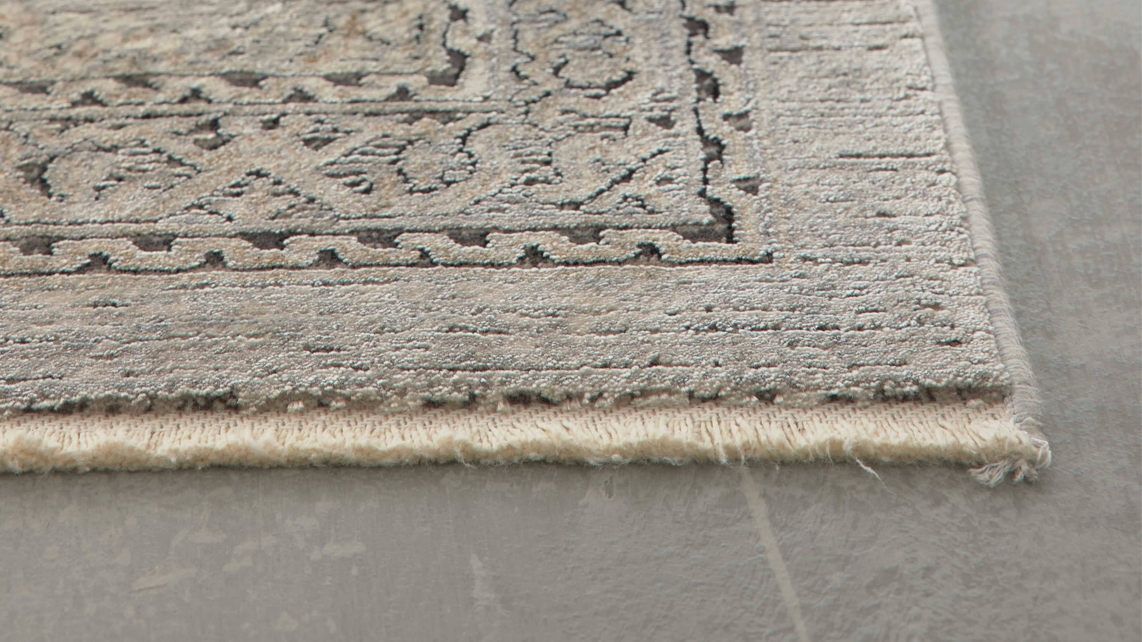 Der maschinell gewebte Teppich besteht aus einem edlen Mischgewebe aus 80 % Viskose und 20 % Acrylgarn. Diese Kombination sorgt für eine besonders weiche Oberfläche und gleichzeitig hohe Widerstandsfähigkeit. Mit einer Grammatur von ca. 2.700 g/m² und einer Florhöhe von ca. 6 mm bietet er angenehmen Gehkomfort bei stabiler Form. Seine Maße betragen ca. 133 x 190 cm (BxL) – ideal für Wohn- oder Esszimmer.