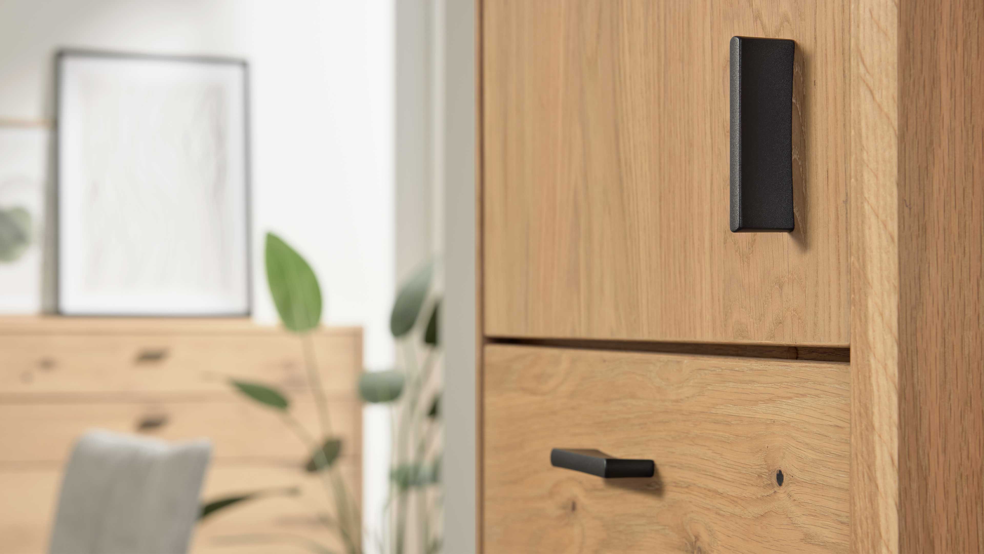 Der Schrank aus der Interliving Wohnzimmer Serie 2024 vereint hochwertiges Eichefurnier mit dezenten anthrazitfarbenen Griffen zu einem eleganten Gesamtbild. Das klare, geradlinige Design wirkt modern und zeitlos zugleich – perfekt, um sich harmonisch in unterschiedliche Wohnstile einzufügen, ob modern, klassisch oder skandinavisch inspiriert. Ein stilvoller Einzelschrank, der durch Funktionalität, Natürlichkeit und Formschönheit überzeugt.