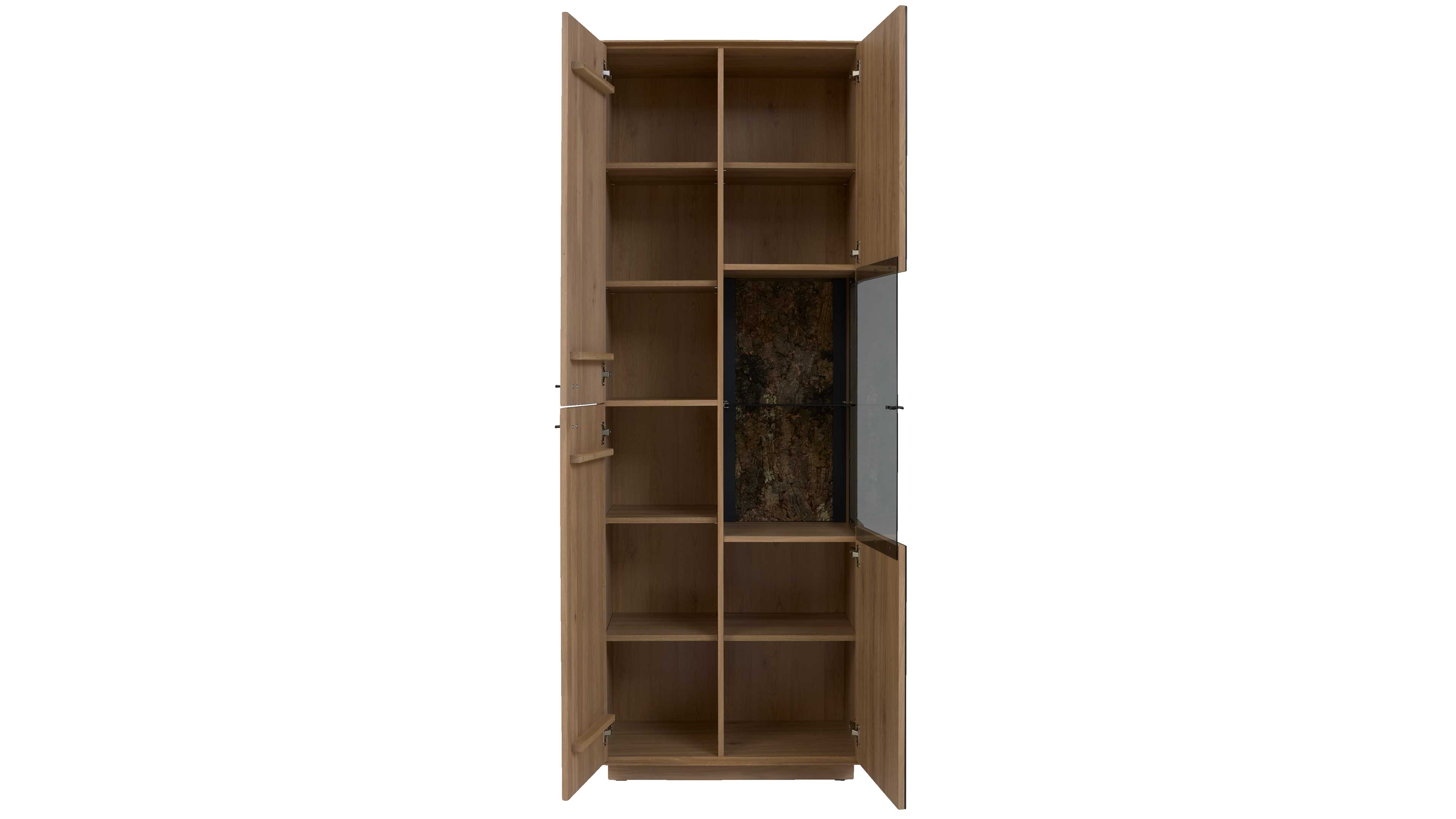 TV-Board, hohe zweiteilige Vitrine, Highboard und Wandpaneel in Wildeiche mit Frontakzenten in Dunkelgrau