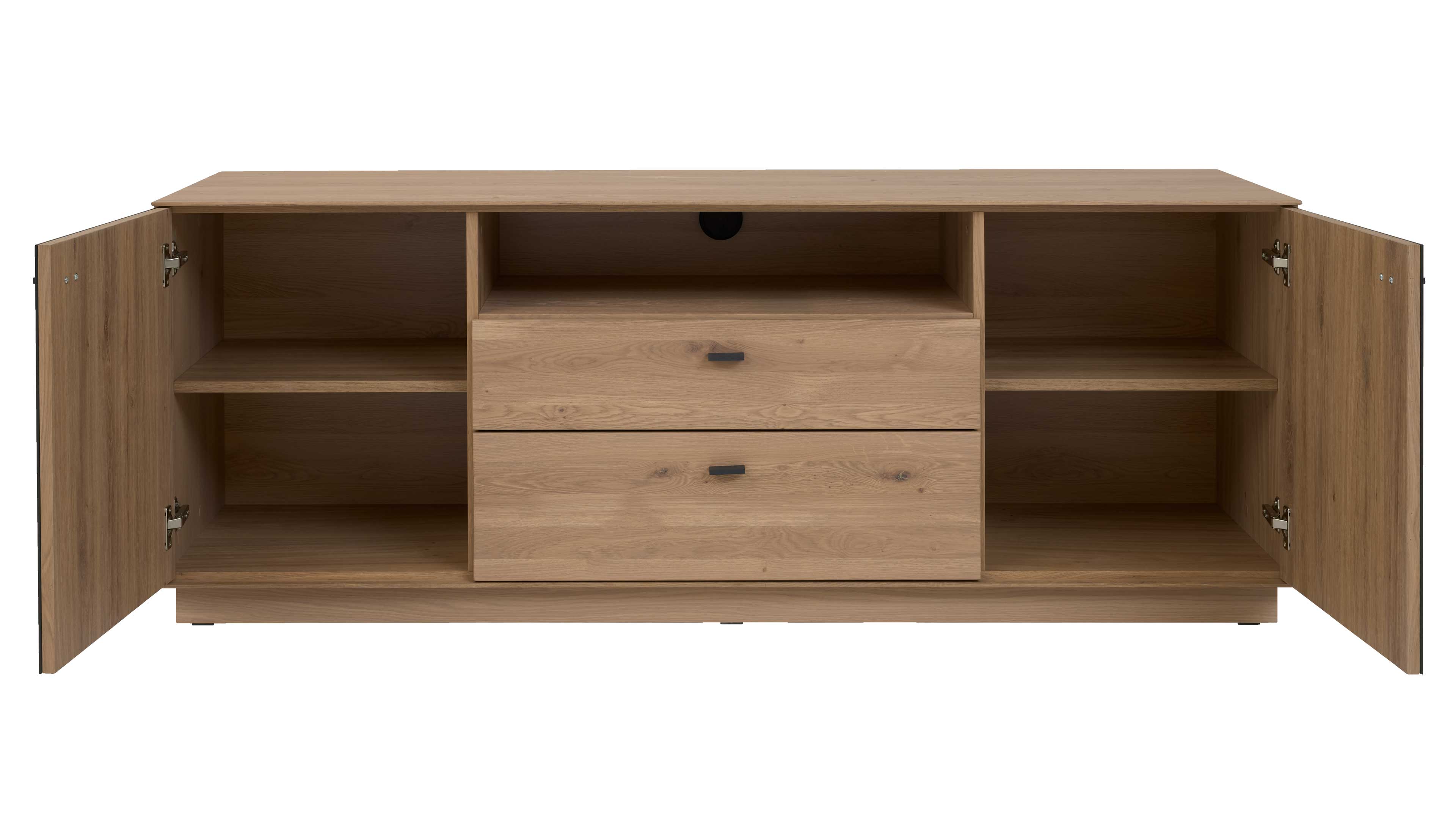 Das TV-Unterteil bietet mit ca. 165 x 62 x 50 cm (BxHxT) viel Platz für Technik und Zubehör. Es verfügt über zwei Türen, ein offenes Fach und zwei Schubladen, die durch ihre Softclose-Funktion besonders komfortabel in der Handhabung sind.