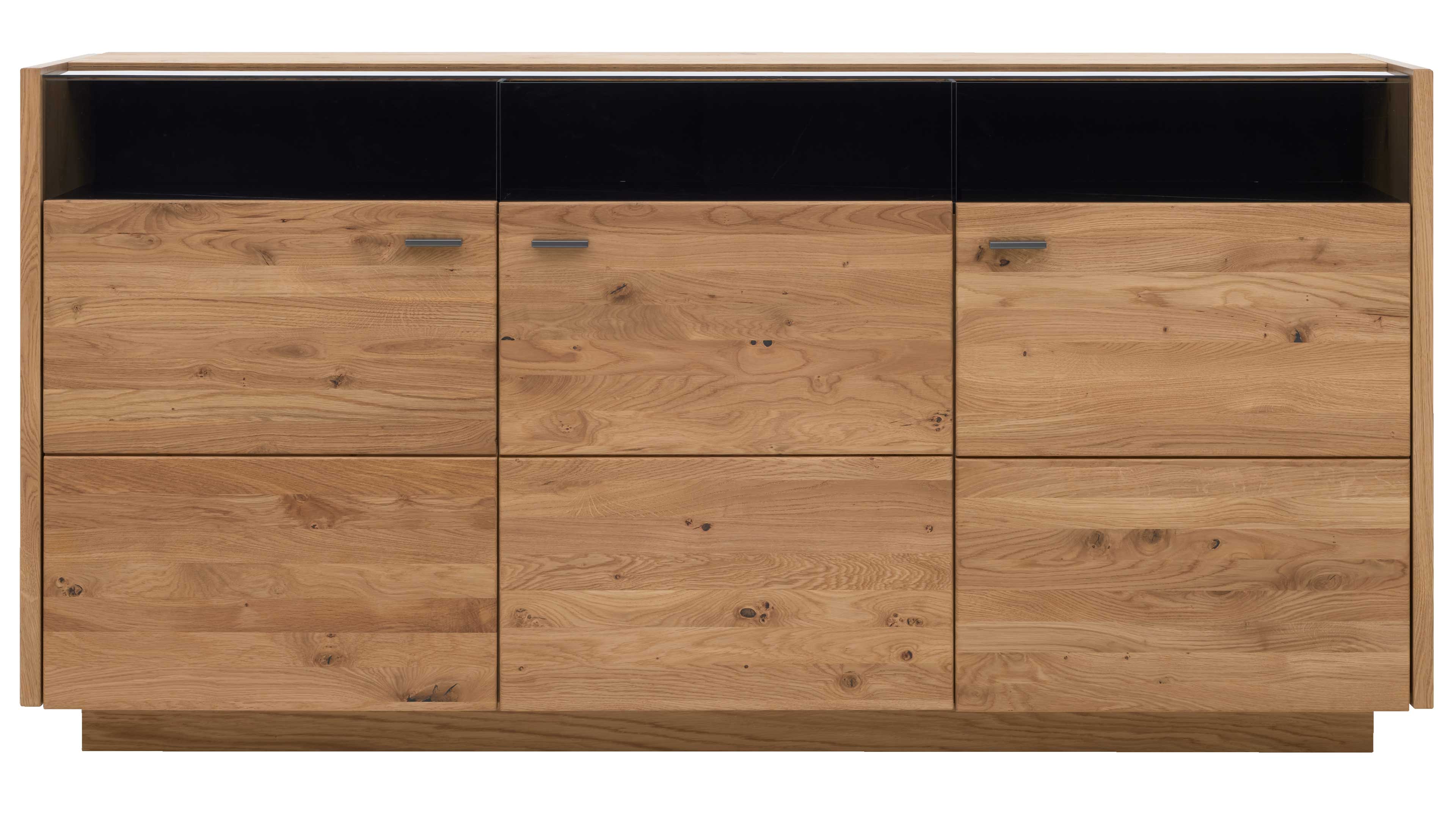 Hinter den drei Türen, jeweils mit einem Holzeinlegeboden, sowie in den drei Fächern hinter Parsolglas bietet das Sideboard jede Menge Platz für Geschirr, Tischwäsche, Bücher oder dekorative Accessoires. Die Kombination aus offenen und geschlossenen Bereichen sorgt für Übersicht, Ordnung und ein modernes, leichtes Erscheinungsbild.
