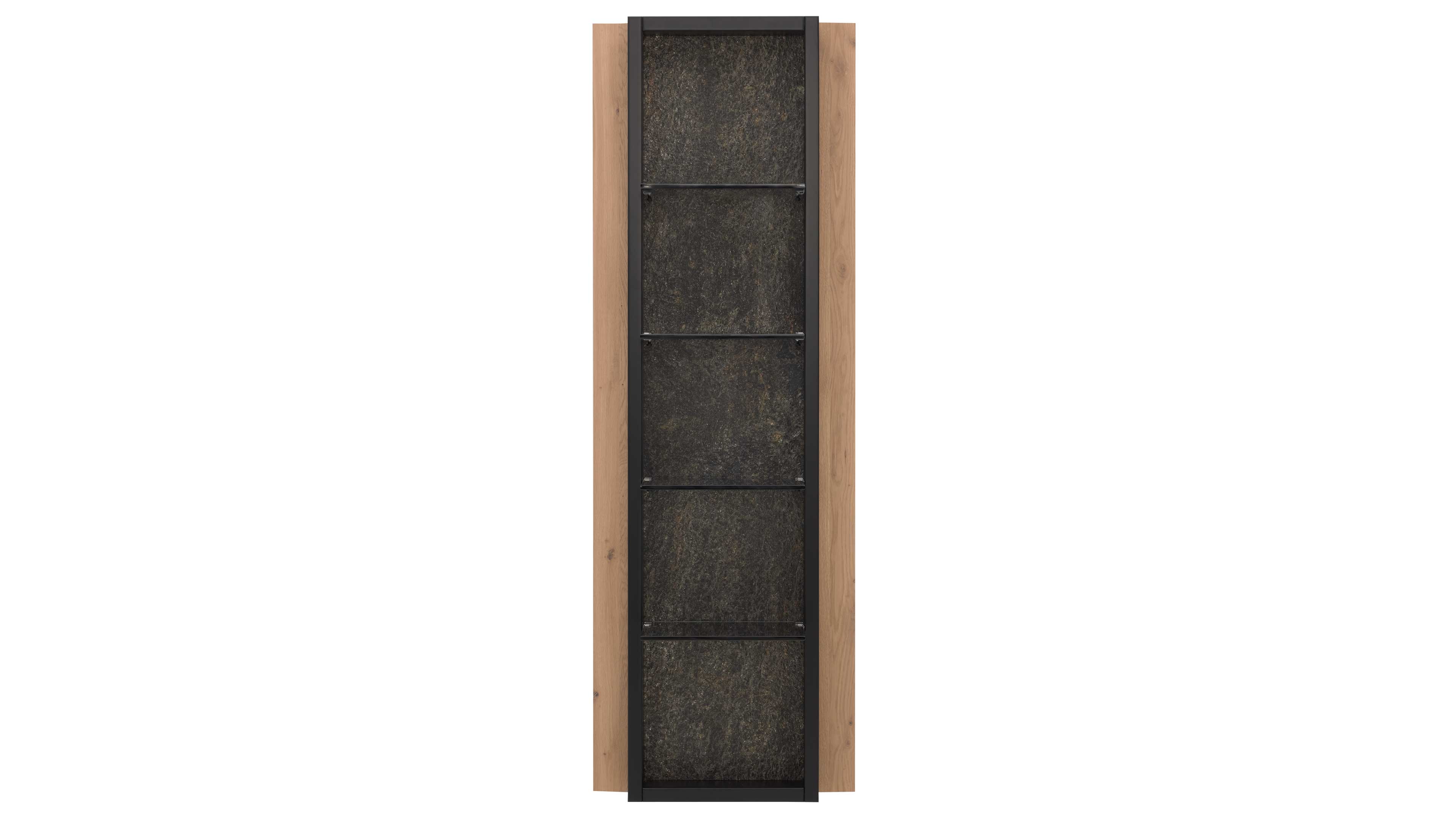 Wandregal mit vier Glasböden und Metallrahmen mit Akzenten in Wildeiche