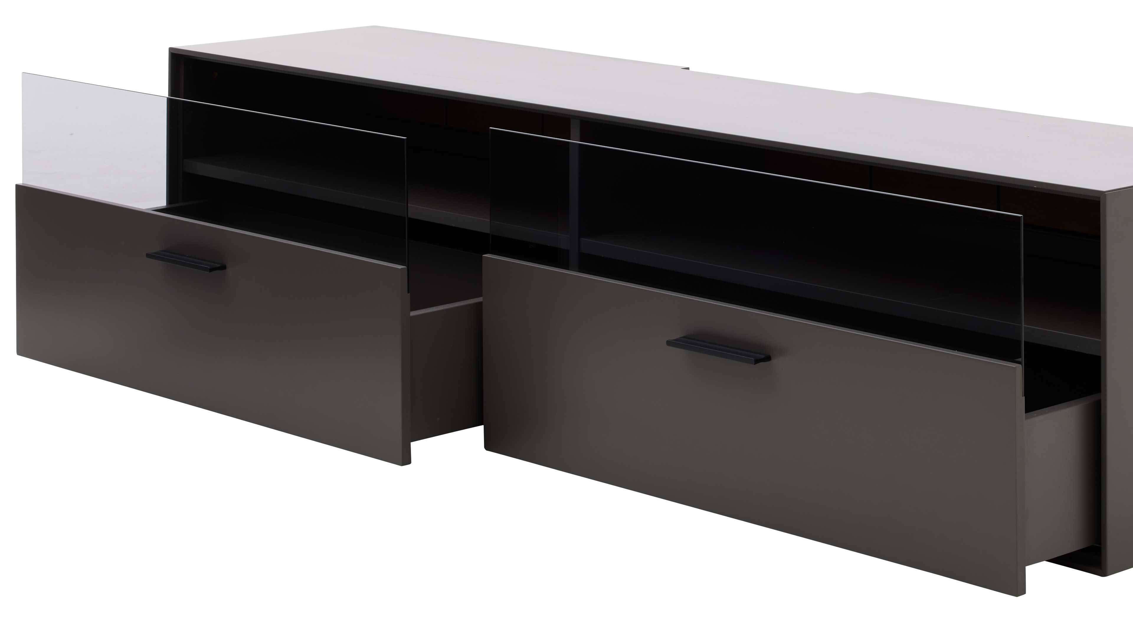 Hängendes TV-Board mit Vitrine und zwei Wandpaneelen in Dunkelgrau mit Spaltholz-Akzenten