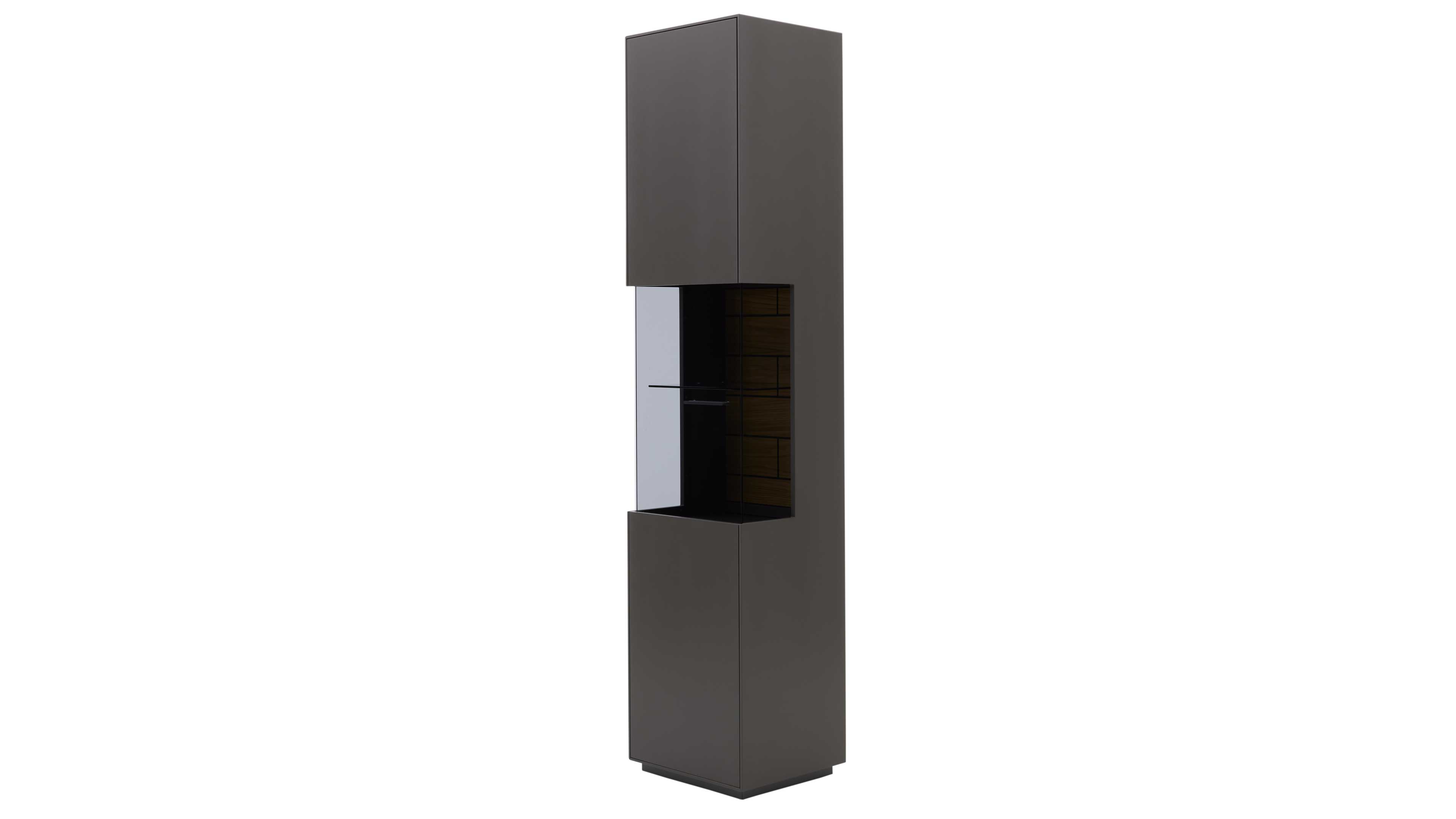 Die Vitrine aus der Interliving Wohnzimmer Serie 2030 vereint modernes Design mit praktischer Aufteilung – perfekt als stilvoller Glasschrank, Einzelvitrine oder eleganter Solitär im Wohn- oder Esszimmer. Die wolframgrauen Lackoberflächen verleihen dem Möbelstück eine ruhige, edle Ausstrahlung. Für spannende Akzente sorgen graues Parsolglas, eine sichtbare Rückwand mit Spaltholz auf schwarzer MDF, ein Holzsockel sowie ein Griff aus schwarz lackiertem Metall mit feiner Struktur. So entsteht ein harmonisches Gesamtbild mit einem Hauch von Exklusivität.