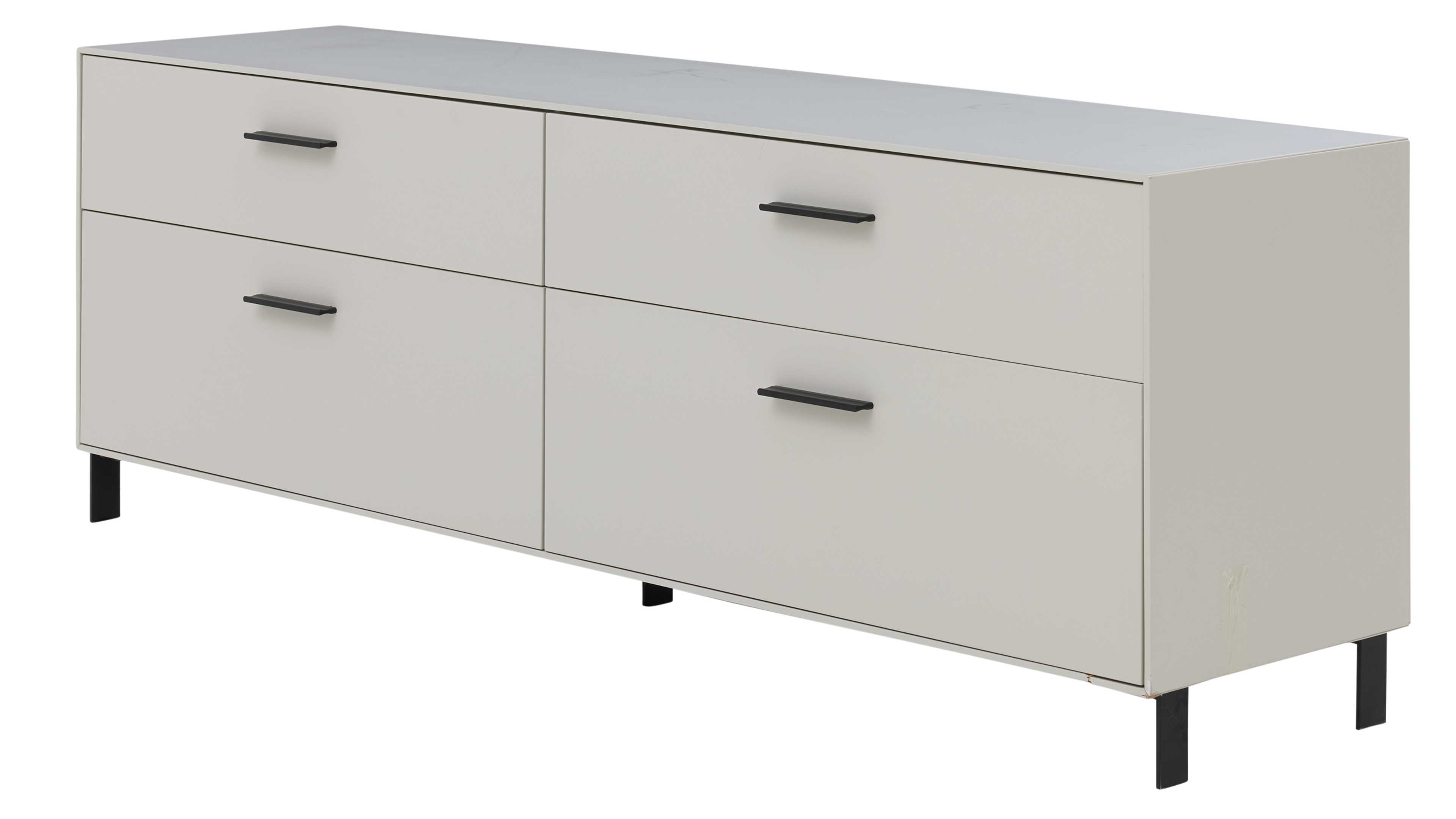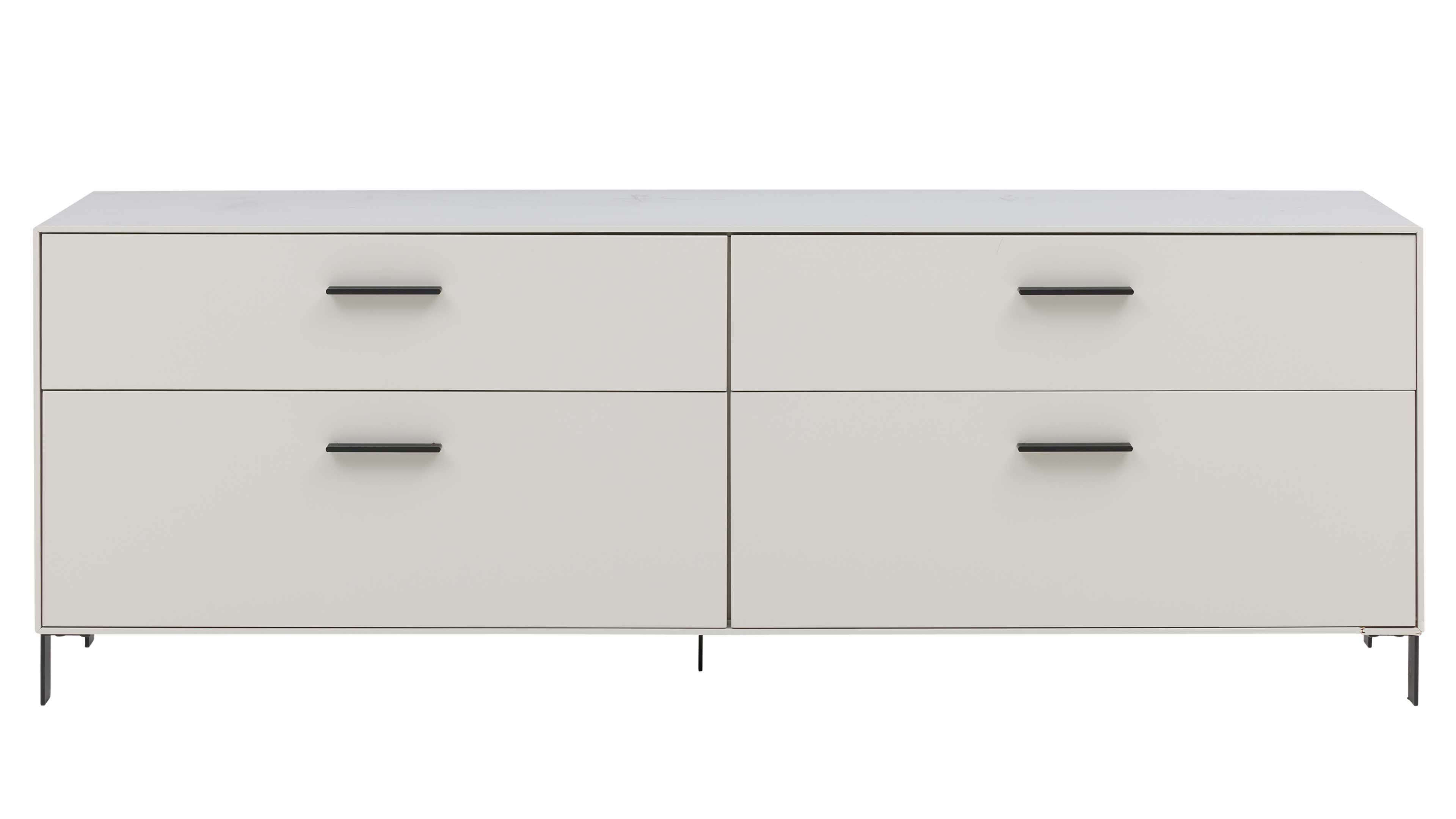 Das Lowboard aus der Interliving Wohnzimmer Serie 2030 PLUS vereint modernes Design mit cleverem Stauraumkonzept – perfekt für stilvolle Wohnräume mit Anspruch. Die Sahara cremefarbenen Lackoberflächen verleihen dem Möbelstück eine warme, elegante Note, während schwarz lackierte Metallgriffe und -füße mit Feinstruktur für einen markanten Kontrast sorgen. So entsteht ein edles Gesamtbild, das sich harmonisch in zeitgemäße Wohnkonzepte einfügt.