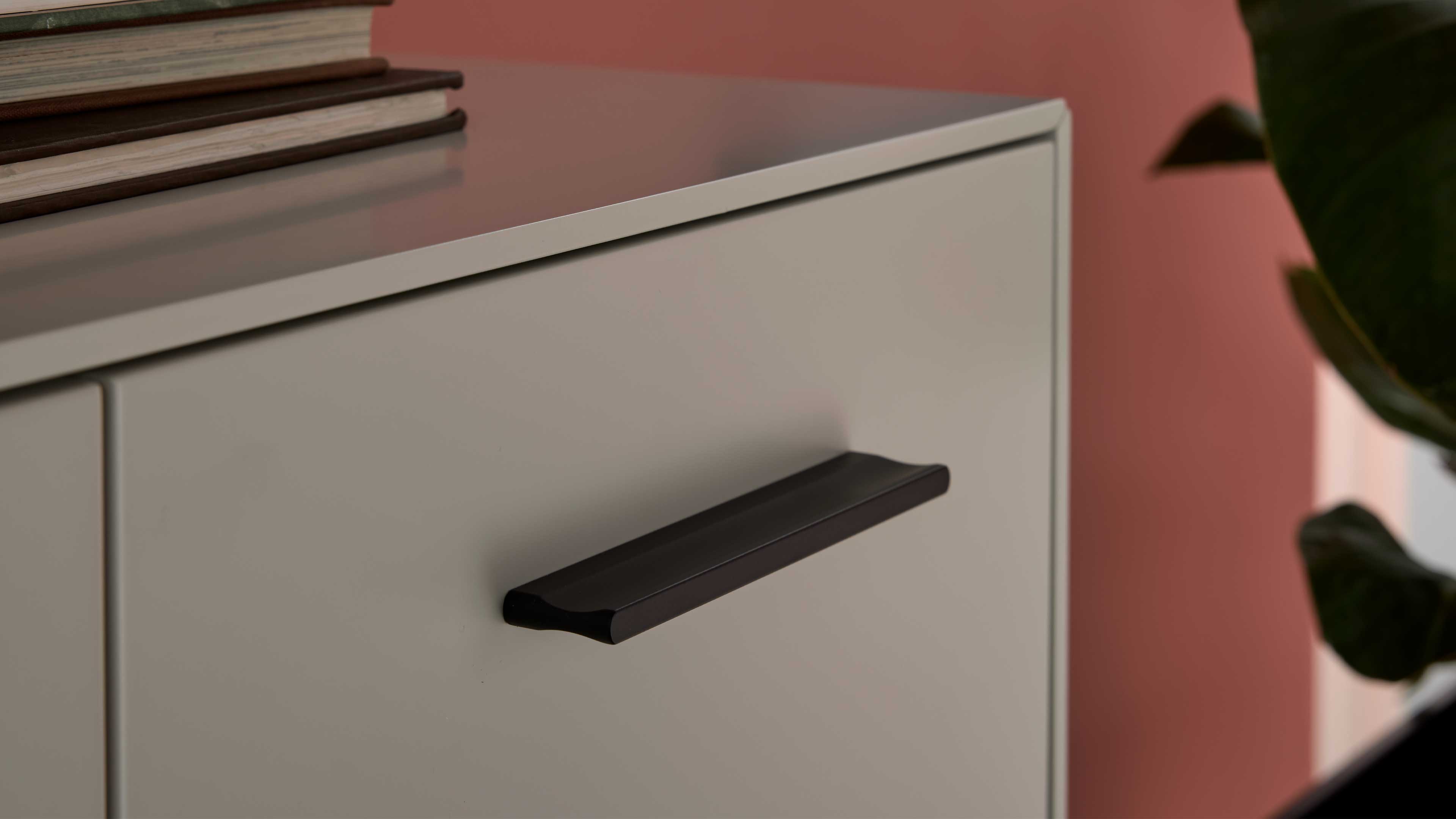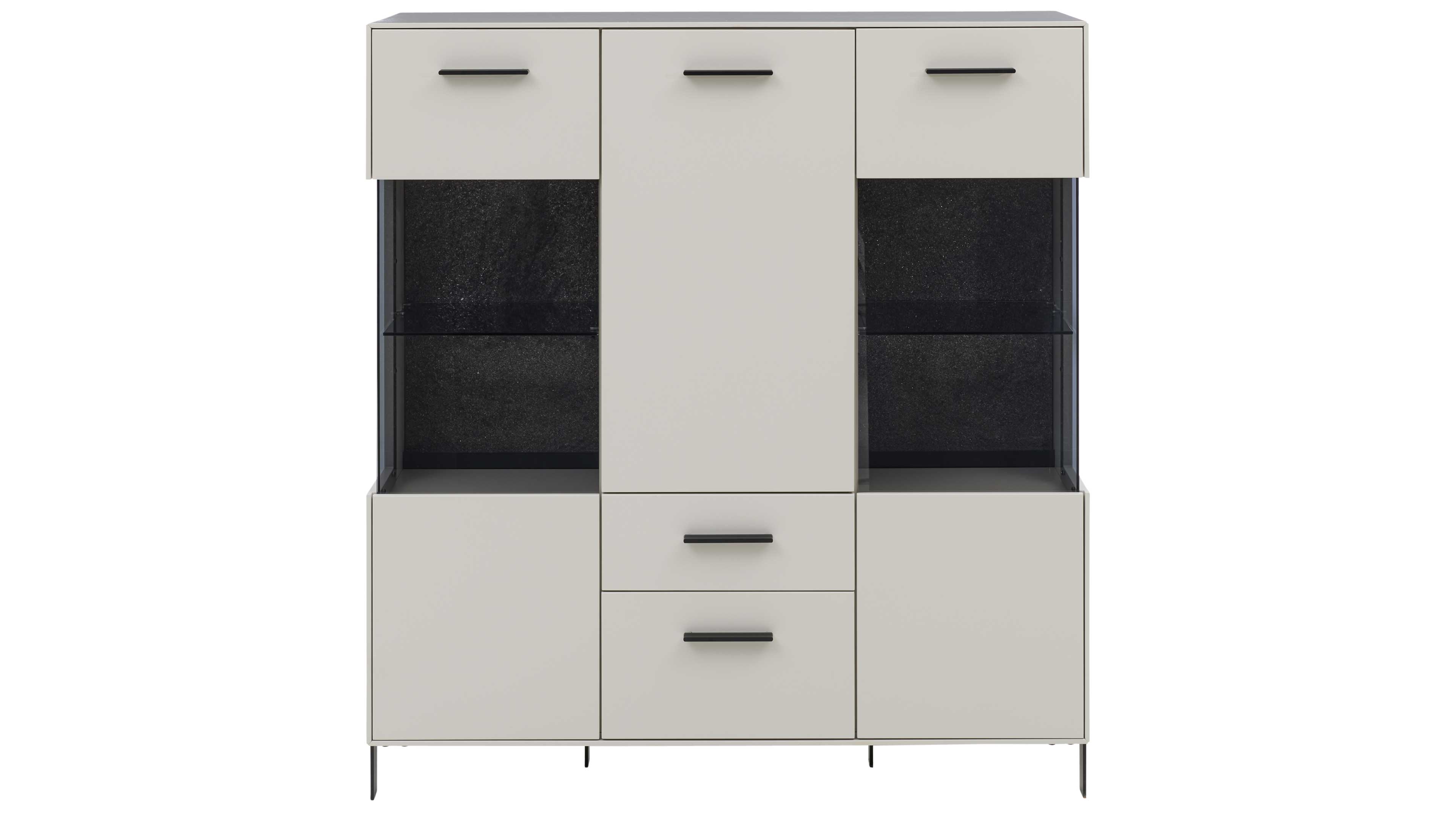 Das Highboard aus der Interliving Wohnzimmer Serie 2030 PLUS verbindet modernes Design mit funktionalem Komfort und hochwertiger Verarbeitung. Die Sahara cremefarbenen Lackoberflächen verleihen dem Möbelstück eine zeitgemäße, elegante Ausstrahlung. Für spannende Kontraste sorgen Einsätze aus grauem Parsolglas, sichtbare Rückwände mit Granit-Steinfurnier sowie Details aus schwarz lackiertem Metall mit feiner Struktur – ein Mix, der Design und Natürlichkeit perfekt vereint.