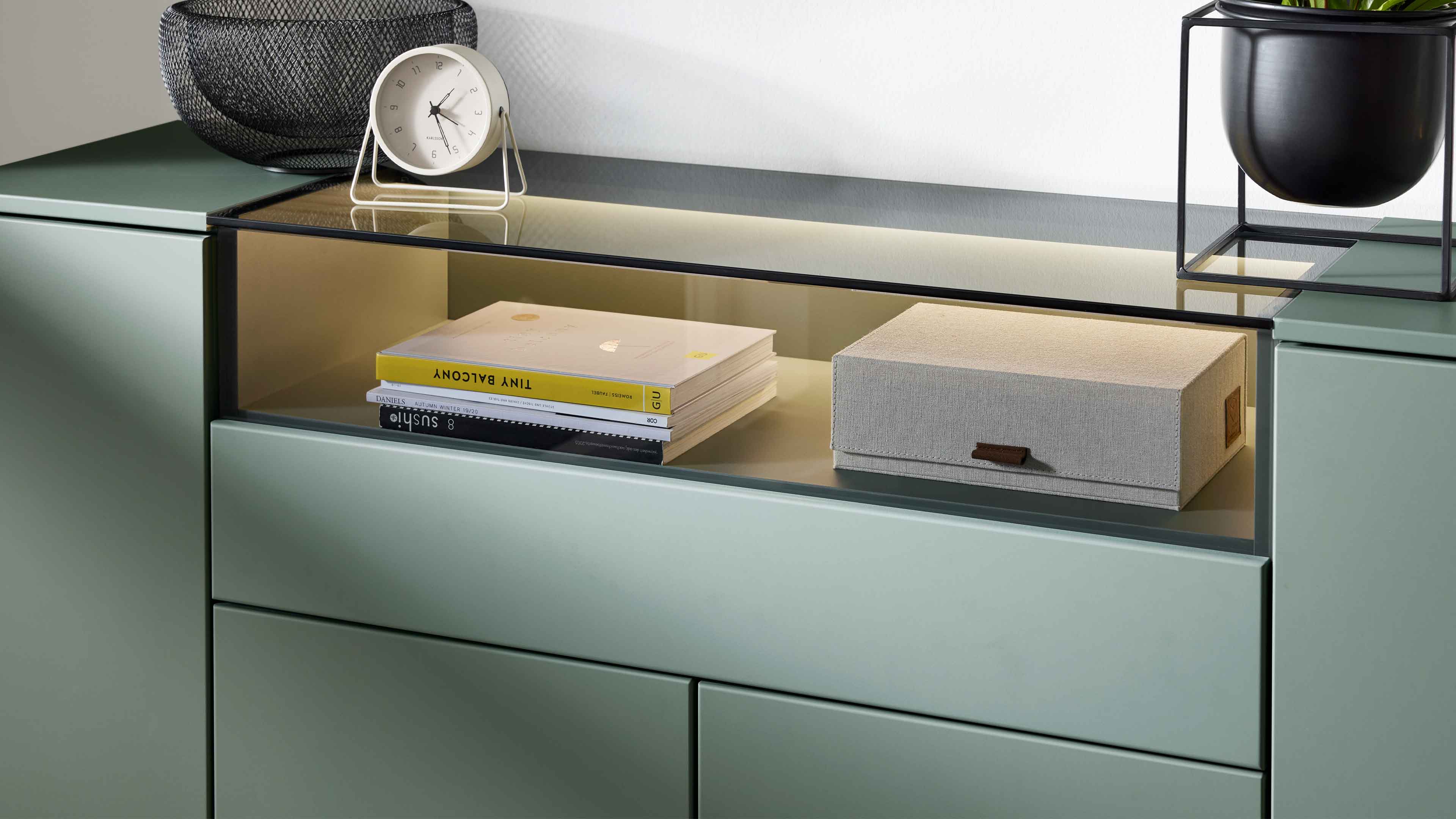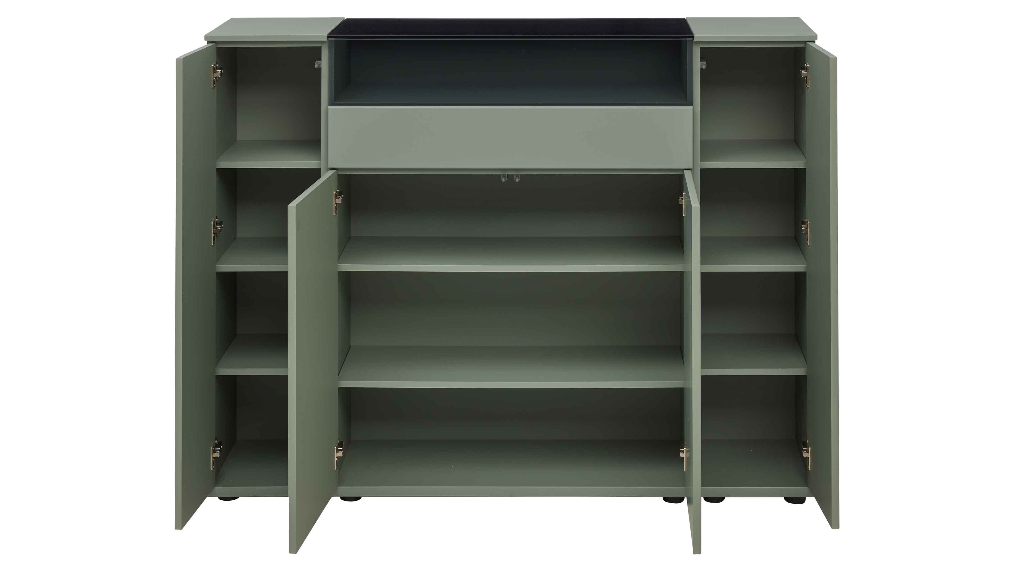 Die Melaminoberflächen der Serie sind kratzfest, UV-beständig, strapazierfähig und pflegeleicht – ideal für den täglichen Gebrauch. Die Kombination aus Schilfgrün matt und Floatglas sorgt für eine harmonische Balance aus Natürlichkeit und Eleganz und verleiht deinem Wohnraum eine moderne, individuelle Note.