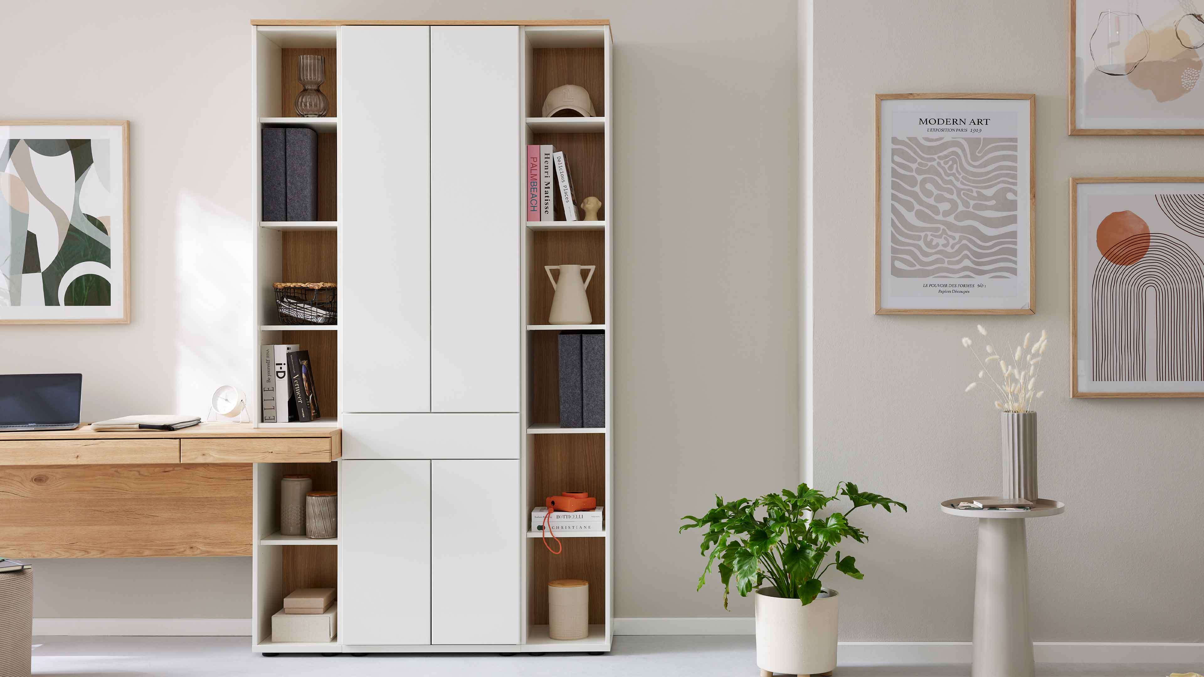 Die Homeofficelösung aus der Interliving Wohnzimmer Serie 2031 verwandelt deinen Arbeitsplatz zuhause in einen modernen, aufgeräumten und inspirierenden Ort. Die fünfteilige Kombination in mattem Tonweiß und Risseiche-Nachbildung verbindet klare Linien mit wohnlicher Natürlichkeit – perfekt für alle, die im Homeoffice Wert auf Design, Funktion und Atmosphäre legen.