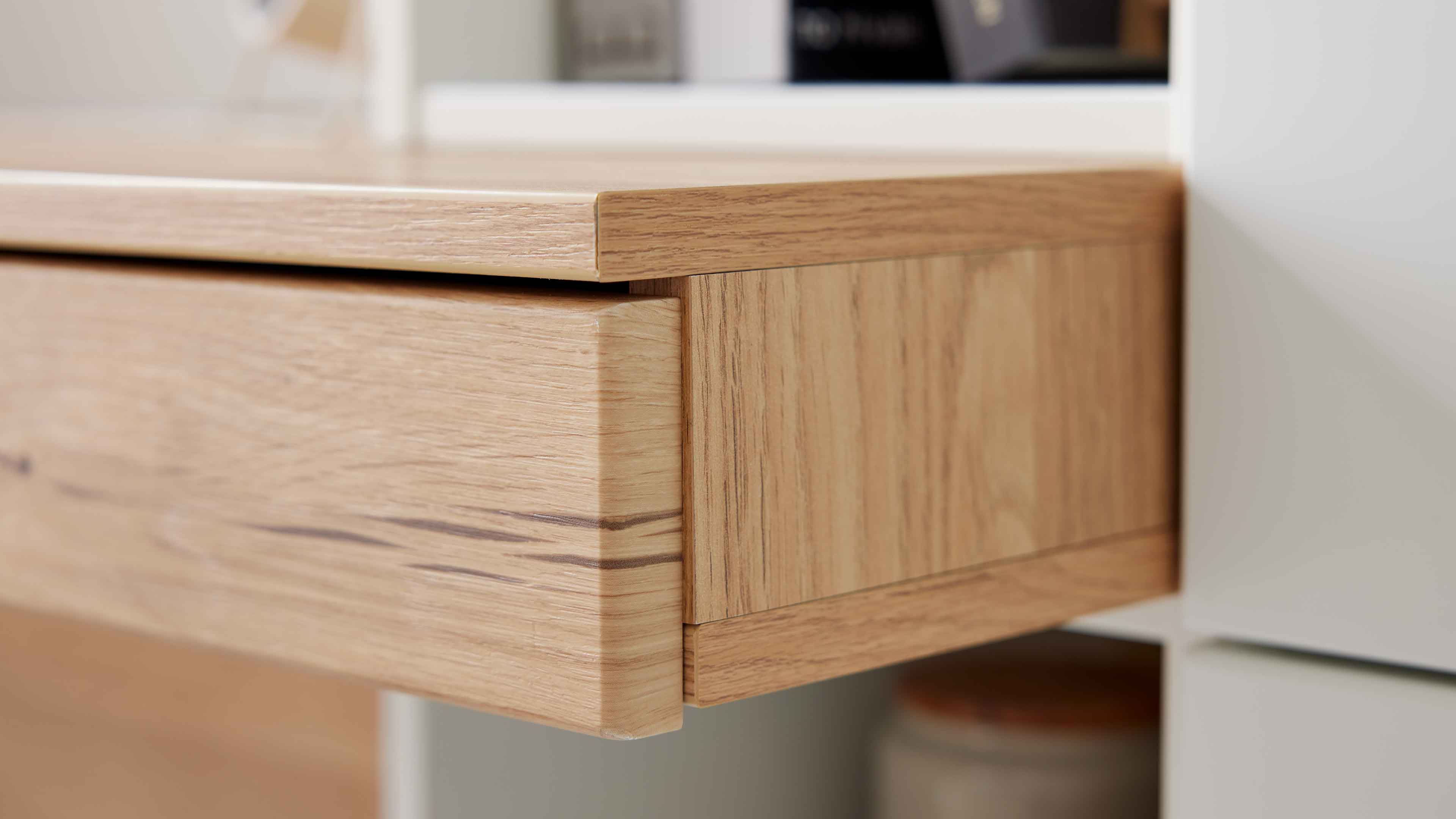 Die Oberflächen der Serie bestehen aus strapazierfähigem Melaminharz, sind kratzfest, UV-beständig und pflegeleicht – optimal für den täglichen Gebrauch im Homeoffice. Die Verbindung von Tonweiß matt und Risseiche-Nachbildung wirkt modern, freundlich und zeitlos – und fügt sich harmonisch in dein bestehendes Wohnkonzept ein.