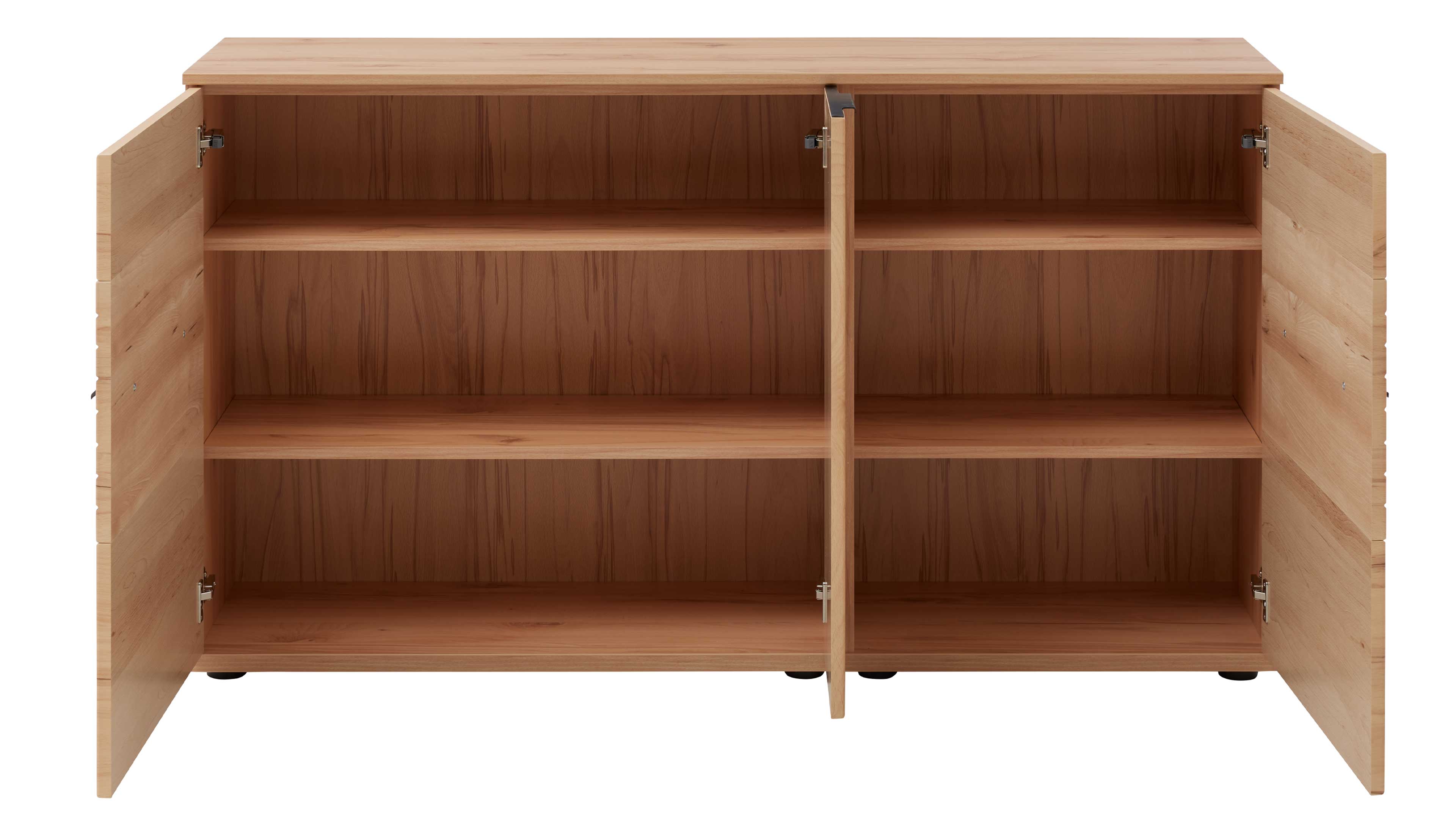 Das Sideboard setzt sich aus zwei Elementen zusammen: einem größeren Modul mit zwei Türen (links angeschlagen) und einem kleineren mit einer Tür (rechts angeschlagen). Hinter den Türen befinden sich insgesamt vier höhenverstellbare Holzböden, die dir flexible Aufbewahrungsmöglichkeiten für Geschirr, Technik oder Wohnaccessoires bieten. Dank vormontierter Korpusse ist das Möbelstück besonders schnell und stabil aufgebaut.