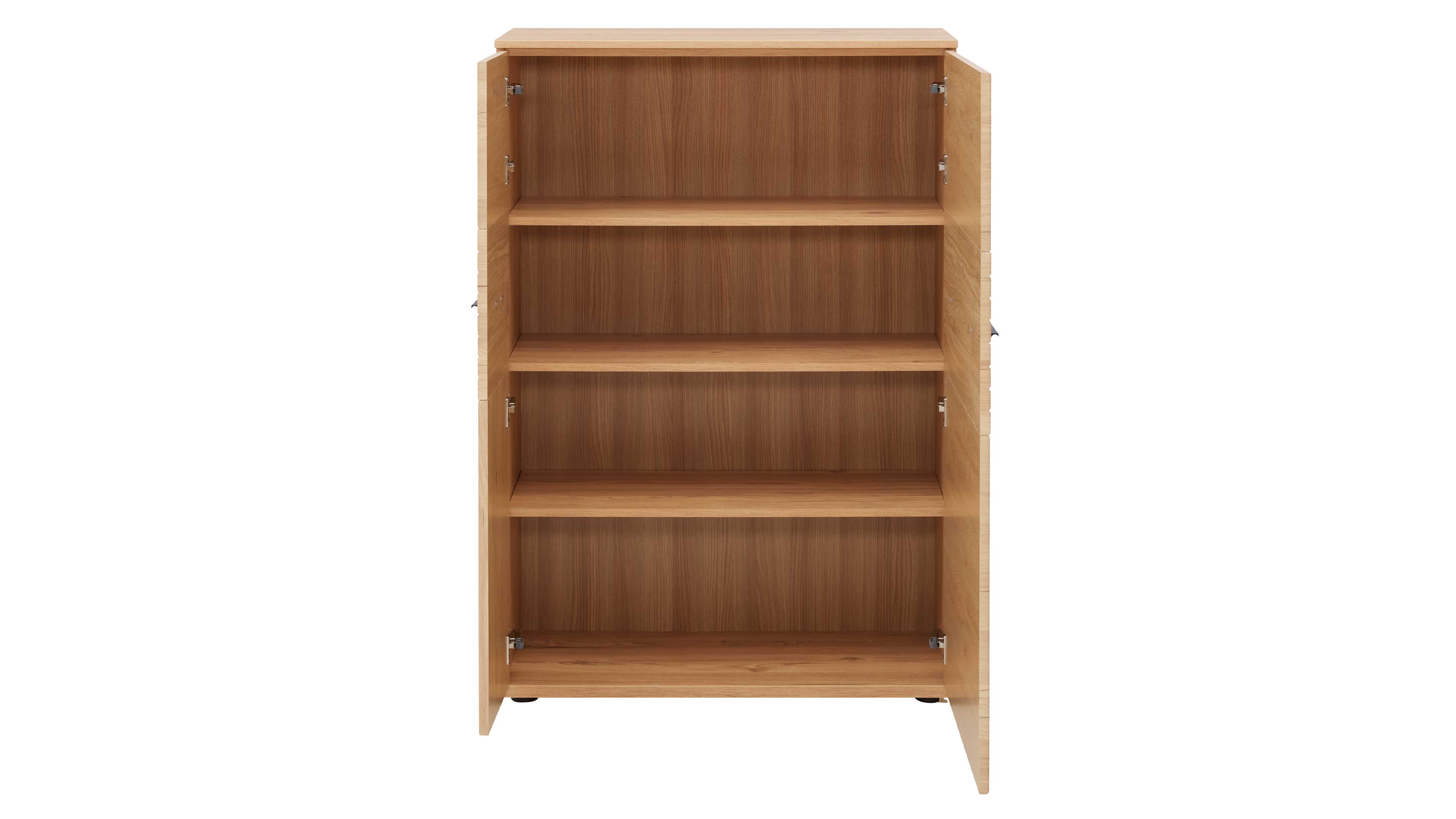 Hinter den zwei Türen verbergen sich drei höhenverstellbare Holzböden, die dir flexible Aufbewahrung für Geschirr, Bücher, Deko oder alltägliche Dinge ermöglichen. Durch das klare Design und die warme Holzoptik lässt sich das Highboard sowohl als Solitärmöbel als auch in Kombination mit anderen Möbeln der Serie ideal integrieren.