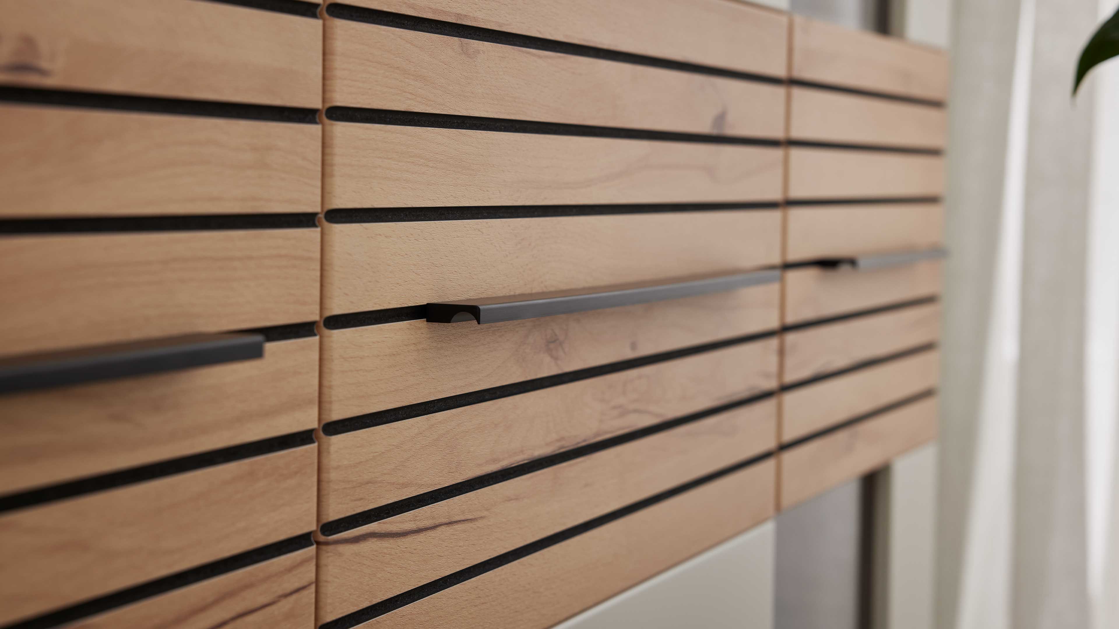 | Farbhinweis: | Sandbeige Balkenbuche Grau (getöntes Glas) Klarglas Schwarz (Griffe und Füße) |