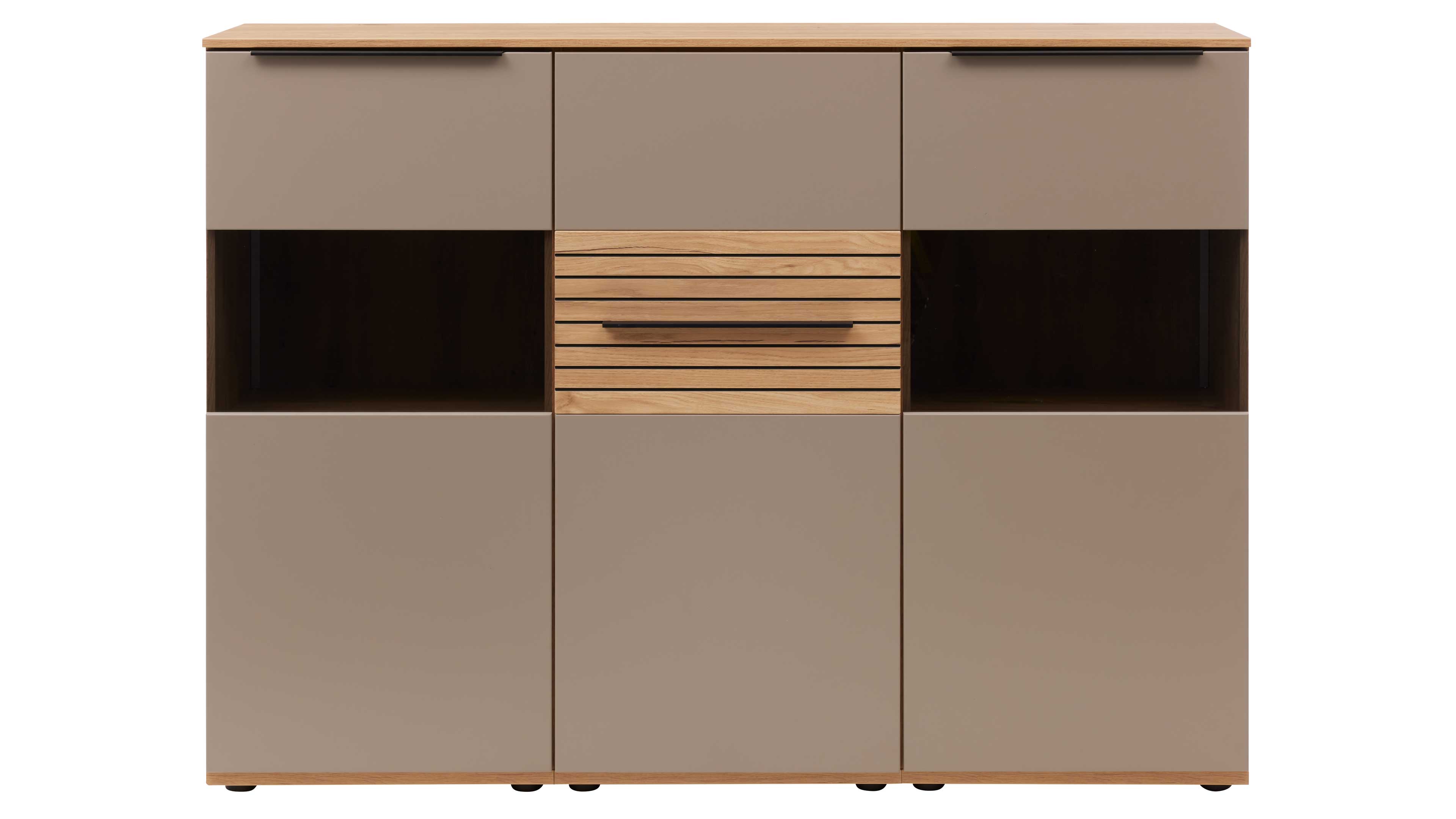 Mit ca. 180 x 131 x 40 cm (B/LxHxT) bietet das dreiteilige Highboard großzügigen Stauraum und eine klare, moderne Formsprache für dein Wohnzimmer.