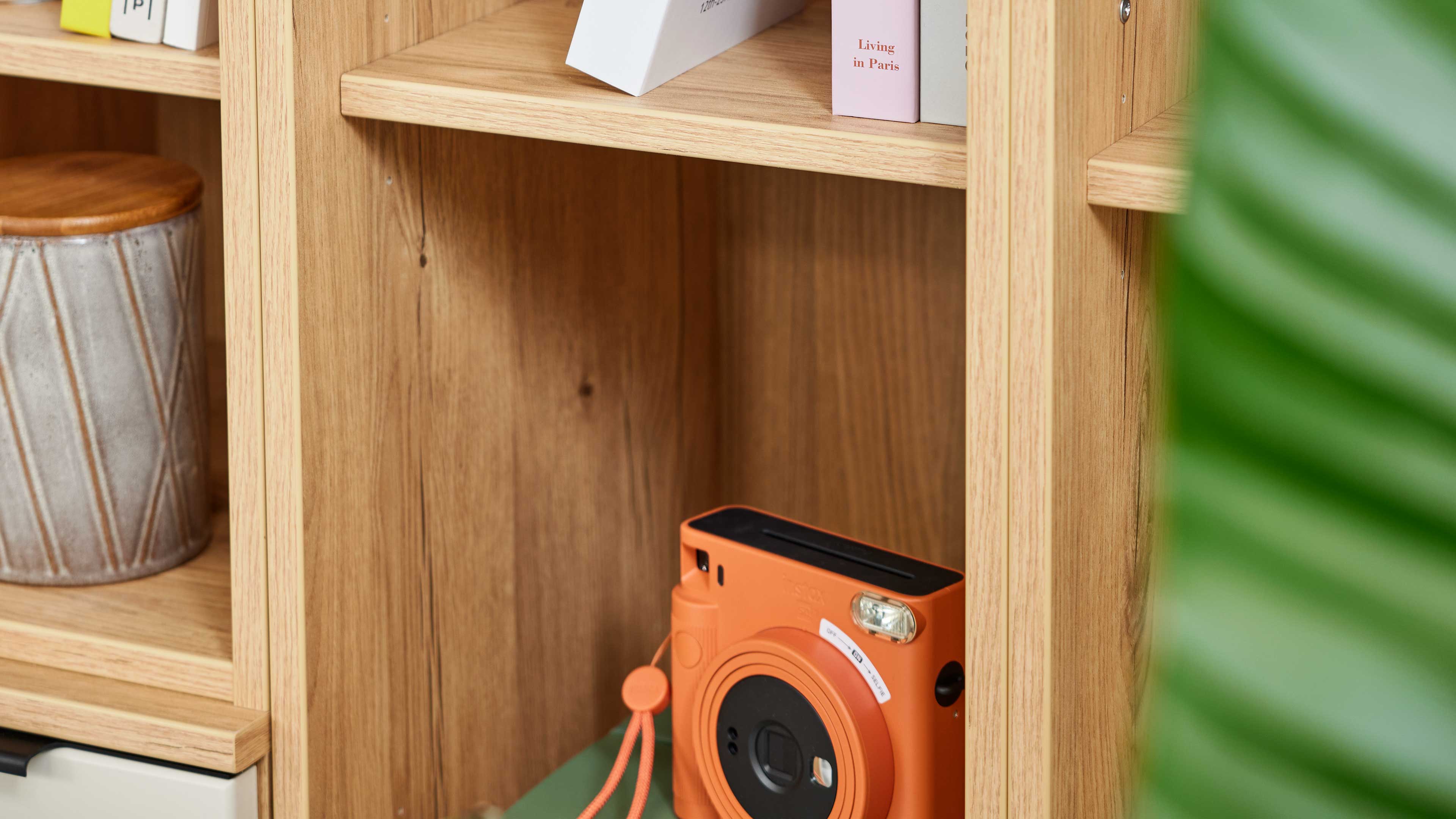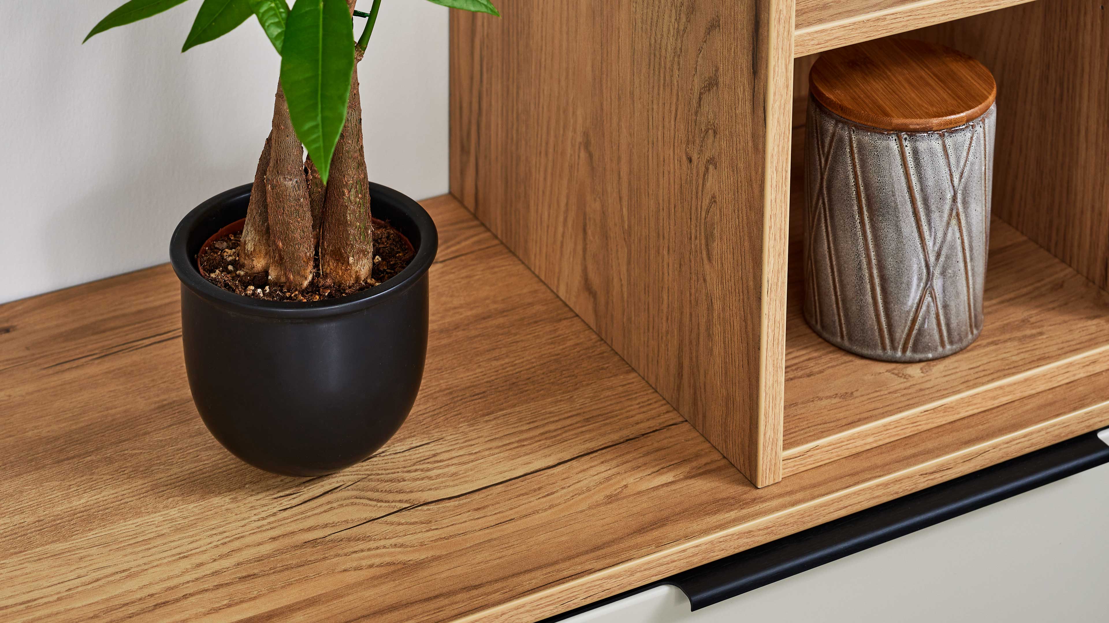 Die hoch kratzfesten, UV-beständigen und pflegeleichten Melaminharz-Oberflächen machen beide Möbel besonders alltagstauglich. Optional kannst du sie mit einer geschroppter Rückwand, zusätzlichen Frontplanken oder einer LED-Beleuchtung aufwerten. Auch Vitrinentüren aus grau getöntem Floatglas und Klarglasböden sind erhältlich. In der Regalkombination sorgen vierfach höhenverstellbare Holzeinlegeböden für maximale Flexibilität.