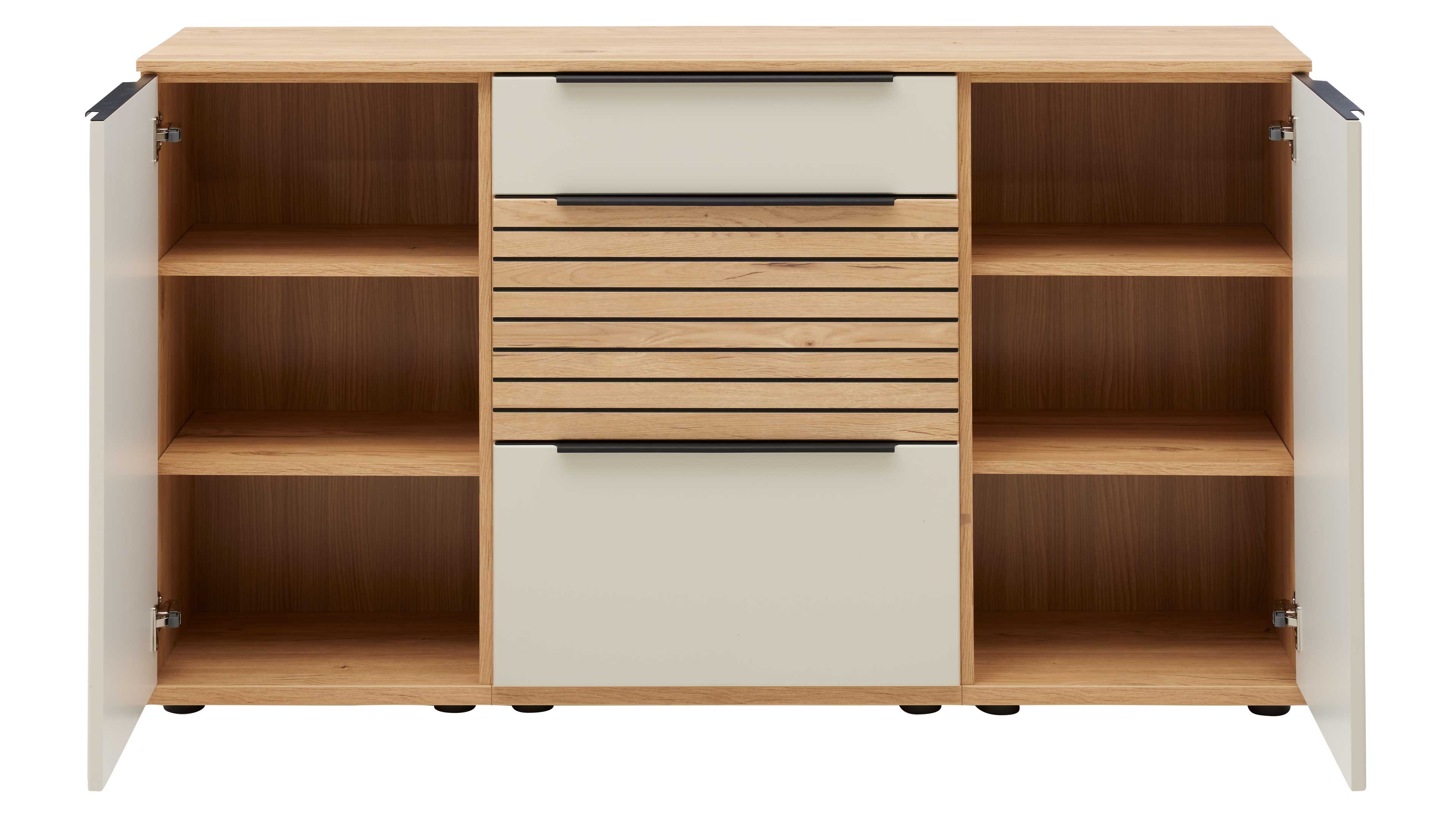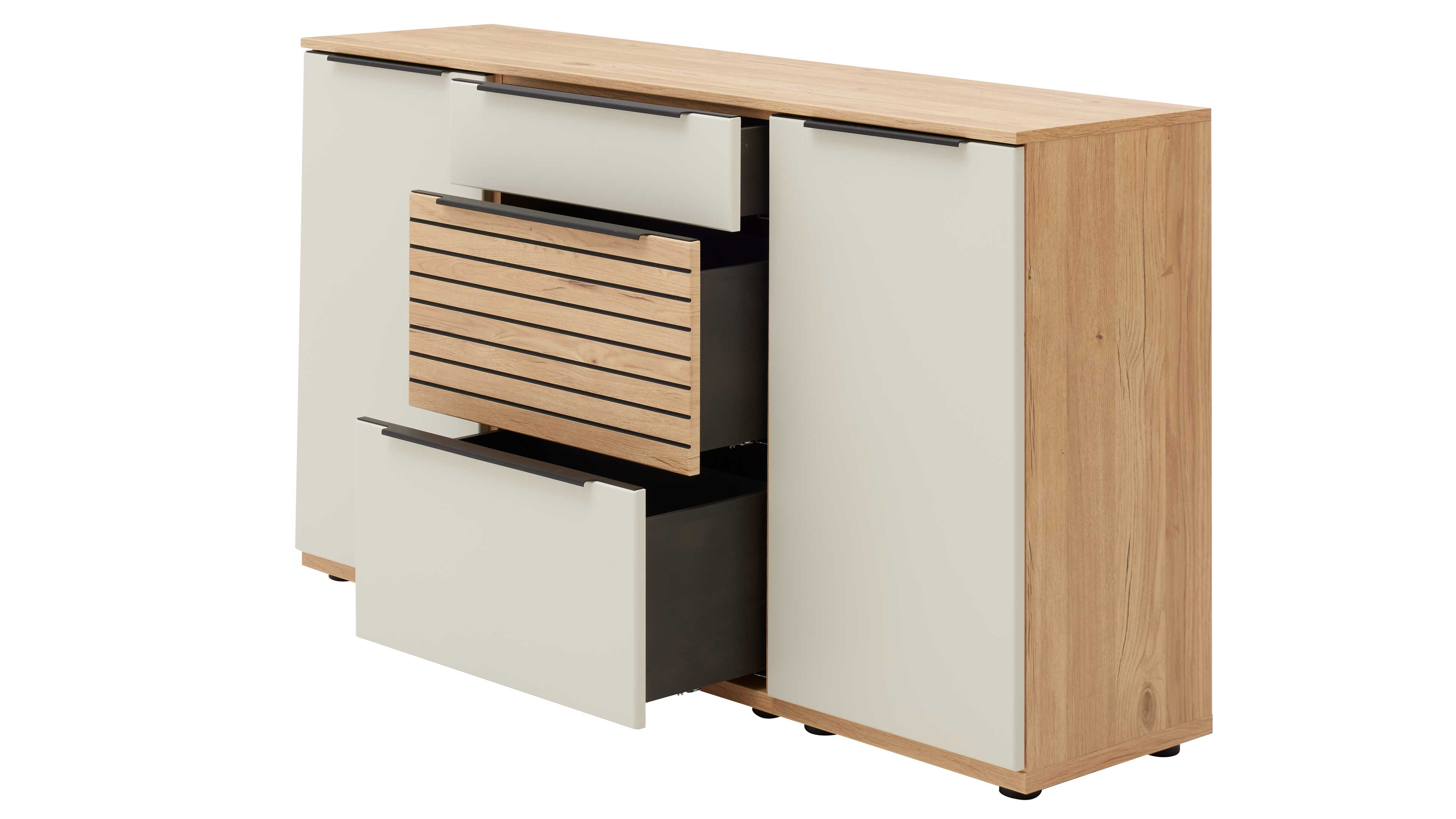 Das Sideboard mit ca. 150 x 85 x 40 cm (B/LxHxT) bietet Stauraum mit Struktur. Es besteht aus zwei Türen mit jeweils zwei höhenverstellbaren Holzböden sowie einem mittigen Schubladenelement mit drei leichtgängigen Schubladen inklusive Softauszug. Türen mit Schließdämpfung, robuste Melaminharz-Oberflächen und vormontierte Korpusse sorgen für langlebige Qualität und komfortable Handhabung. Die Kombination aus Korpus, Deckblatt und Frontplanke in Risseiche Nachbildung und Fronten in Matt-Sandbeige rundet das elegante Gesamtbild ab.